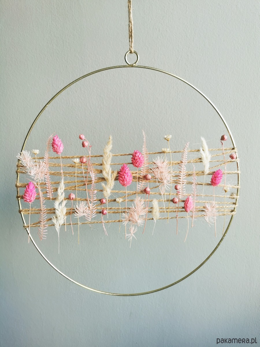 Nowoczesna forma wianka na złotej obręczy. Wykonany na sznurku jutowym z suszonymi roślinami w różowym kolorze. Głównym elementem wianka jest suszony phalaris (kanar) oraz asparagus. Wianek można powiesić jako dekoracja drzwi, okna lub na ścianie na przykład nad komodą. Nada wnętrzu charakteru.