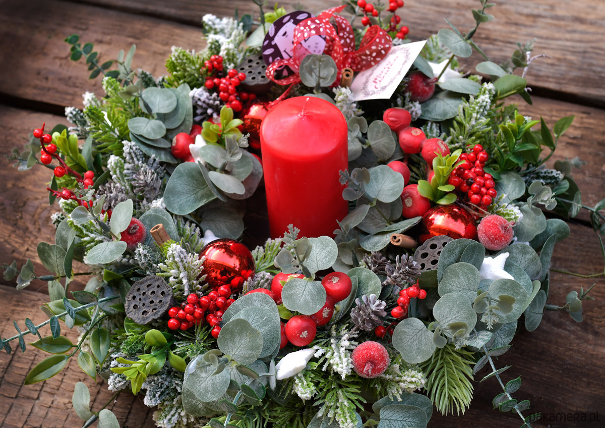 Dużo czerwieni i zielonego mchu w dodatkach , z prószonymi śniegiem brzegami.W komplecie piękna czerwona świeca o szklano gładkiej powierzchni:)