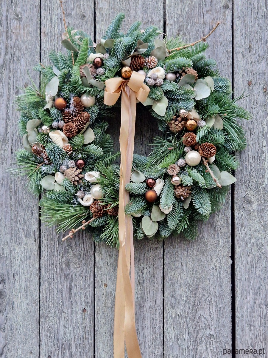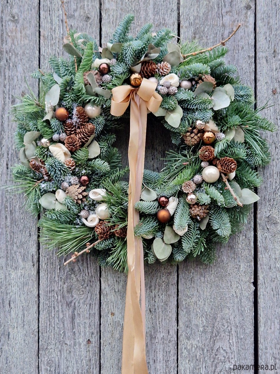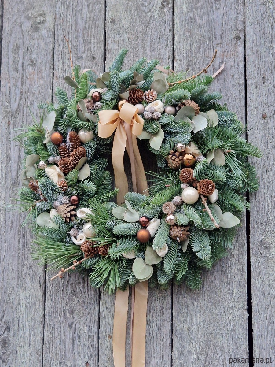 Prezentowany wianek wykonany jest z trałych, naturalnych gałązek jodły, sosny i eukaliptusa.