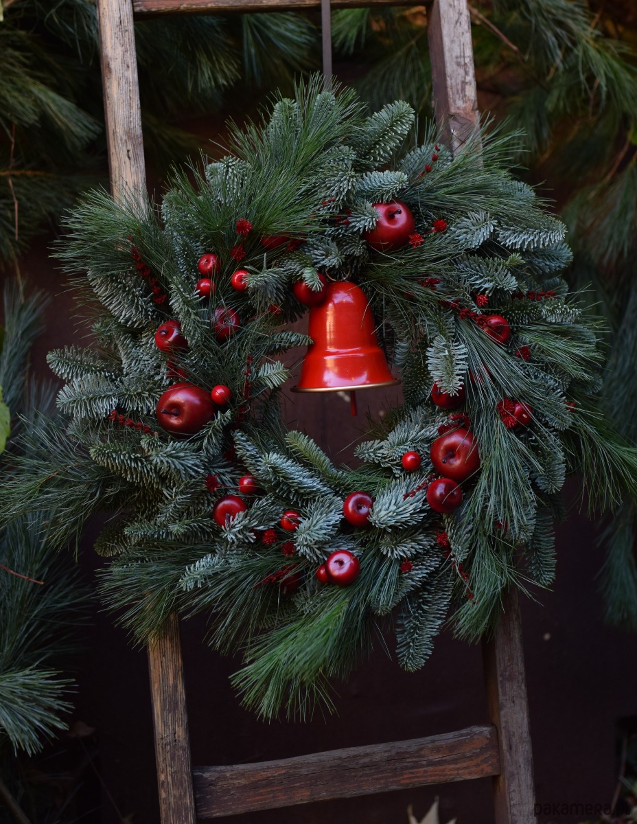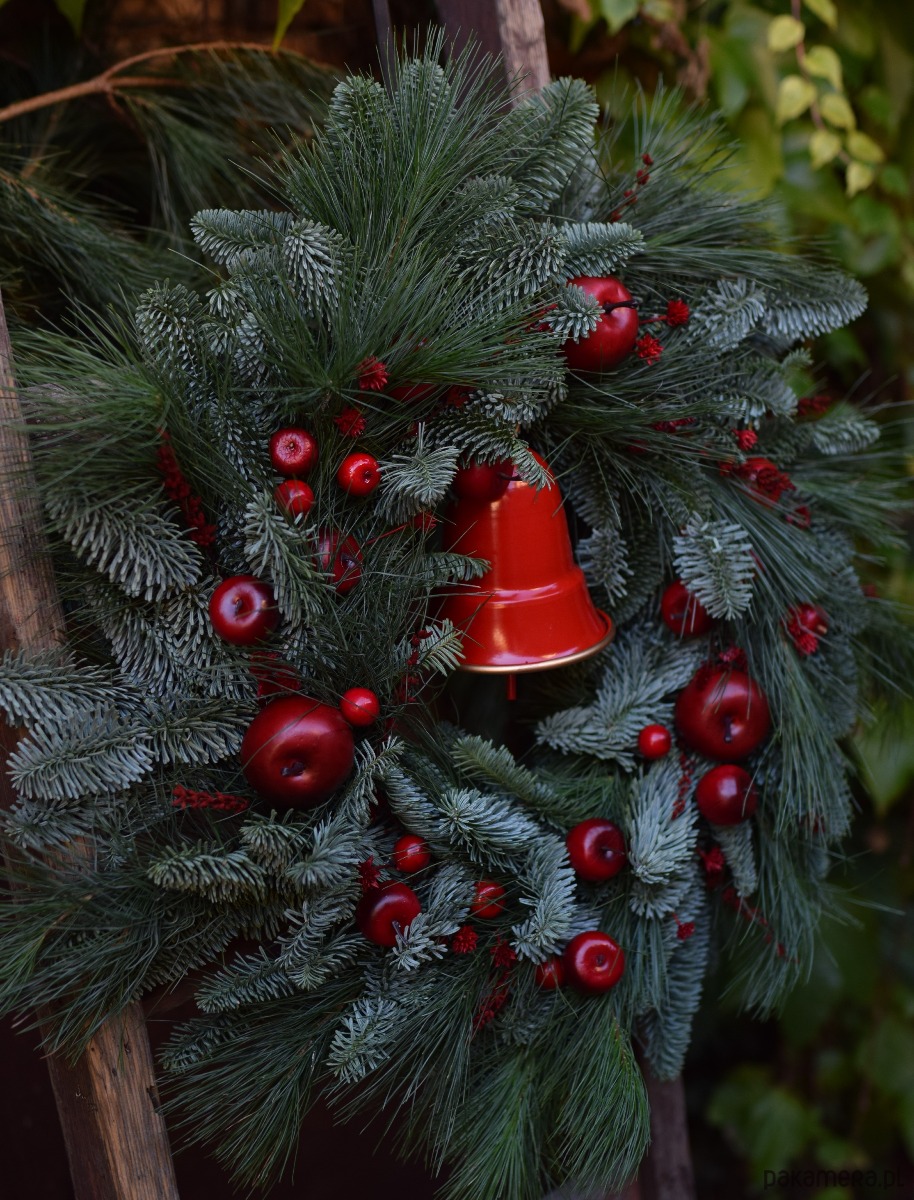 Każdy wianek wyplatam ręcznie na słomianym podkładzie. Wykonany jest z żywych gałązek, między innymi są to gałązki jodły Nobilis. Gałązki ładnie się zasuszą ( nie obsypują się ) i taki wianek będzie piękną ozdobą przez cały zimowy czas. Do dekoracji zostały użyte naturalne ozdoby, piękna aksamitna wstążka i sztuczne jabłuszka w odcieniach czerwieni.
