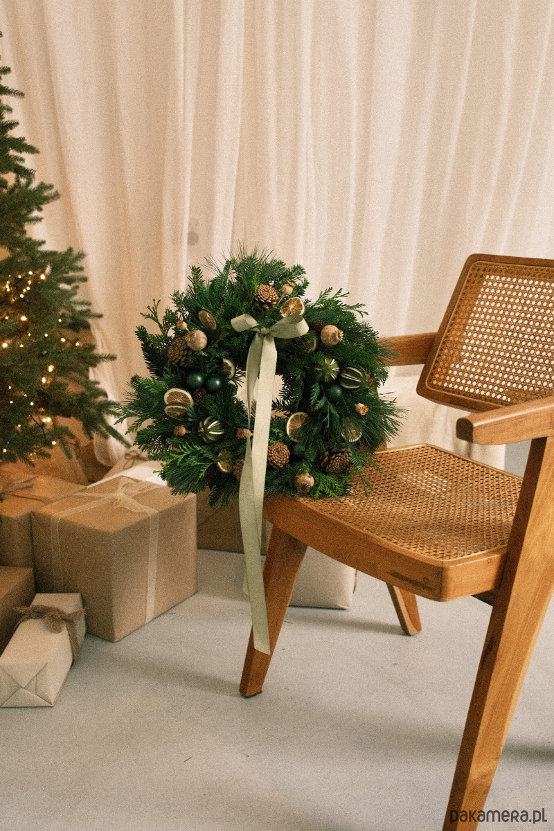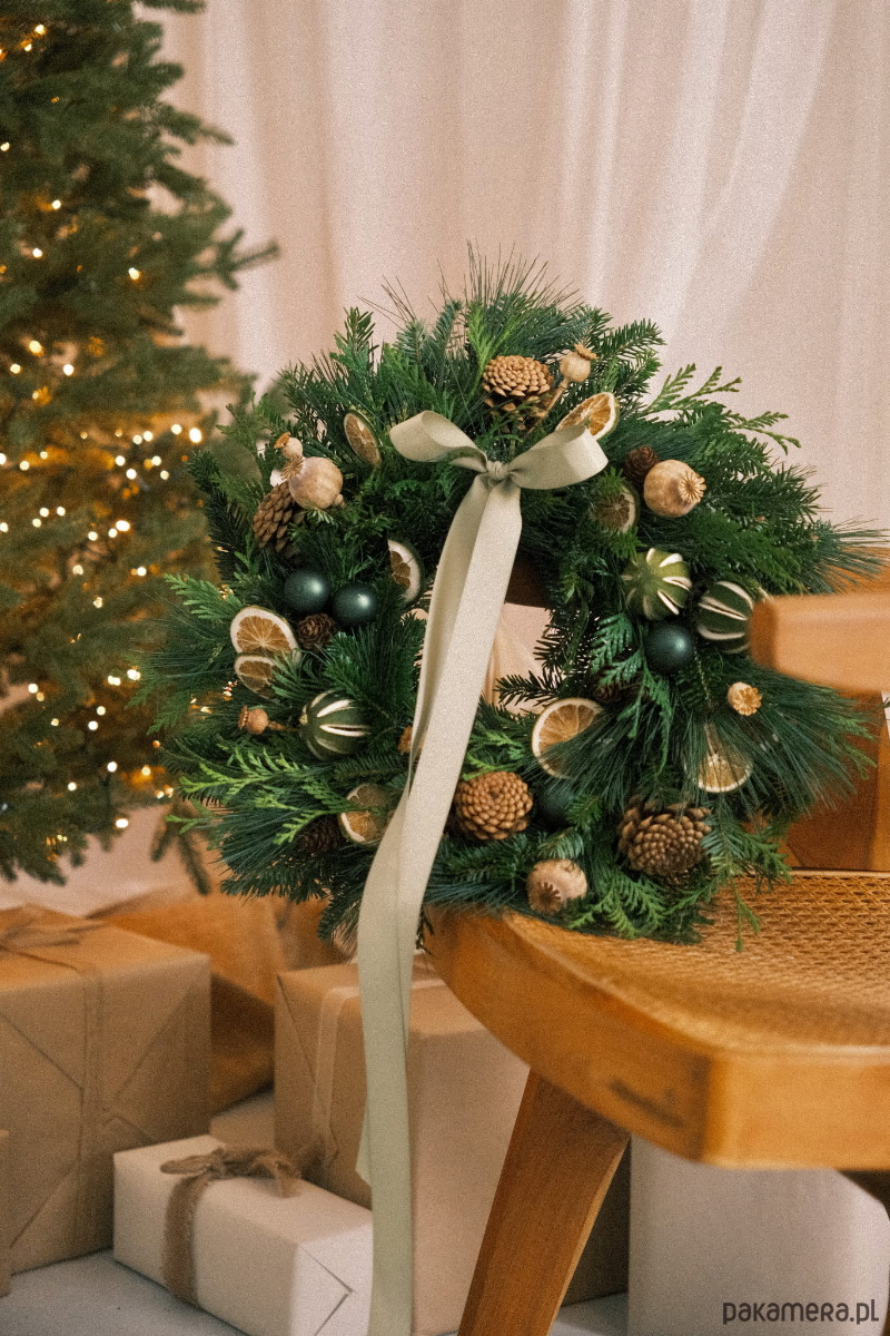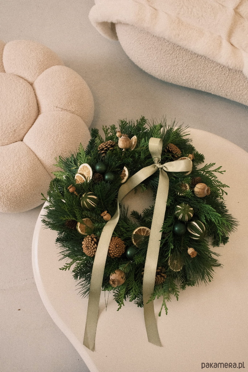 Wianek został wykonany ręcznie z żywej jodły kaukaskiej, znanej z tego, że długo zachowuje świeżość i nie osypuje się tak szybko jak tradycyjny świerk. Uzupełniają ją gałązki tui i sosny, dzięki czemu całość jest gęsta, miękka i pachnie jak prawdziwy las. Dekorację tworzą zielone bombki, suszone plastry cytrusów, liczne szyszki oraz naturalne suszone rośliny (m.in. makówki), które dodają wiankowi struktury i ciepłego, przytulnego charakteru. Całość dopełniają długie wstążki w odcieniu szałwiowej zieleni, subtelnie podkreślające naturalny styl.