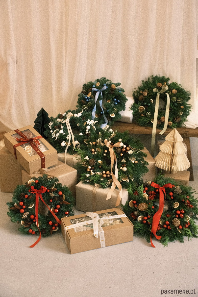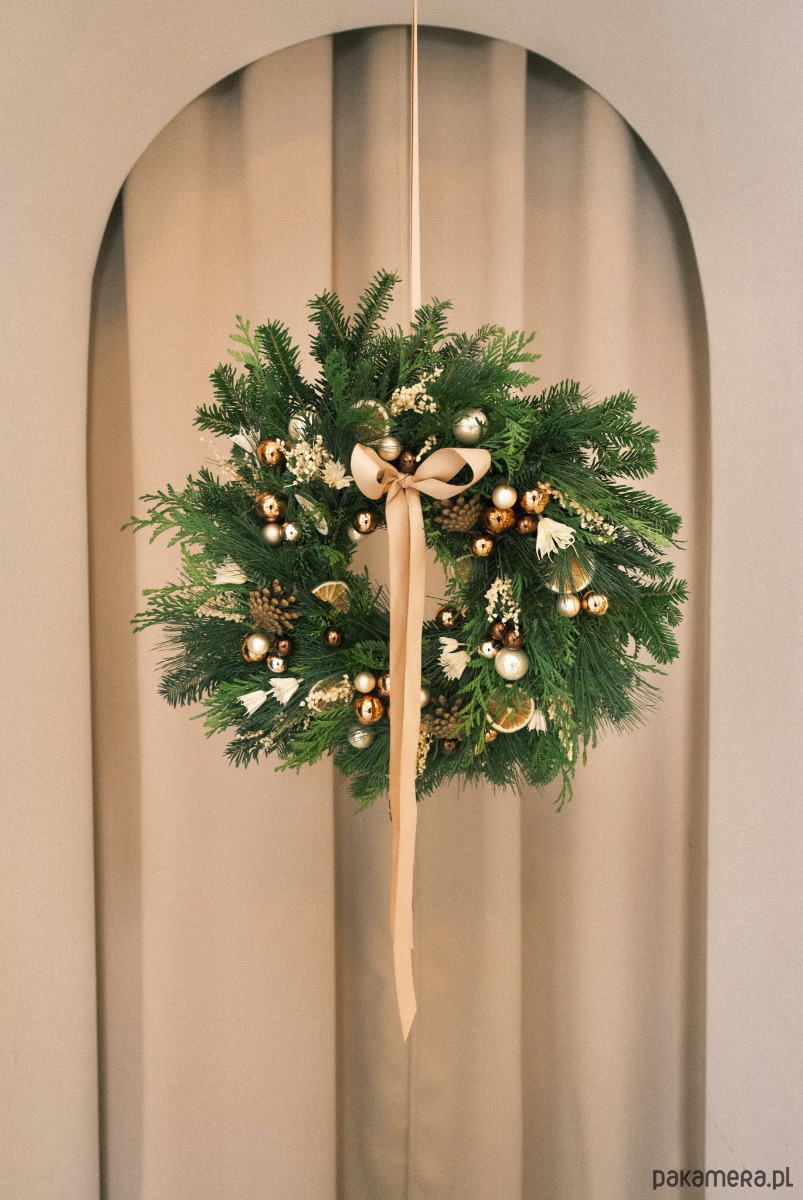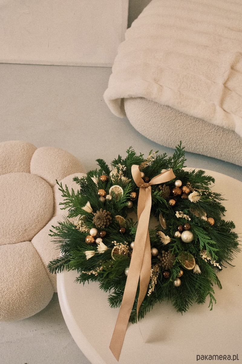 Każdy wianek tworzony jest własnoręcznie z żywej jodły kaukaskiej, która długo zachowuje świeżość i nie będzie się szybko osypywać. Do tego dołożone zostały gałązki tui i sosny - dzięki temu kompozycja jest gęsta, miękka i pięknie pachnie lasem. „Brilla” zdobią bombki w odcieniach złota i szampana, i eleganckiego brązu, naturalne szyszki, suszone plastry cytrusów oraz suszone rośliny, które dodają mu lekkości. Całość dopełnia beżowa wstążką - to detal, który sprawia, że wianek wygląda jak dekoracja z butikowego hotelu.