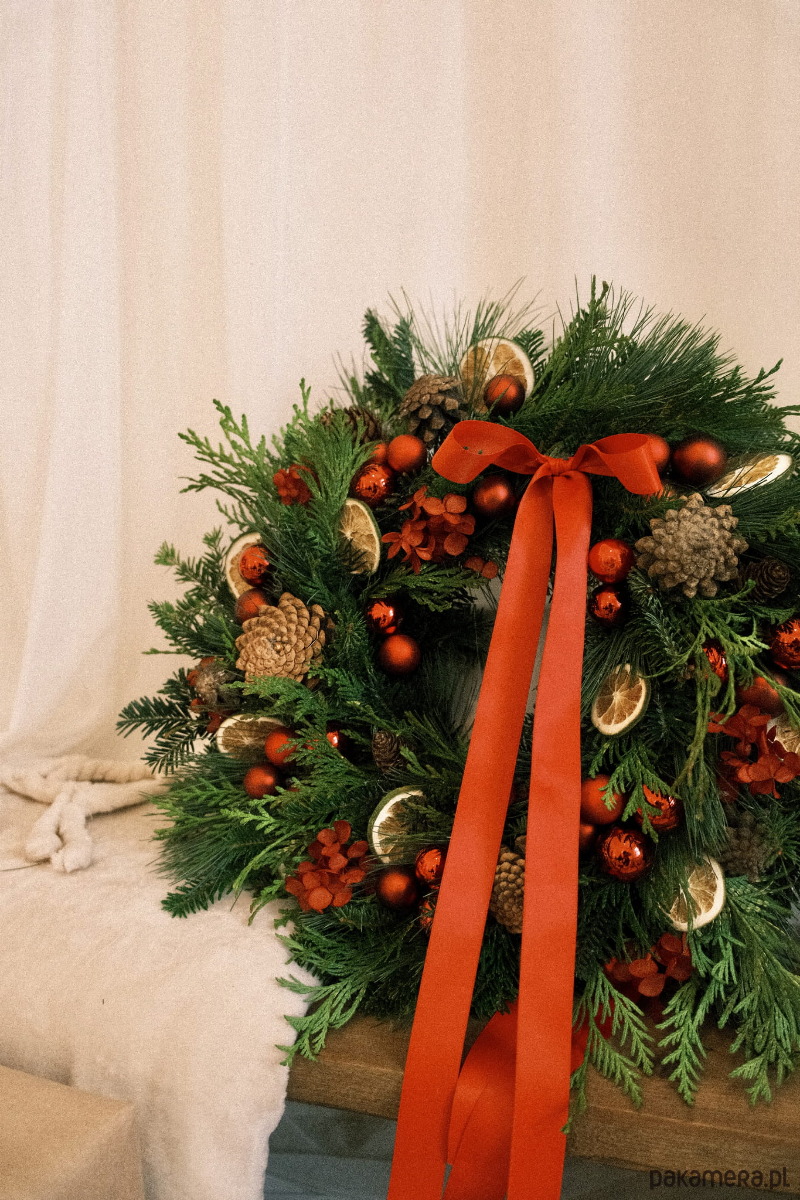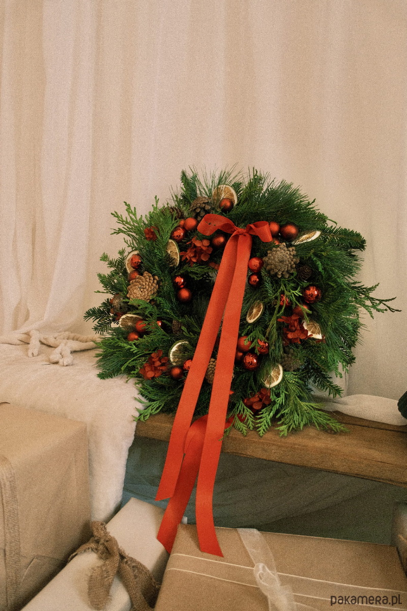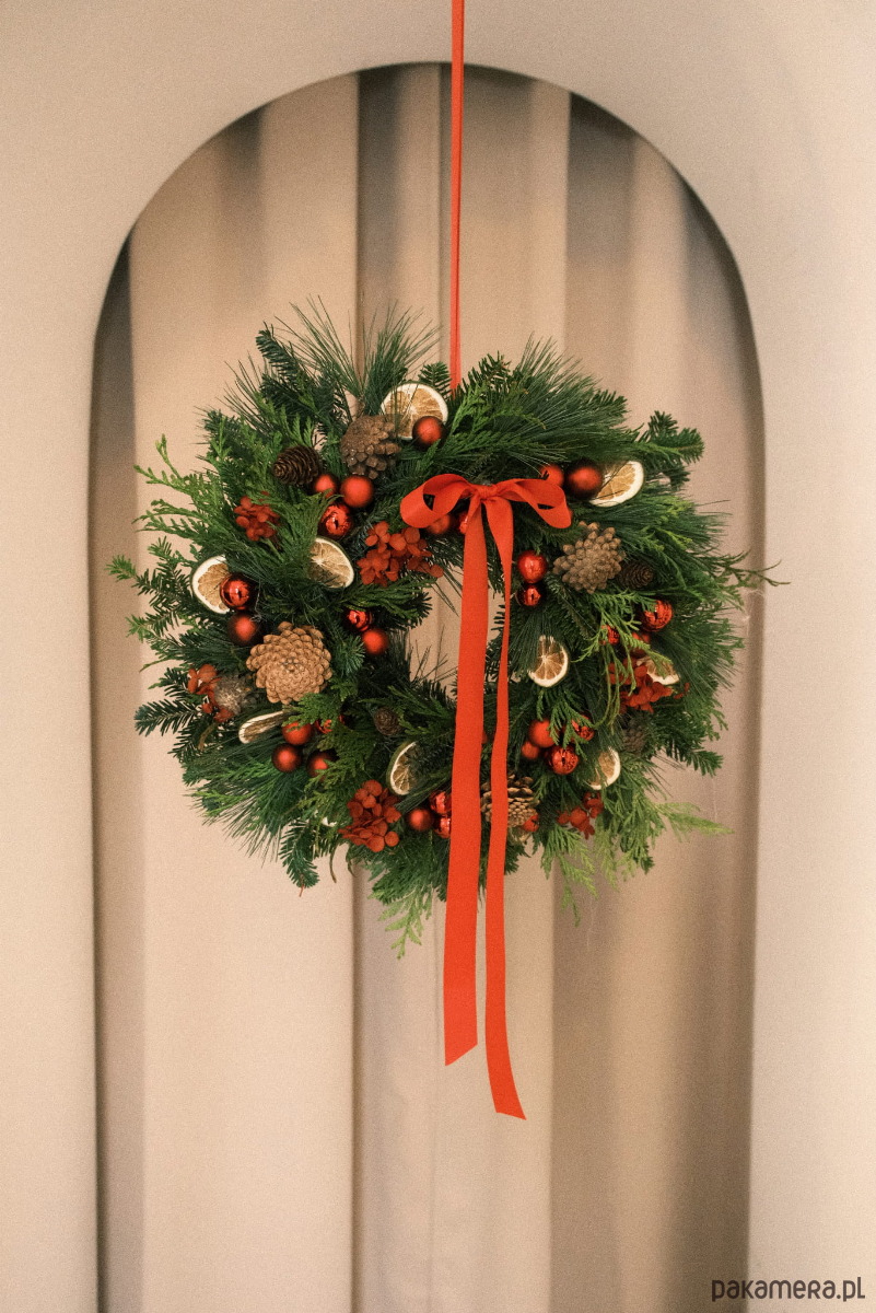 Wianek wykonany własnoręcznie z żywej jodły kaukaskiej, która słynie z tego, że długo zachowuje igły i nie osypuje się tak szybko jak tradycyjny świerk. Dopełniony gałązkami tui i sosny, dzięki czemu kompozycja jest gęsta, trójwymiarowa i pięknie pachnie. Całość zdobią czerwone bombki, szyszki, suszone plastry cytrusów oraz długa, miękka wstążka w głębokiej czerwieni - klasyka świątecznej elegancji.