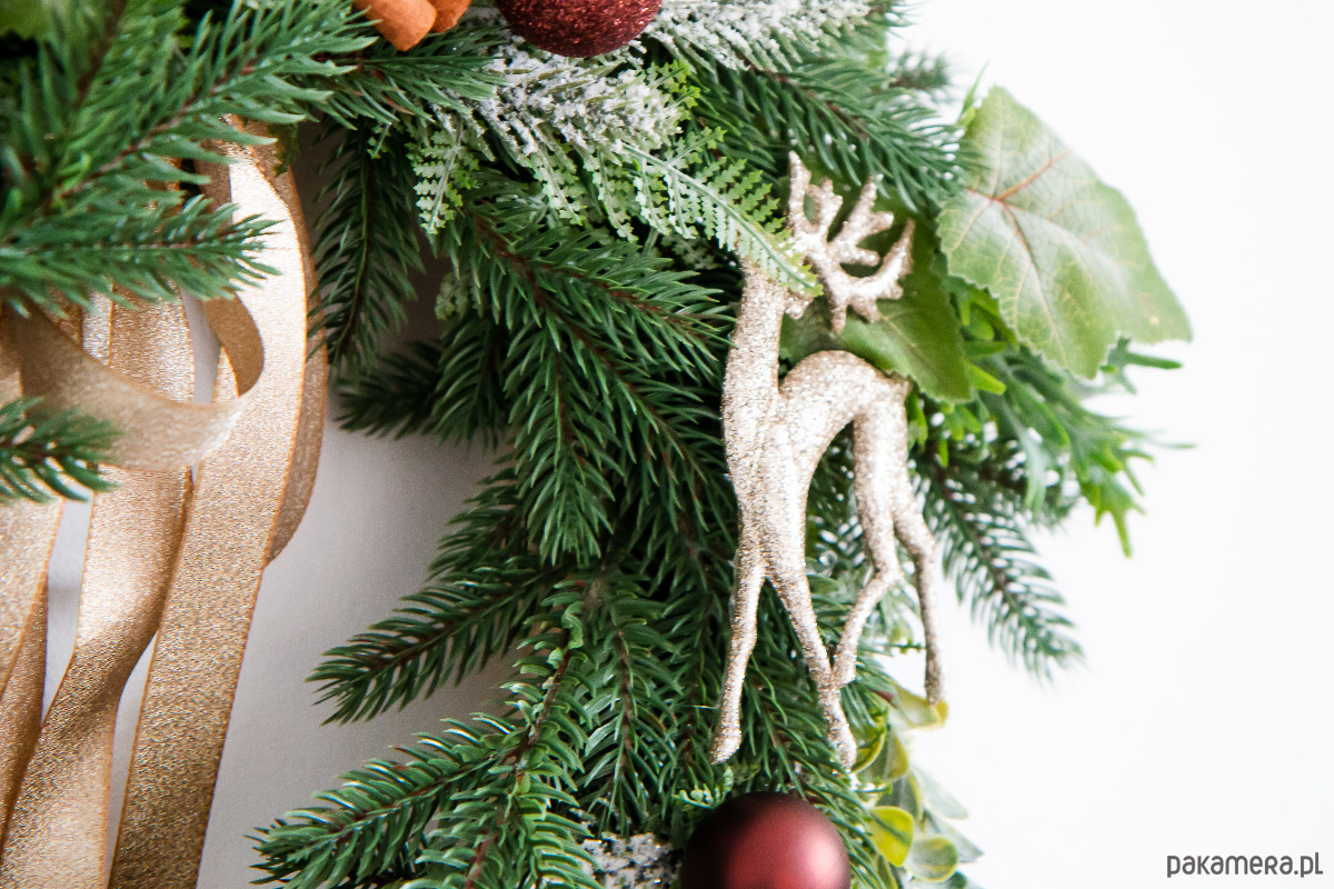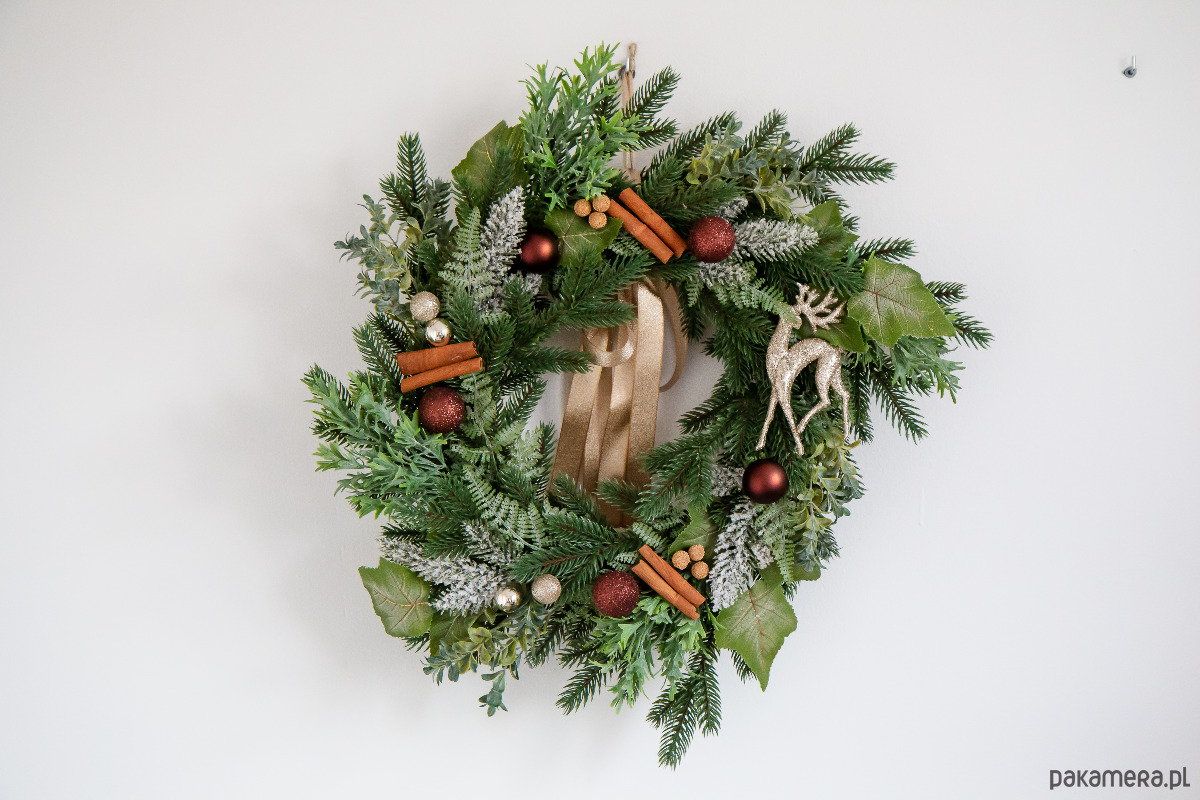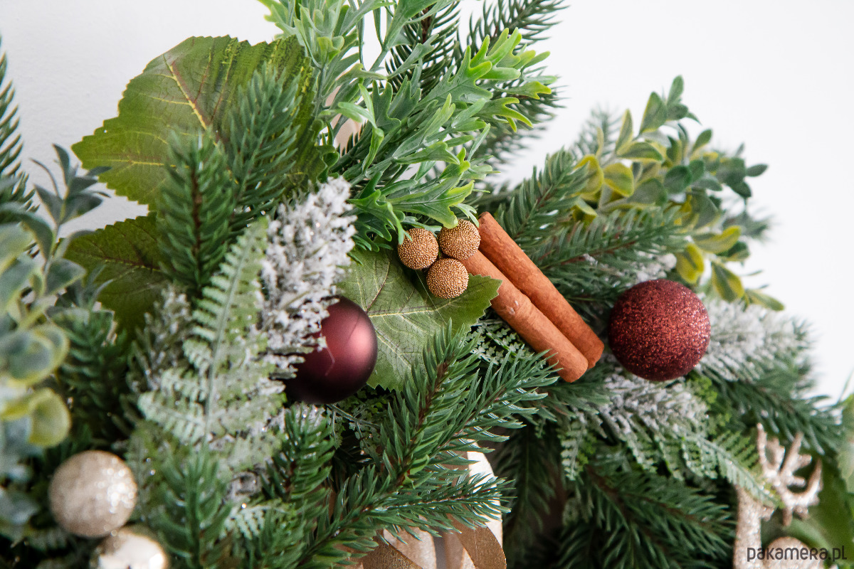 Wianek świąteczny z wysokiej jakości sztucznych gałązek, lasek cynamonu i i bombek w kolorze złotym i brązowym. Ma też złotą wstążkę do powieszenia. Będzie pięknie prezentował się wewnątrz domu na ścianie lub nad kominkiem jak również na drzwiach na zewnątrz. Kolory mają charakter naturalny i delikatny. Wianek na pewno będzie świetną wieloletnią dekoracją. Średnica wianka to ok 50 cm.