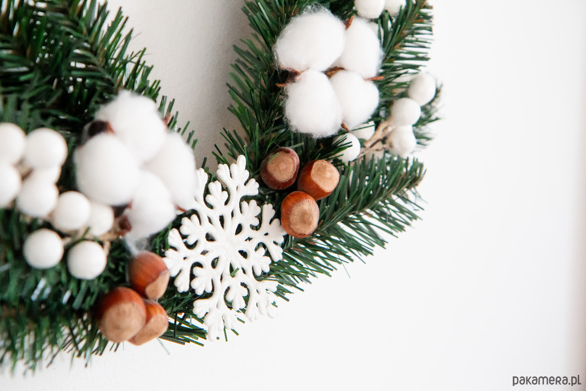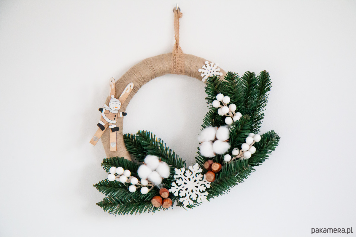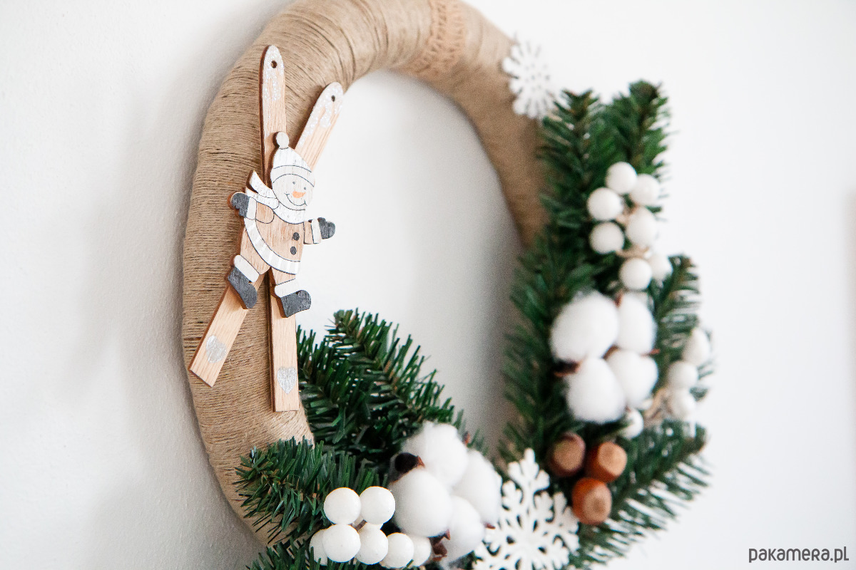Wianek ze sztucznymi gałązkami, białymi owocami głogu, bawełną i drewnianymi elementami. Konstrukcja składa się z owiniętego sznurka jutowego dzięki któremu nabrał on niebanalnego charakteru. Wianek jest świetnym elementem do t dekoracji domu, który można wykorzystać przez wiele lat. Średnica wianka to ok 31 cm