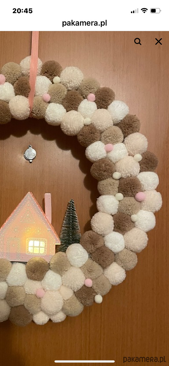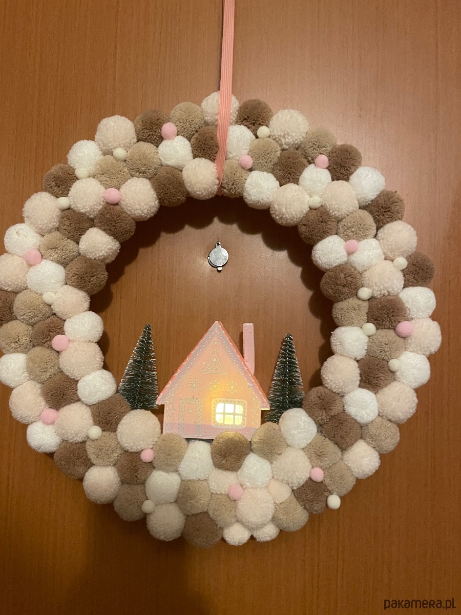 Wianek z pomponów w odcieniach beżu plus urokliwy domek