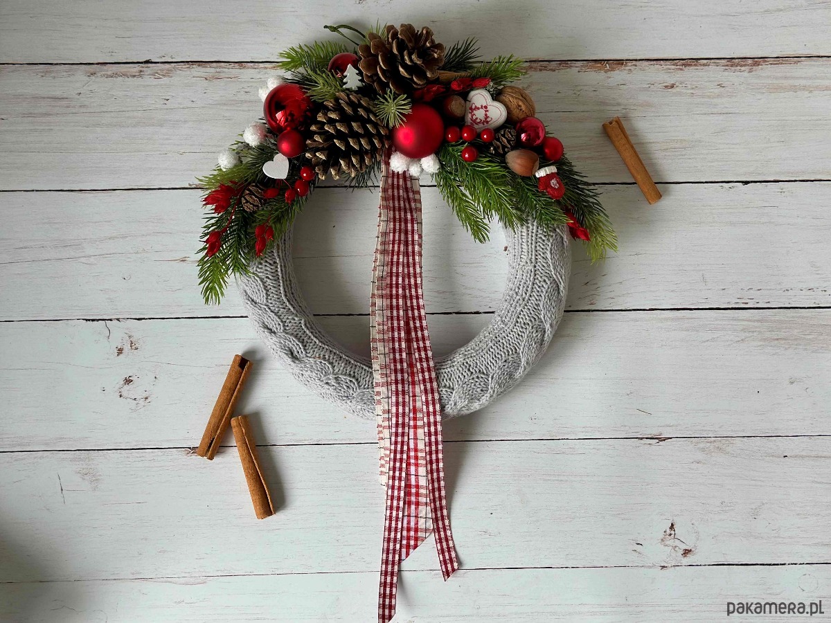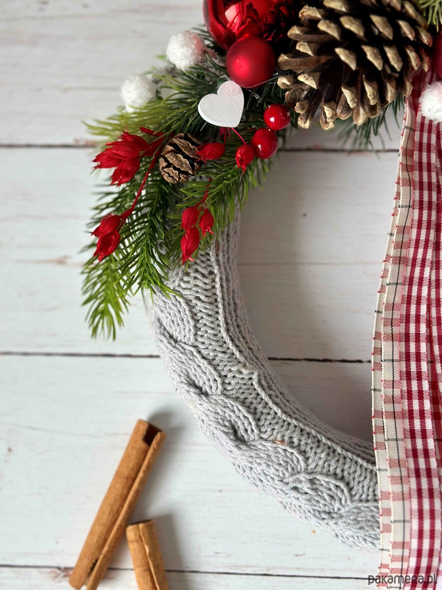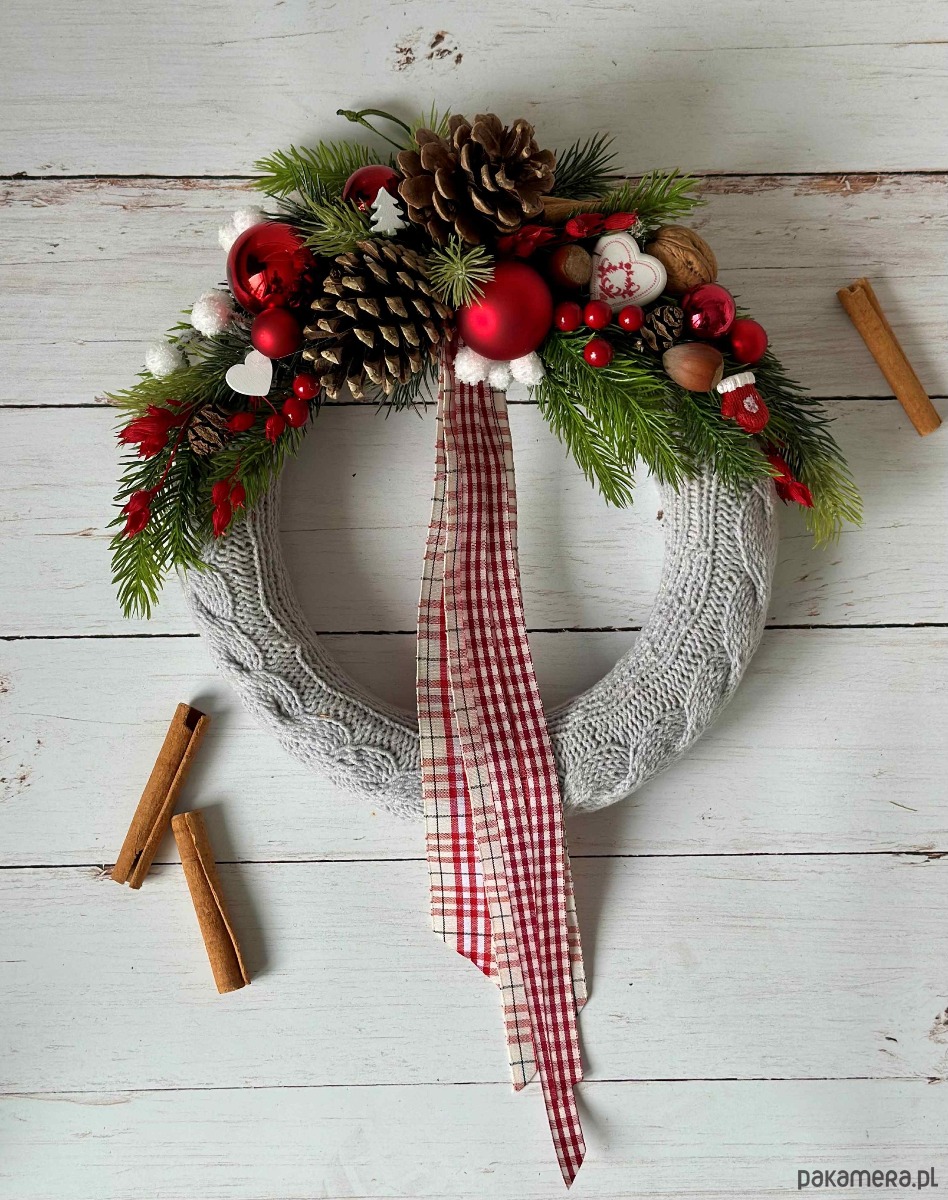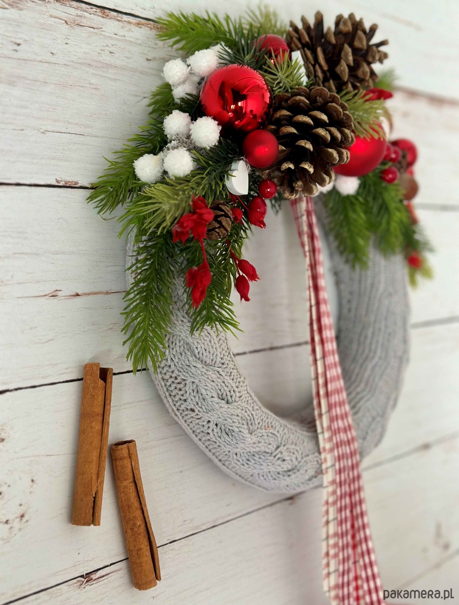 Wianek świąteczny w szarym sweterku, wianek z zimową dekoracją