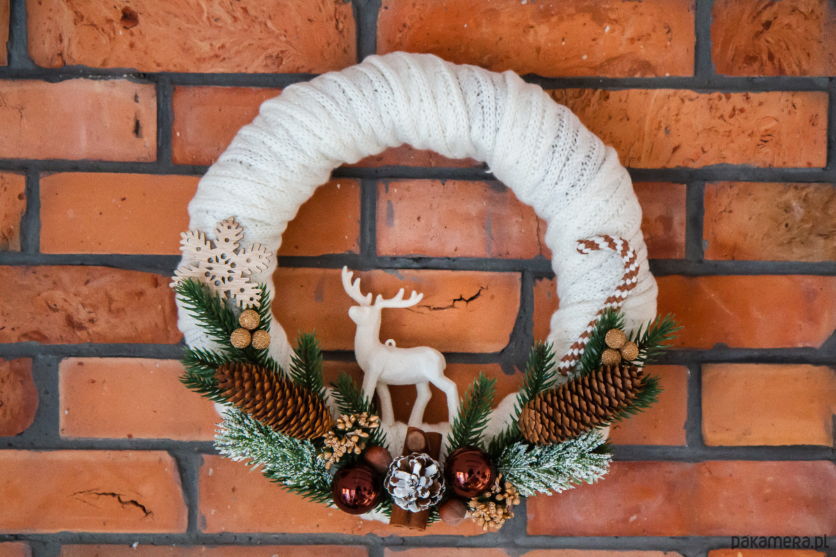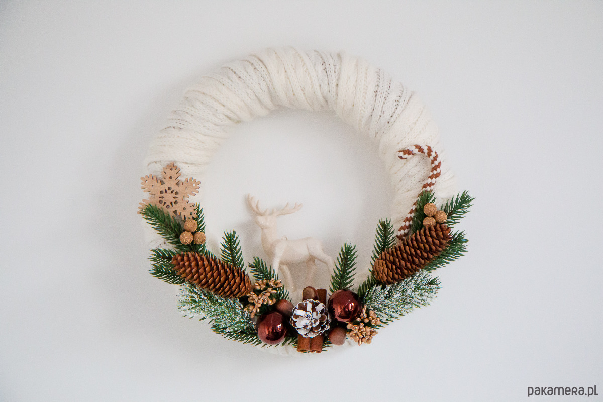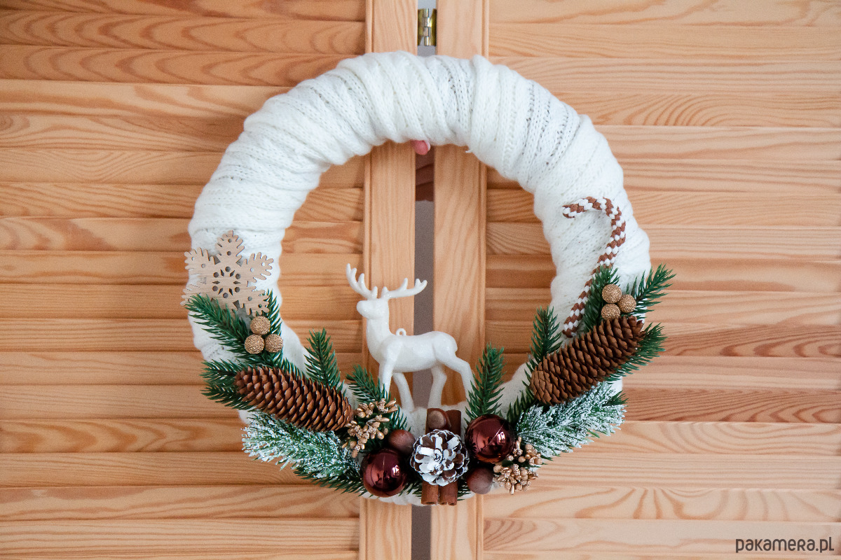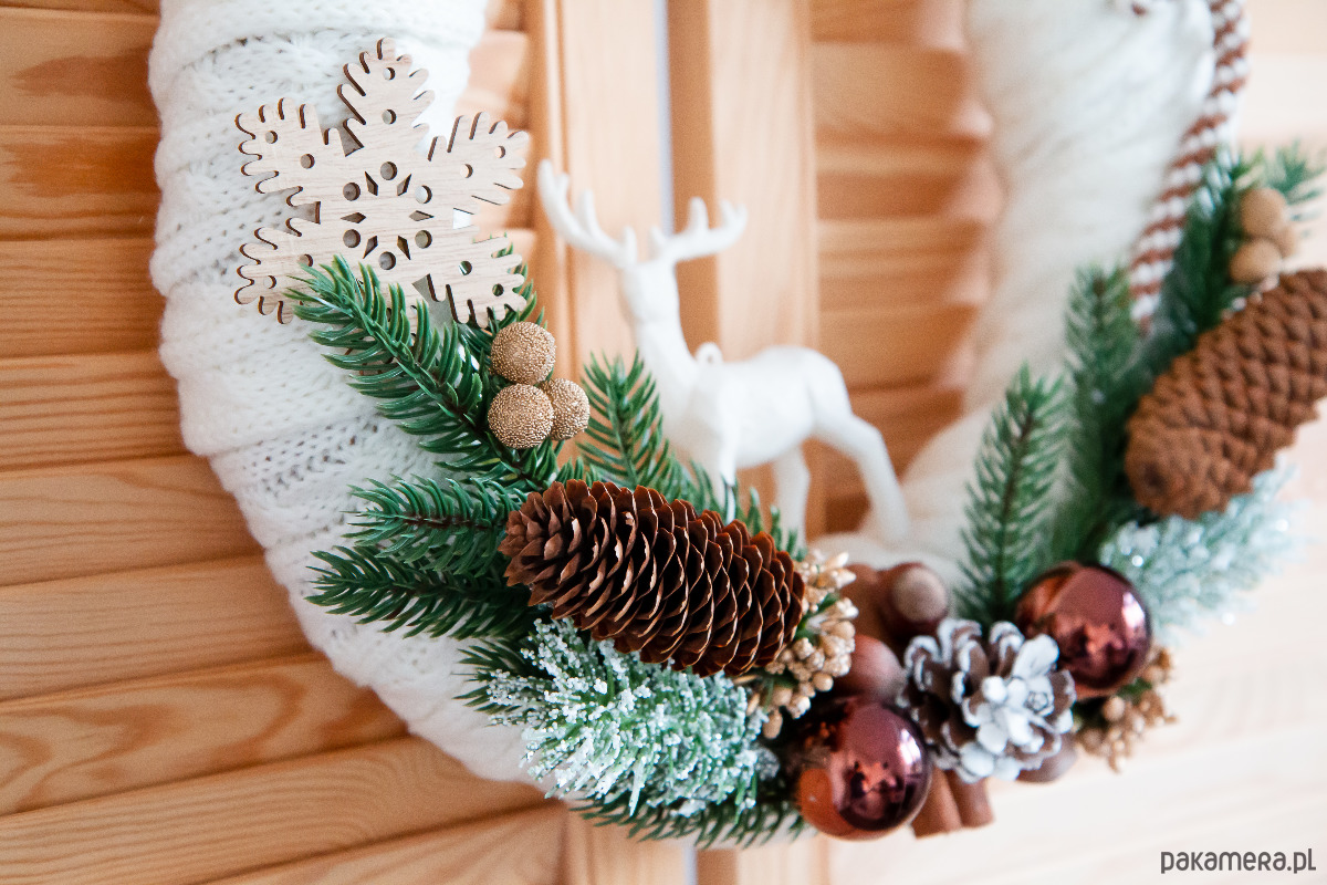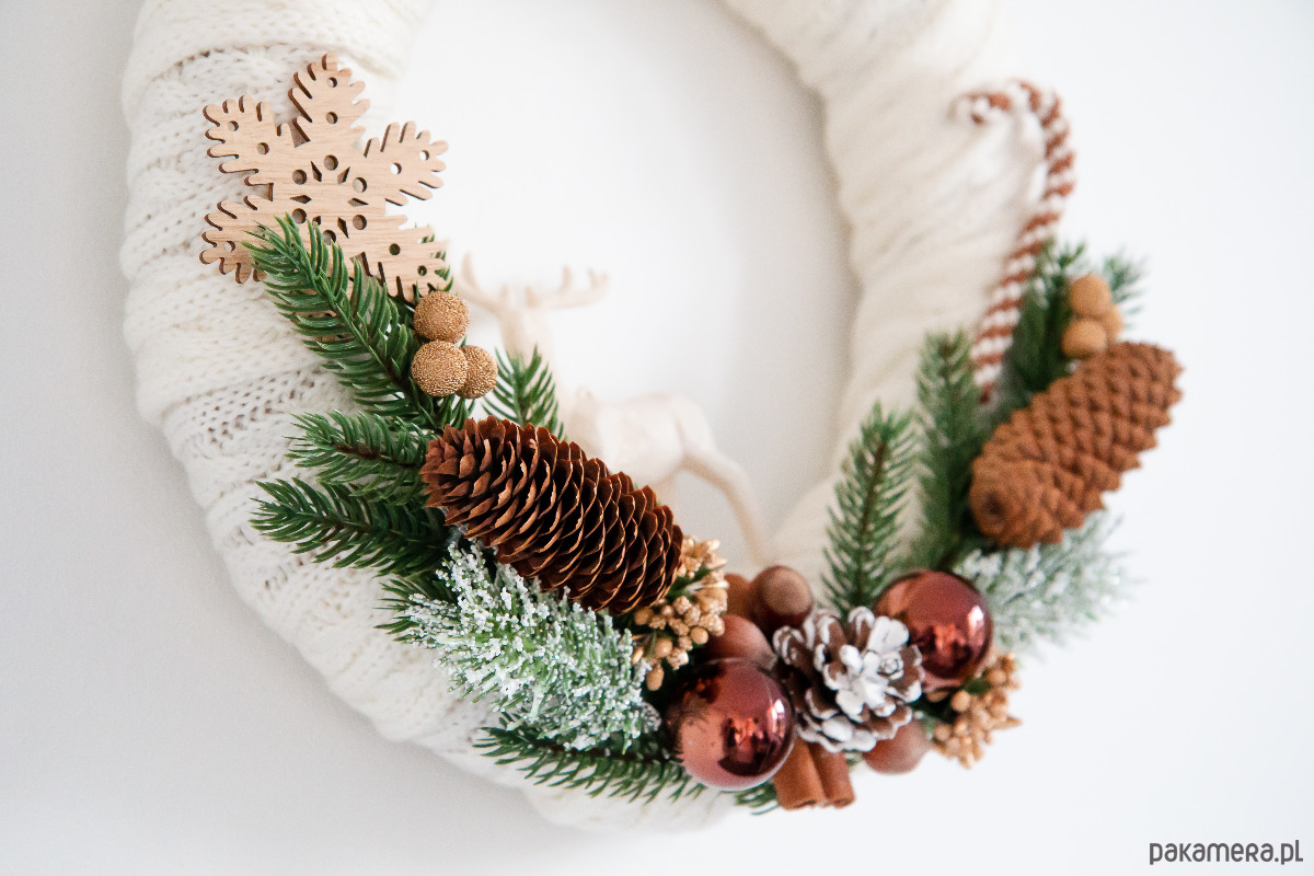 Wianek w kremowym sweterku ze świetnej jakości choinkowymi gałązkami. Dodatkami są elementy drewniane, naturalne szyszki oraz ręcznie wypleciona metodą makramy laska / lizak. Średnica wianka to ok 35 cm. Wianek świetnie będzie się prezentował na ścianie lub drzwiach wewnątrz domu. Doda ona wnętrzu ciepła jak i akcentu świątecznego w naturalnych kolorach. Dodatkowo ma już wstążkę dzięki której można go powiesić. Taka dekoracja na pewno będzie elementem corocznego ozdabiania domu na święta.
