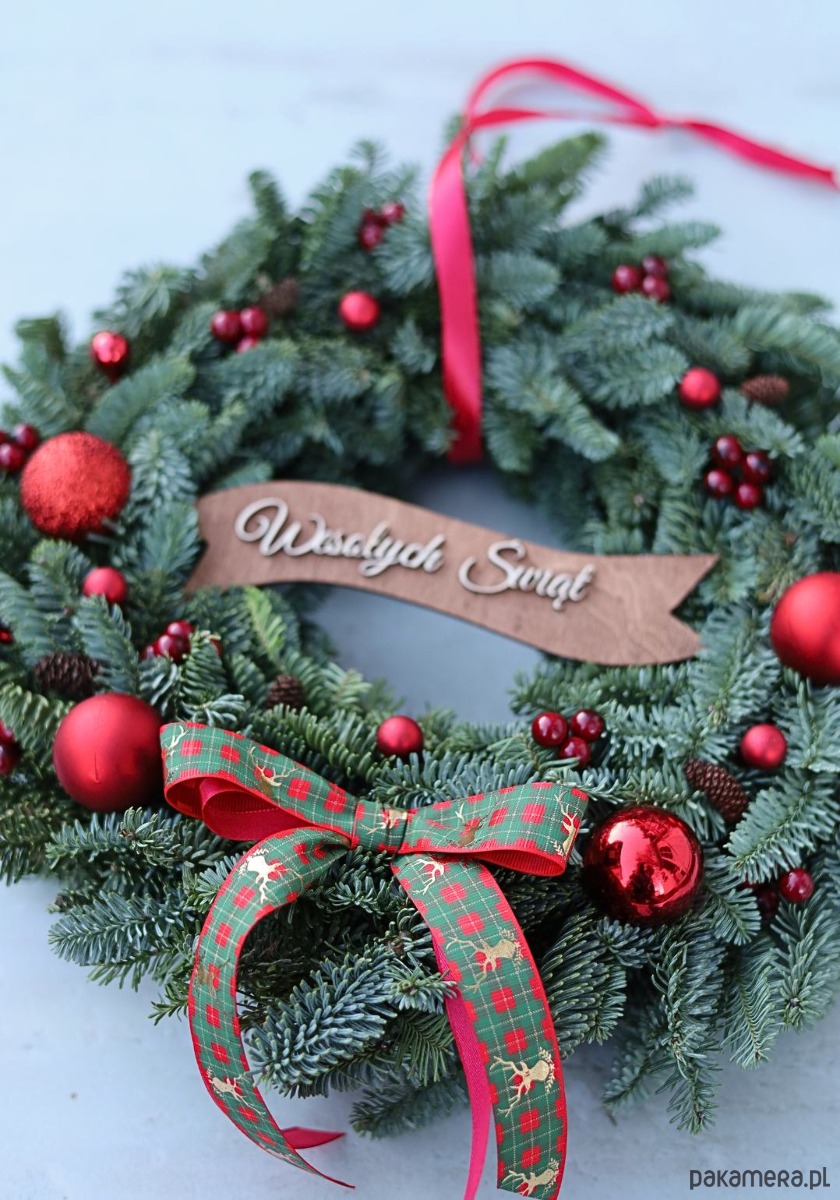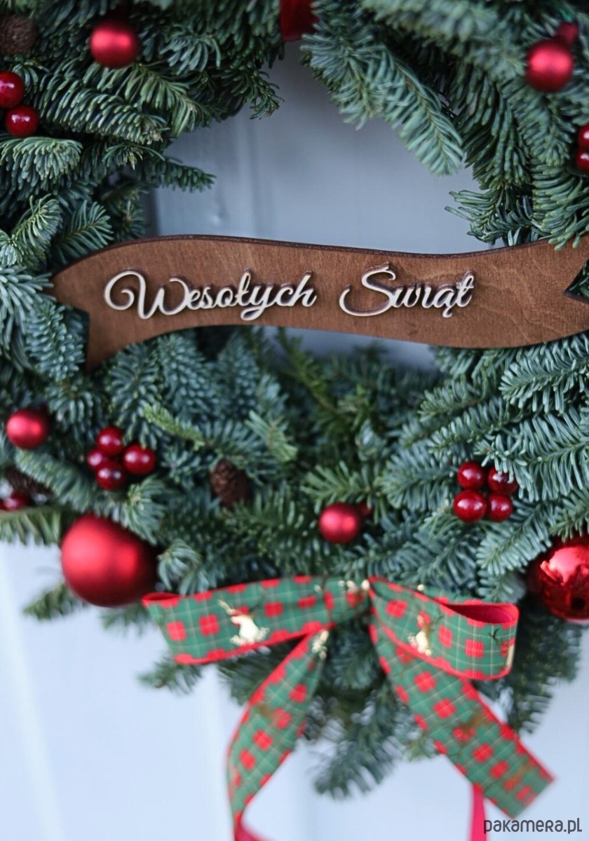 Na środku znajduje się drewniana wstążka z napisem „Wesołych Świąt”, a całość wykończona jest elegancką wstążką w zielono-czerwoną kratę, dodającą uroku i przytulnego akcentu.