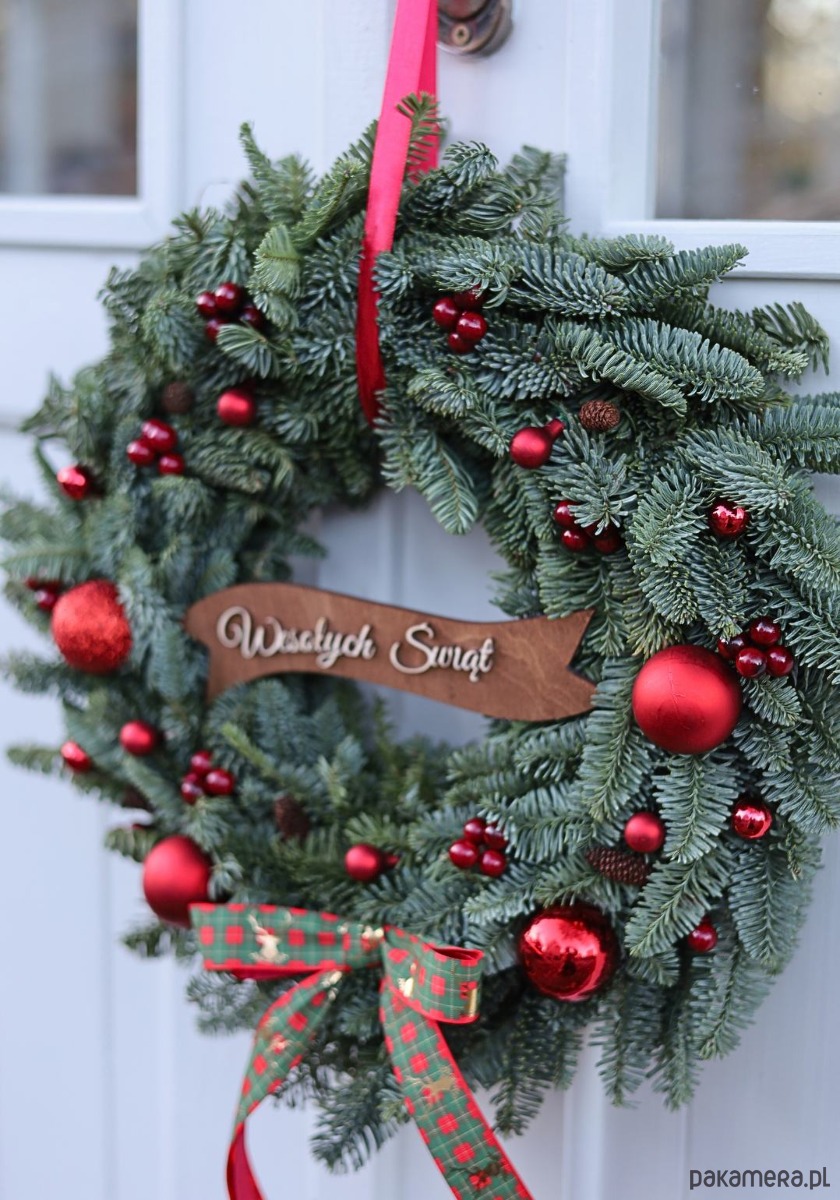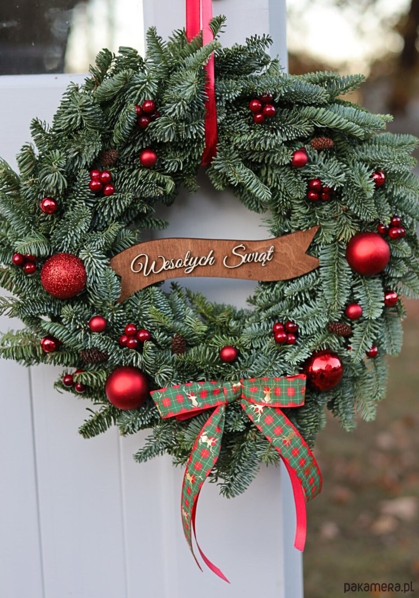 Wianek Bożonarodzeniowy został przyozdobiony czerwonymi bombkami i jarzębiną, które nadają mu klasycznego, świątecznego charakteru.