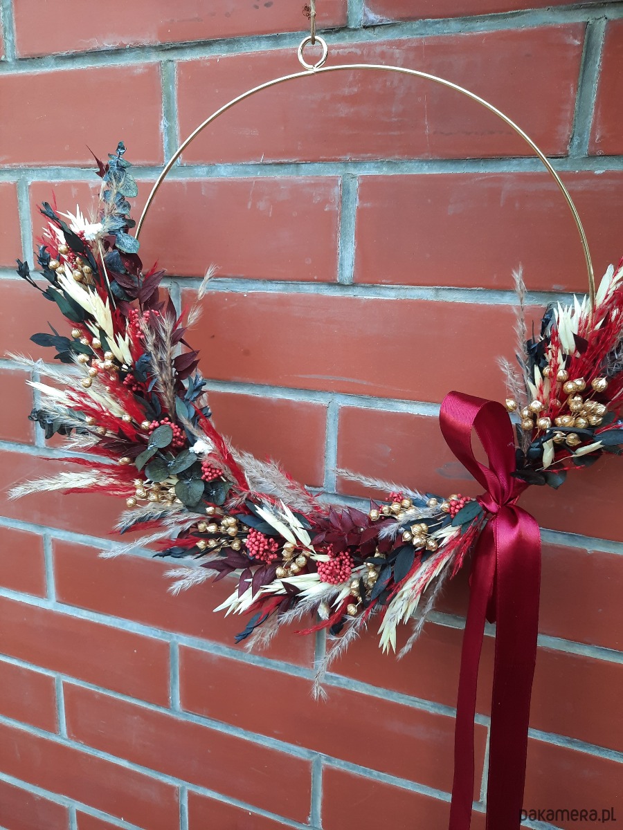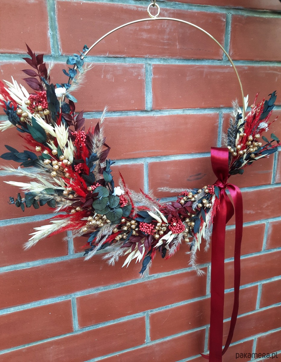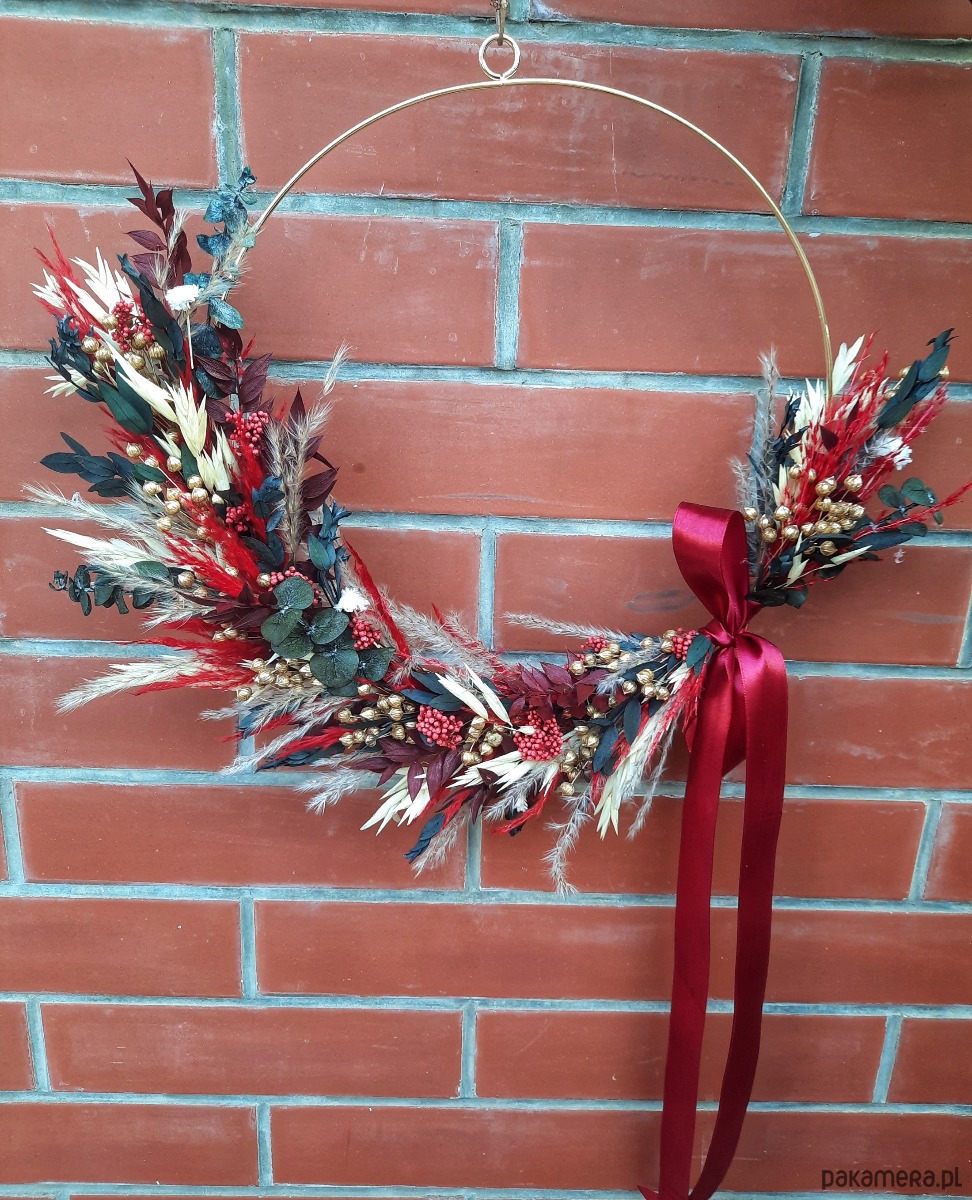 Wieniec ozdobiony jest naturalnymi suszonymi kwiatami I stabilizowanego eukaliptusa w kolorach czerwonym, zielonym i złotym.