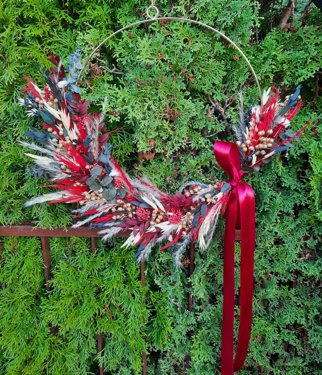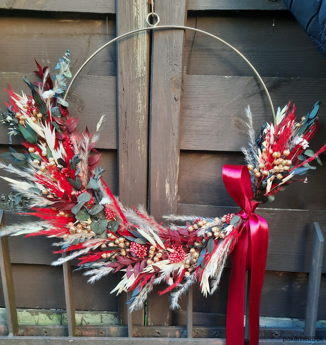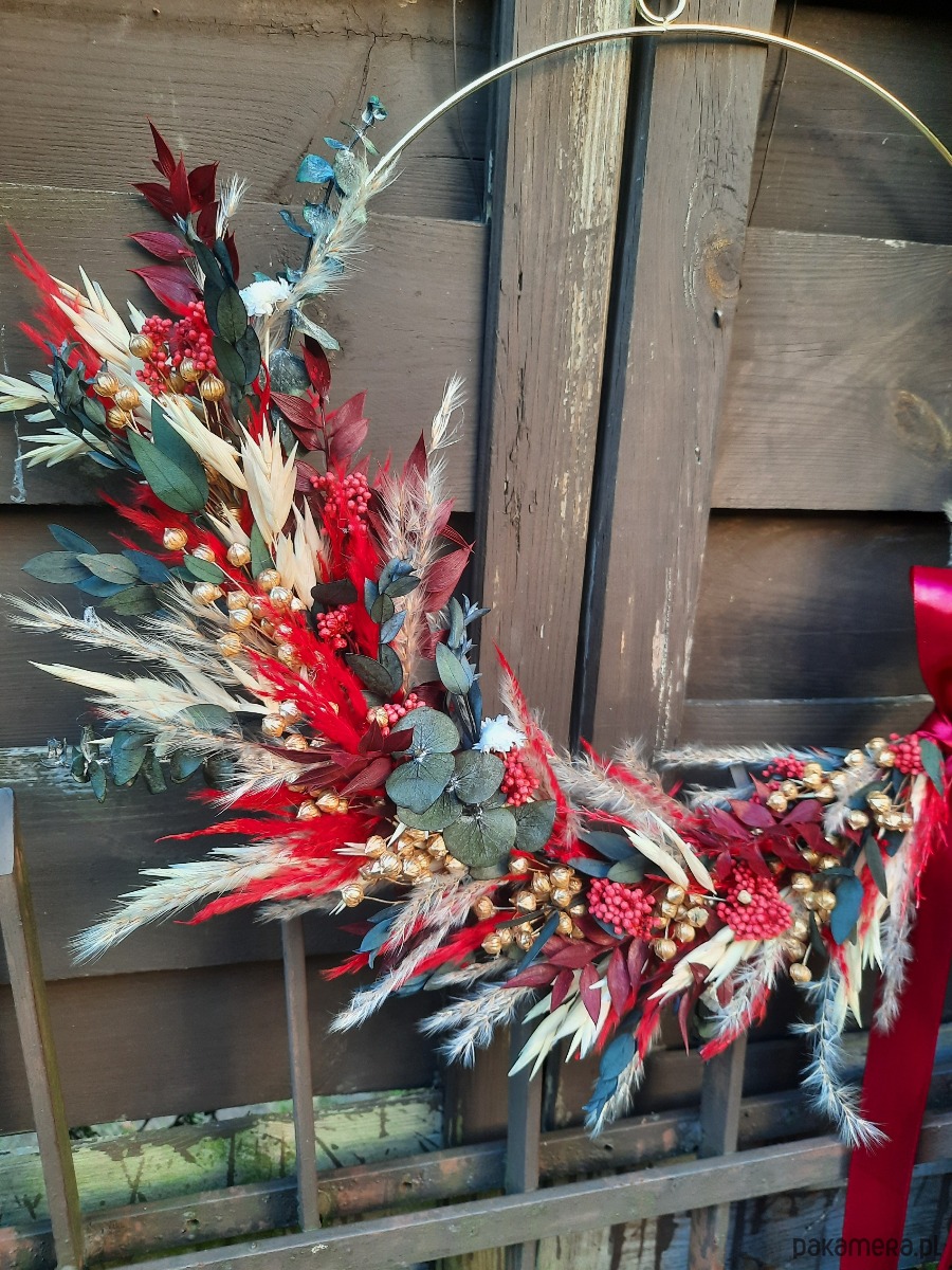Wieniec ozdobiony jest naturalnymi suszonymi kwiatami I stabilizowanego eukaliptusa w kolorach czerwonym, zielonym i złotym.