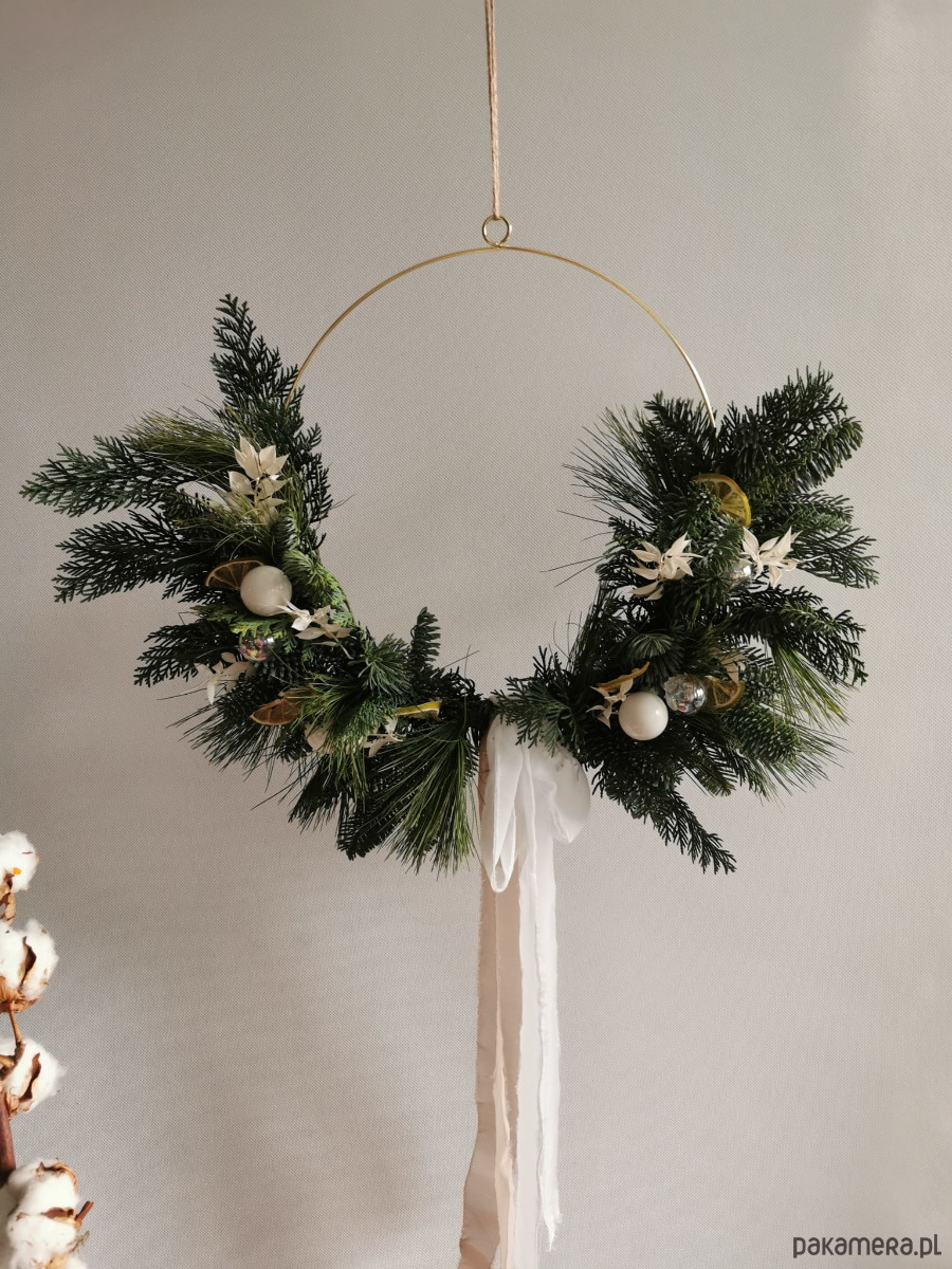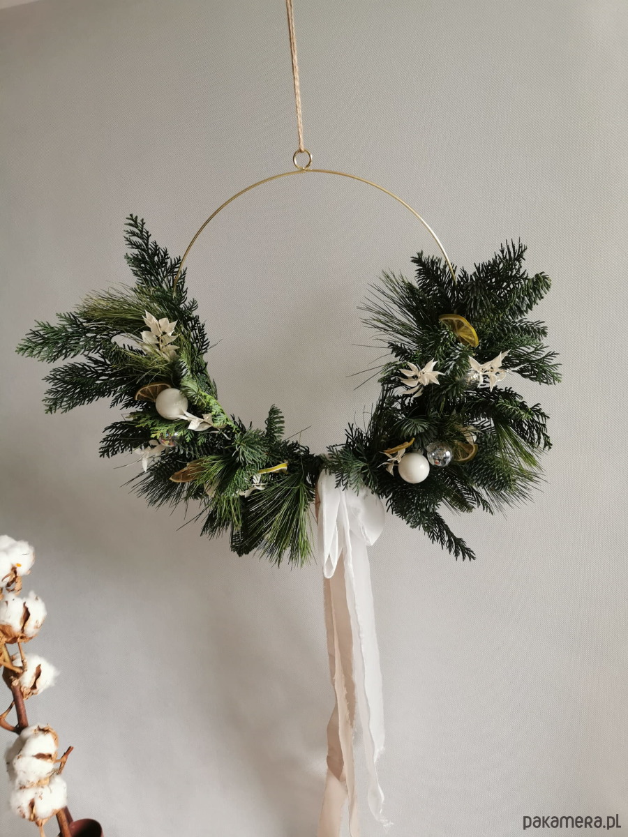 Piękny wianek świąteczny na złotej obręczy w zimowym klimacie. Stworzony jest z żywej jodły nobilis, tuji w srebrnym kolorze oraz sosny z suszonymi dodatkami. Jodła nobilis charakteryzuje się dużą wytrzymałością oraz tym że się nie osypuje tylko zasycha.
