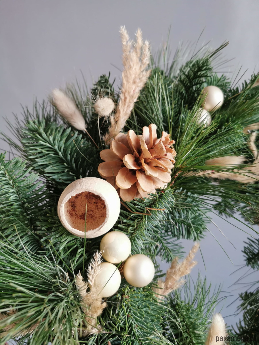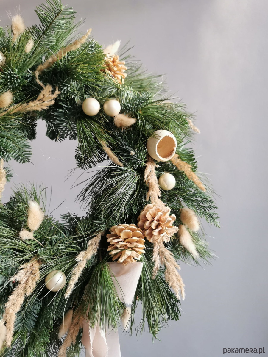 Piękny wianek świątecznym w beżowych kolorach. Stworzony jest z żywej jodły nobilis, tuji w srebrnym kolorze oraz sosny z suszonymi dodatkami. Jodła nobilis charakteryzuje się dużą wytrzymałością oraz tym że się nie osypuje tylko zasycha.