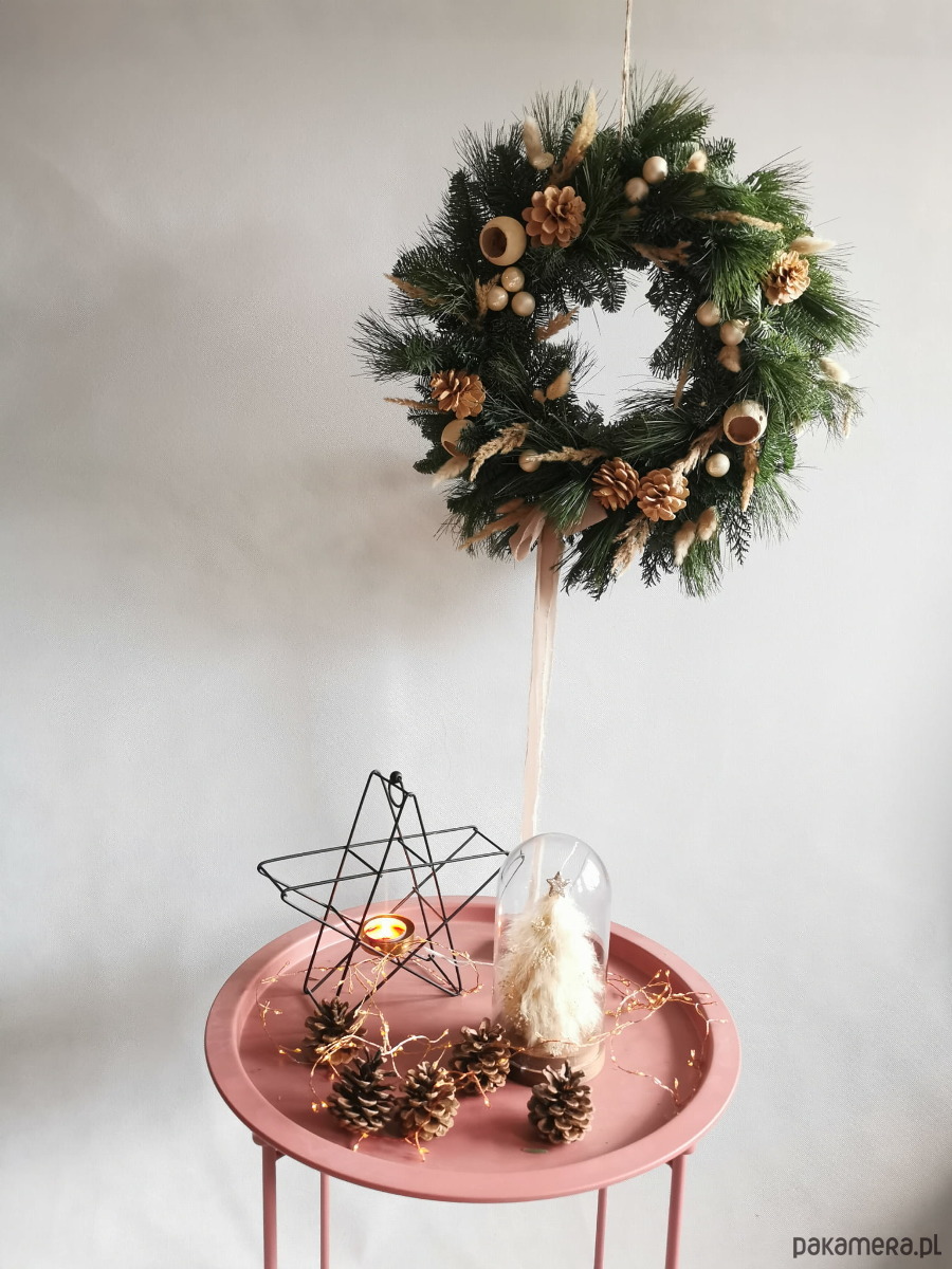 Wianek idealny aby powiesić na drzwiach lub w mieszkaniu nad komodą. Można go również wykorzystać jako leżąca dekoracja na stół świąteczny.
