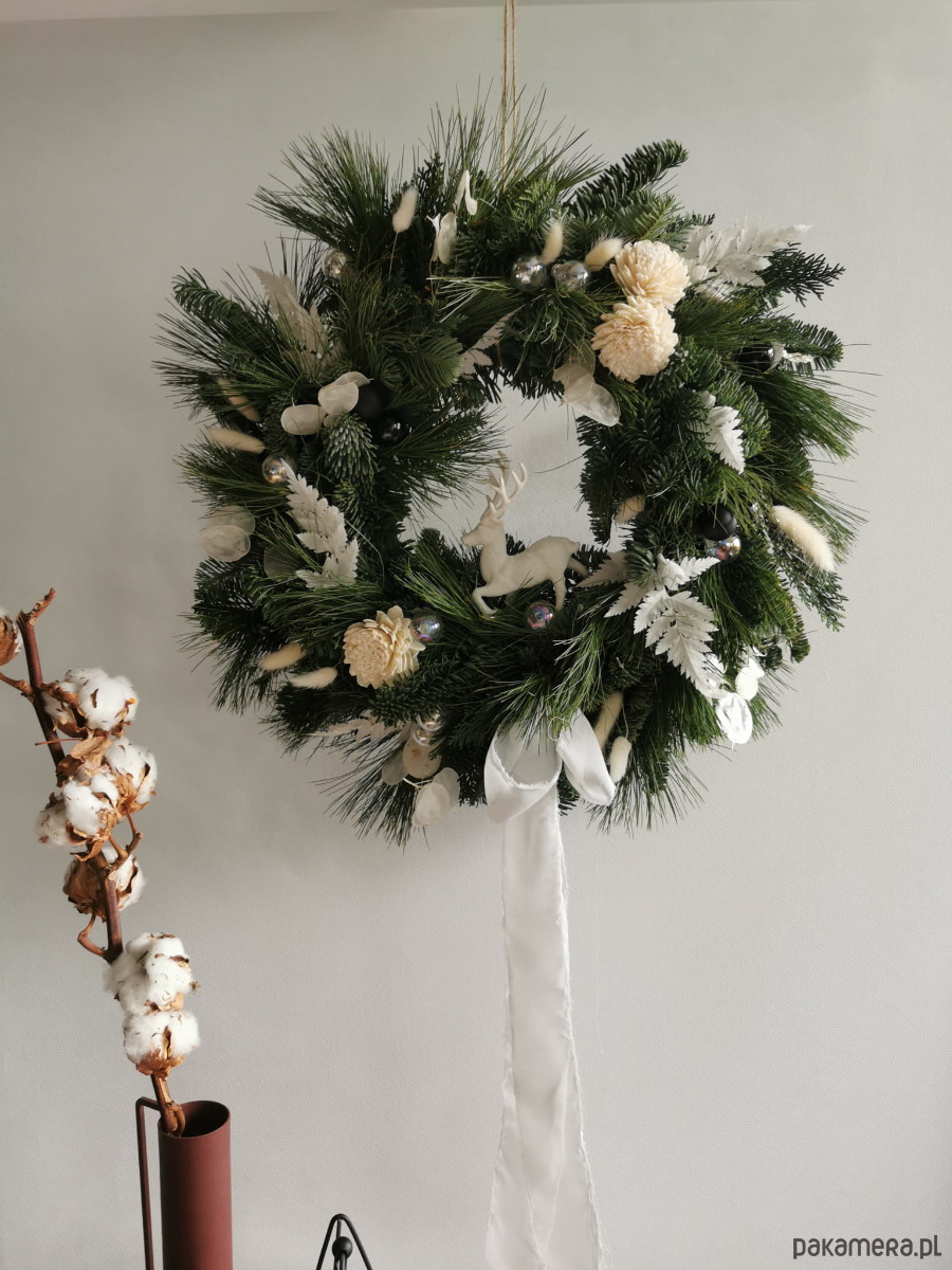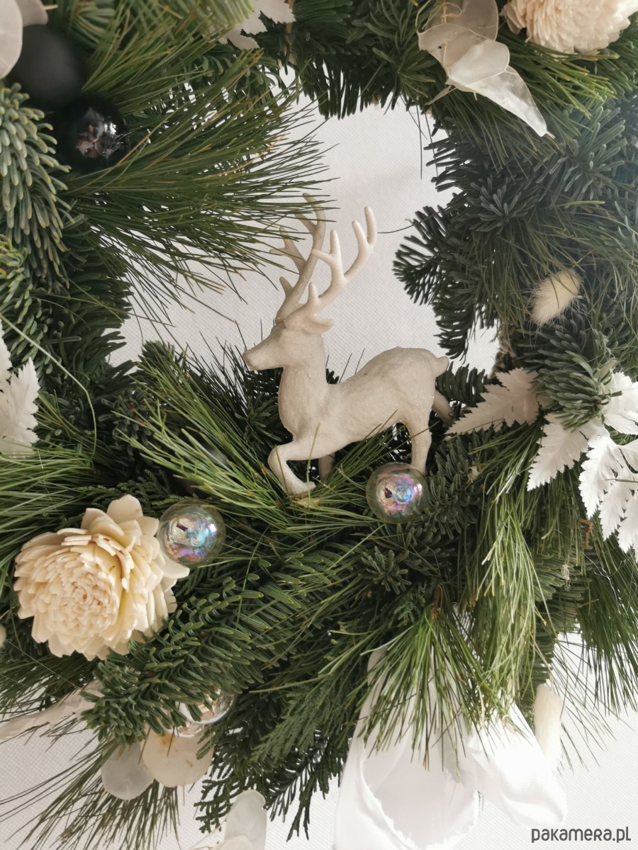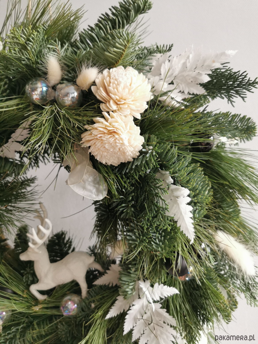 Piękny wianek świątecznym w eleganckim klimacie. Stworzony jest z żywej jodły nobilis, tuji w srebrnym kolorze oraz sosny z dodatkami w białych oraz kremowych kolorach z małym akcentem czerni. Ciekawym elementem wianka jest biały jelonek. Jodła nobilis charakteryzuje się dużą wytrzymałością oraz tym że się nie osypuje tylko zasycha.