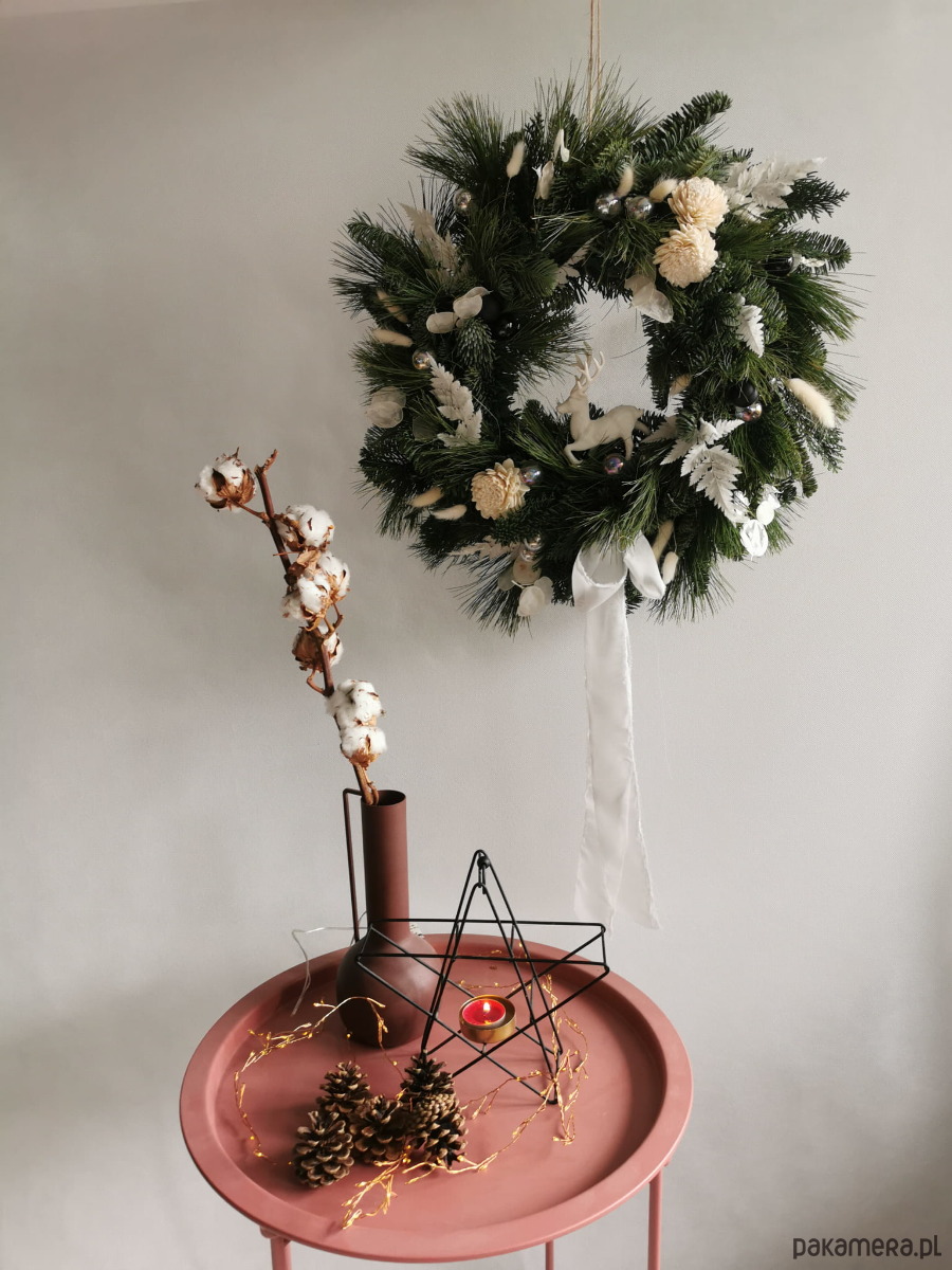 Wianek idealny aby powiesić na drzwiach lub w mieszkaniu nad komodą. Mniejszą wersję wianka można również wykorzystać jako leżąca dekoracja na stół świąteczny.