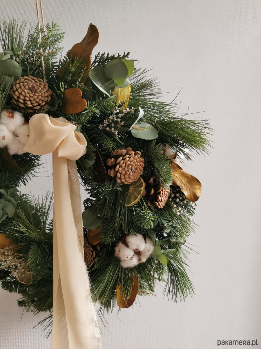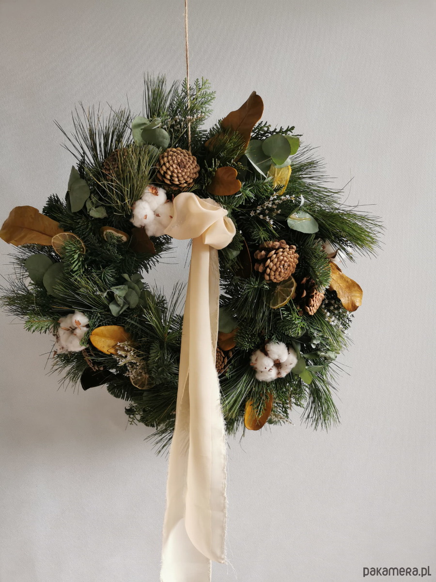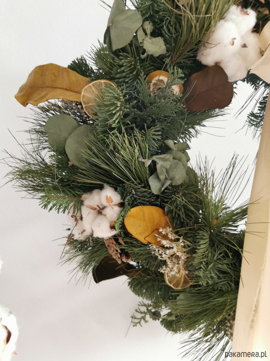 Piękny wianek świątecznym w naturalnym klimacie. Stworzony jest z żywej jodły nobilis, tuji w srebrnym kolorze oraz sosny z dodatkami takimi jak bawełna czy liście magnolii. Jodła nobilis charakteryzuje się dużą wytrzymałością oraz tym że się nie osypuje tylko zasycha.