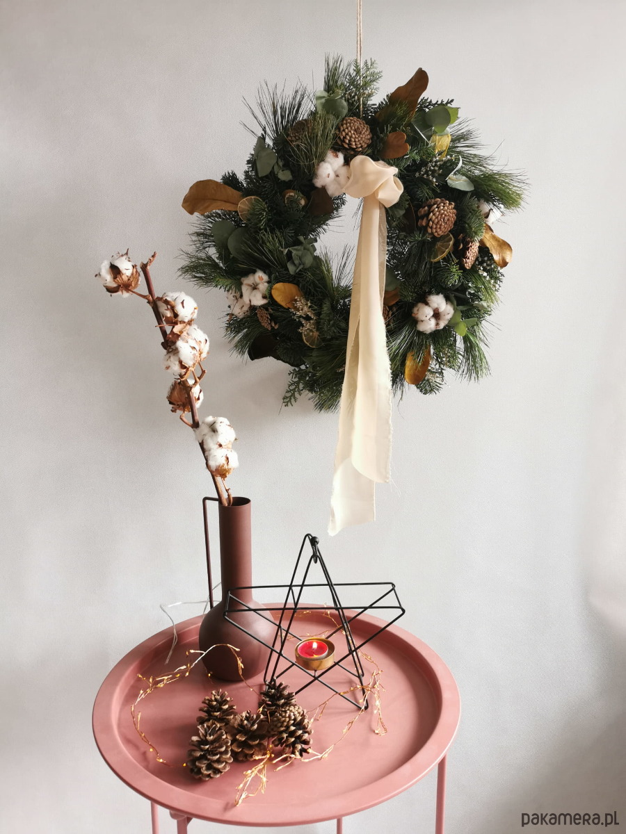 Wianek idealny aby powiesić na drzwiach lub w mieszkaniu nad komodą. Można go również wykorzystać jako leżąca dekoracja na stół świąteczny.