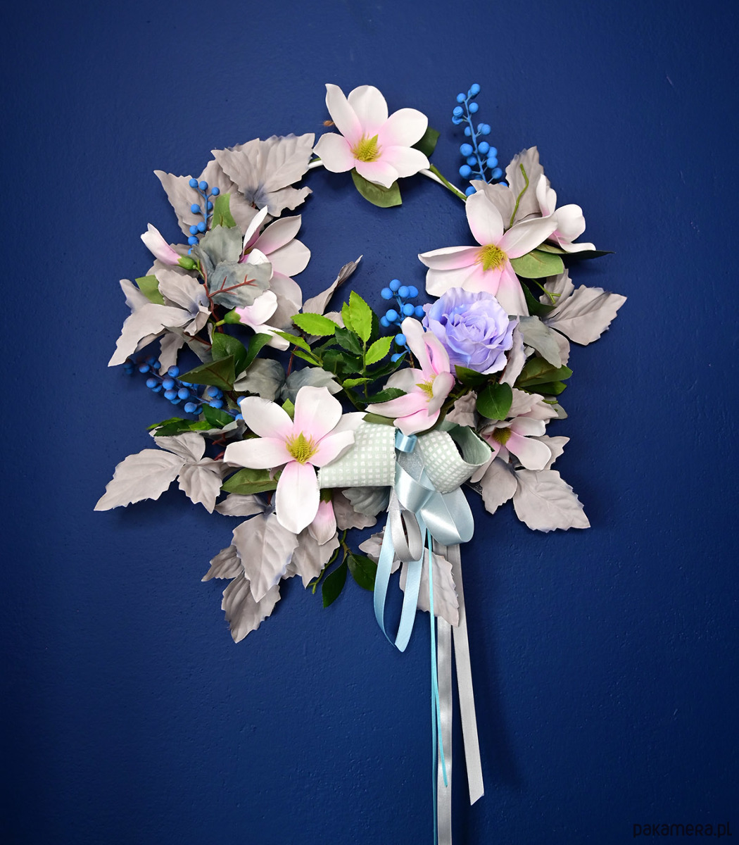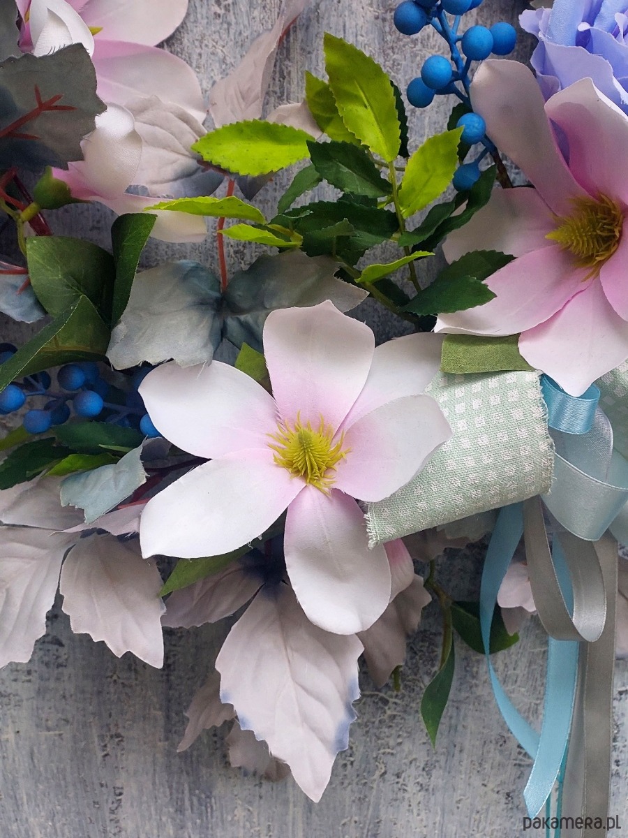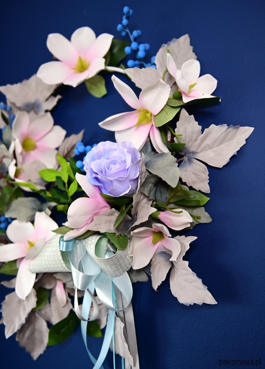 Ten bogato zdobiony wianek będzie stanowił niezwykle romantyczną ozdobę Twoich wnętrz. Kwiatowe elementy użyte do dekoracji są przy tym niezwykle realistyczne. Średnica metalowej obręczy 30 cm, wymiary całości to 52x55 cm.