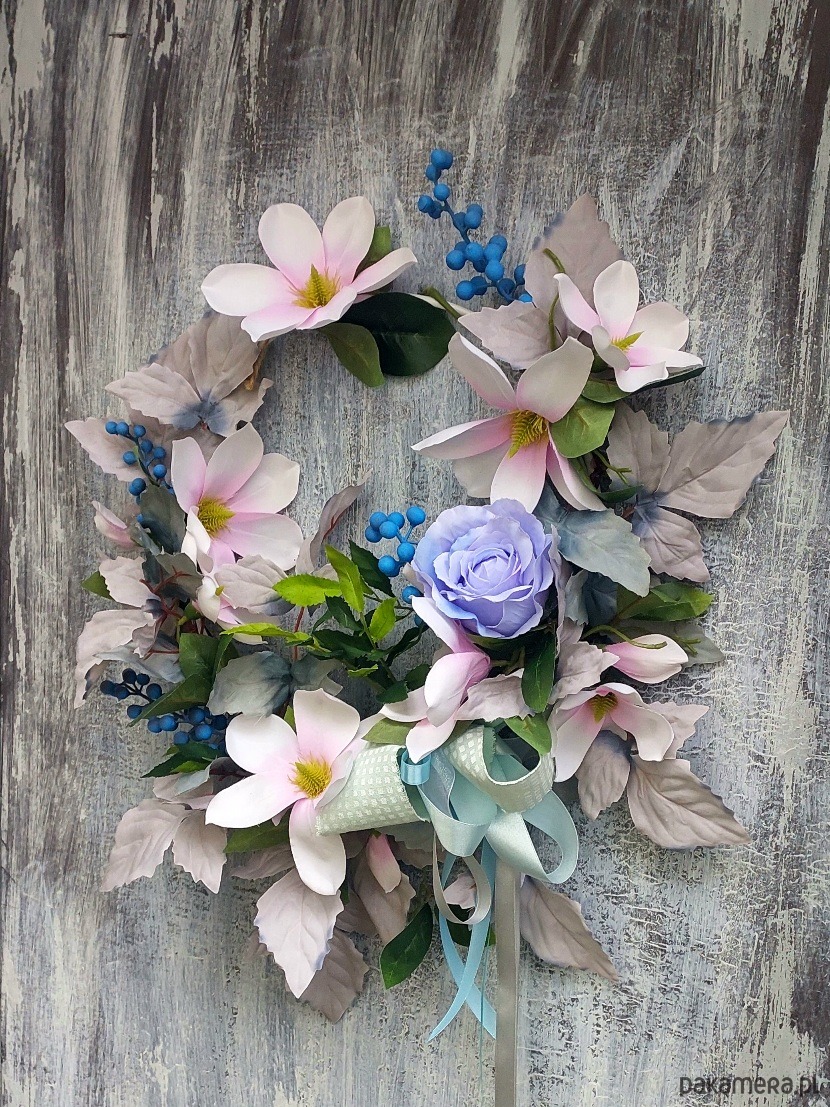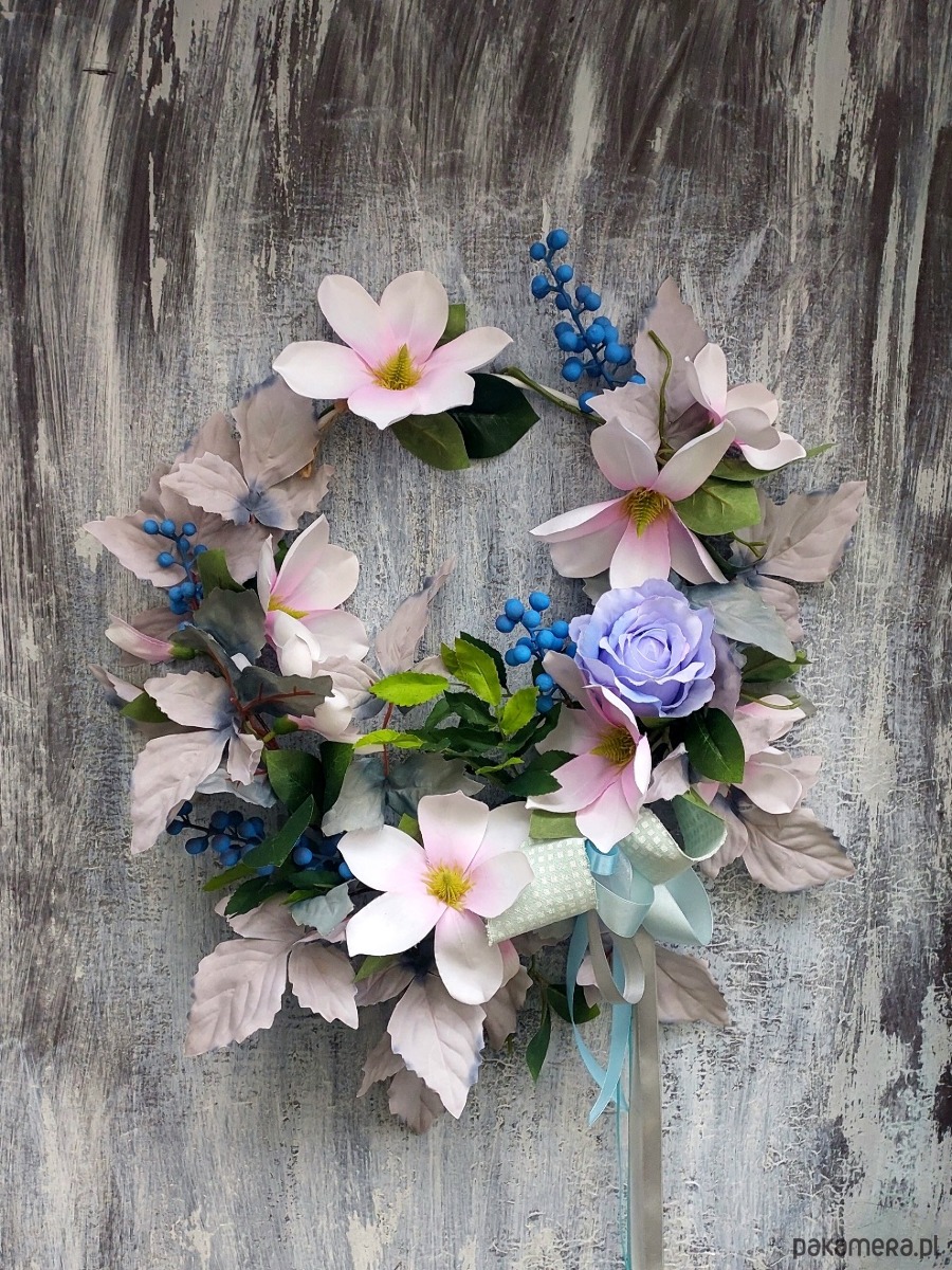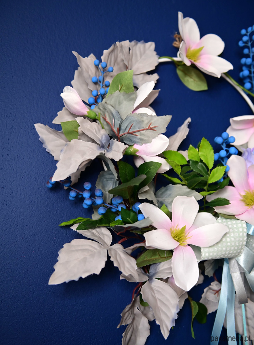 Ten bogato zdobiony wianek będzie stanowił niezwykle romantyczną ozdobę Twoich wnętrz. Kwiatowe elementy użyte do dekoracji są przy tym niezwykle realistyczne. Średnica metalowej obręczy 30 cm, wymiary całości to 52x55 cm.