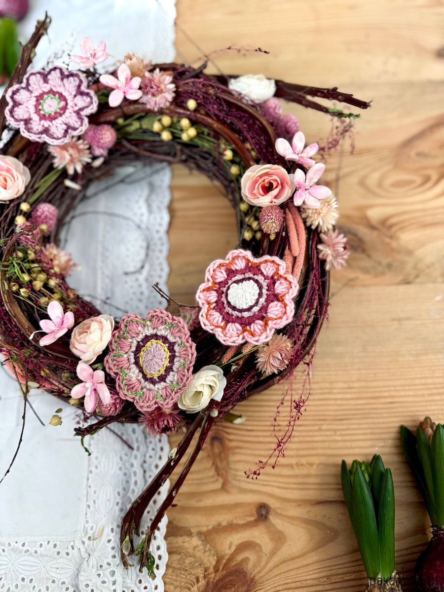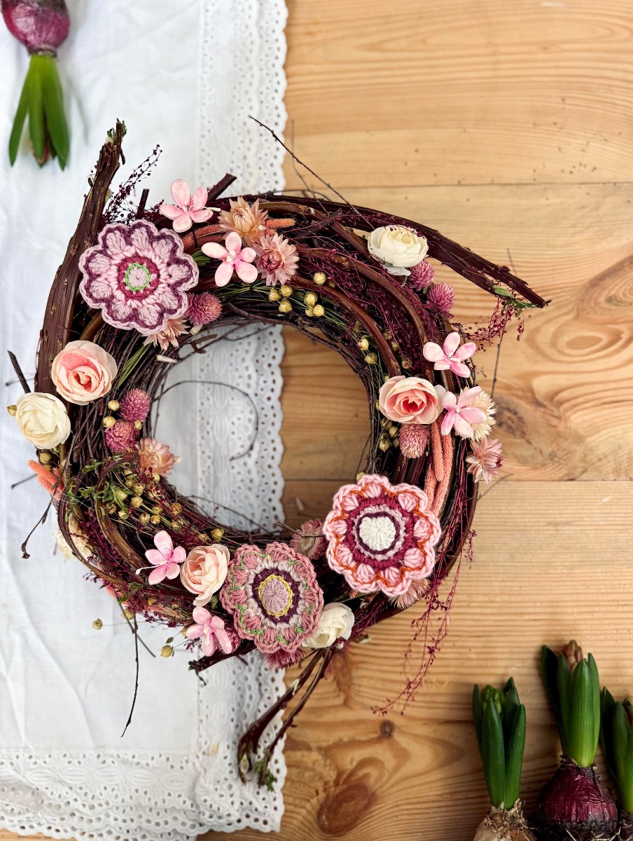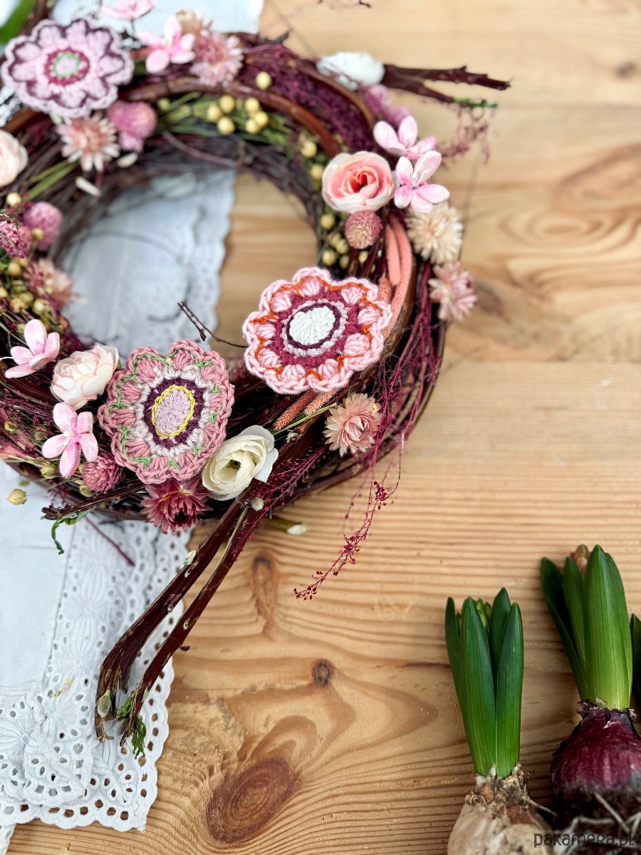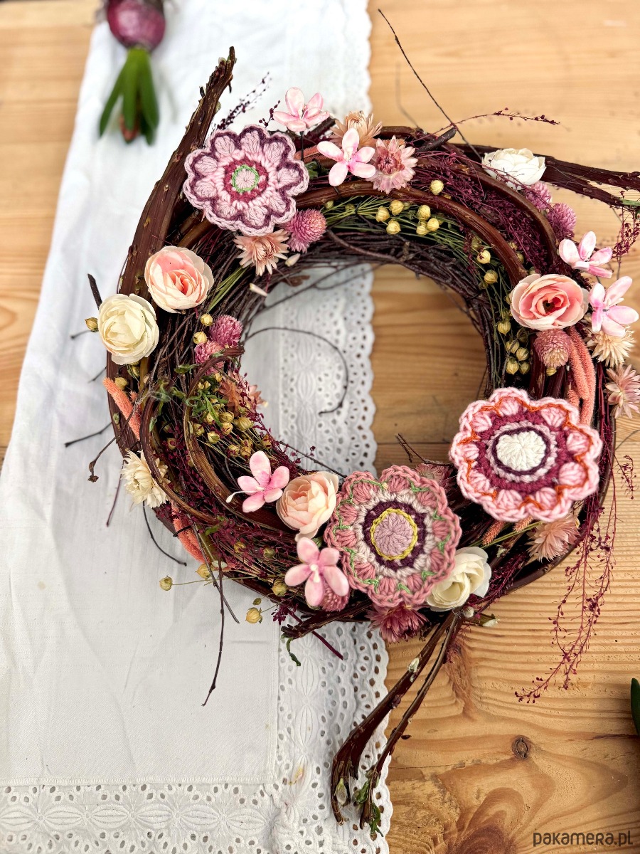 Wianek, w którym główną rolę odgrywają dziergane na szydełku kwiaty.