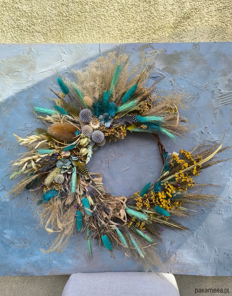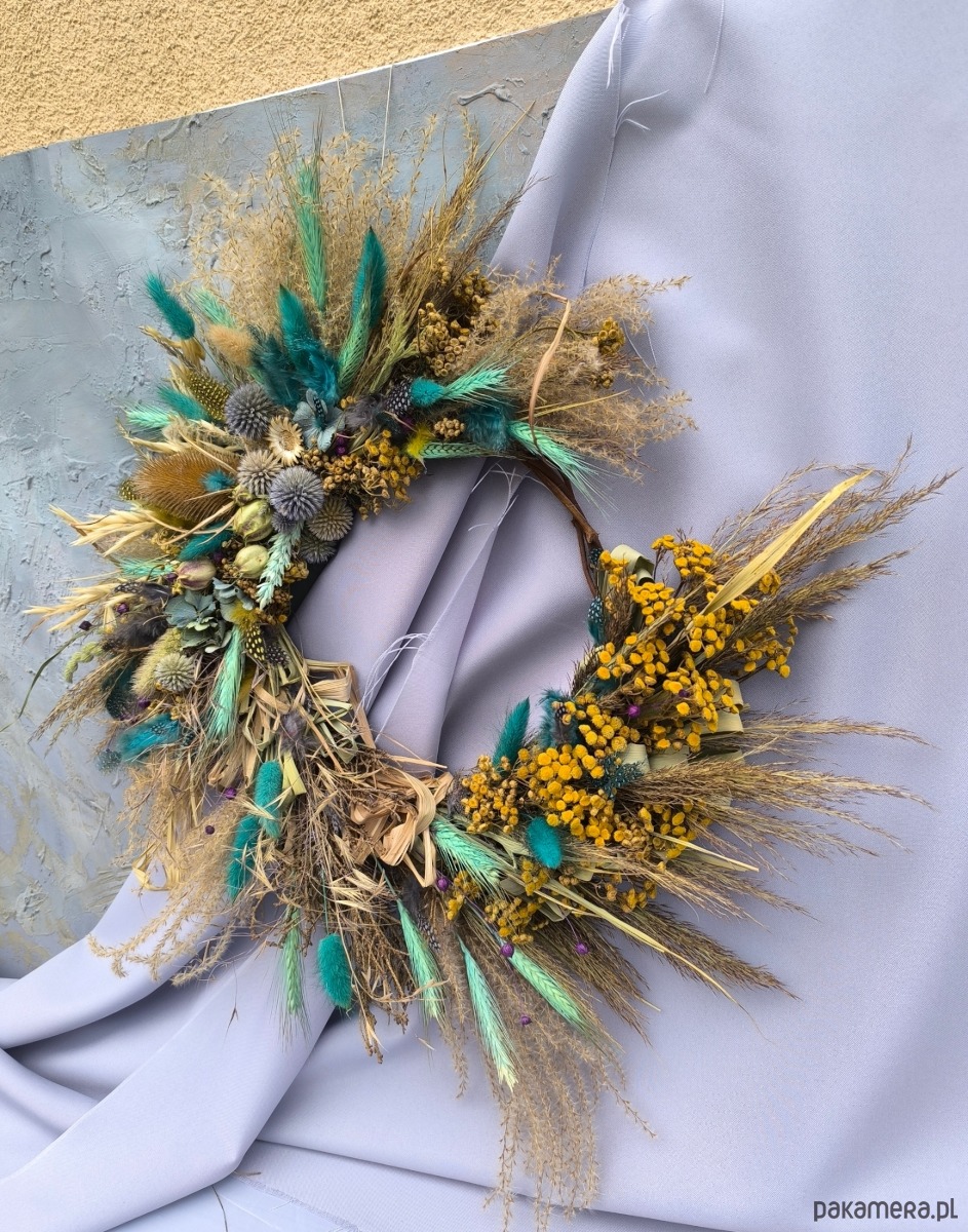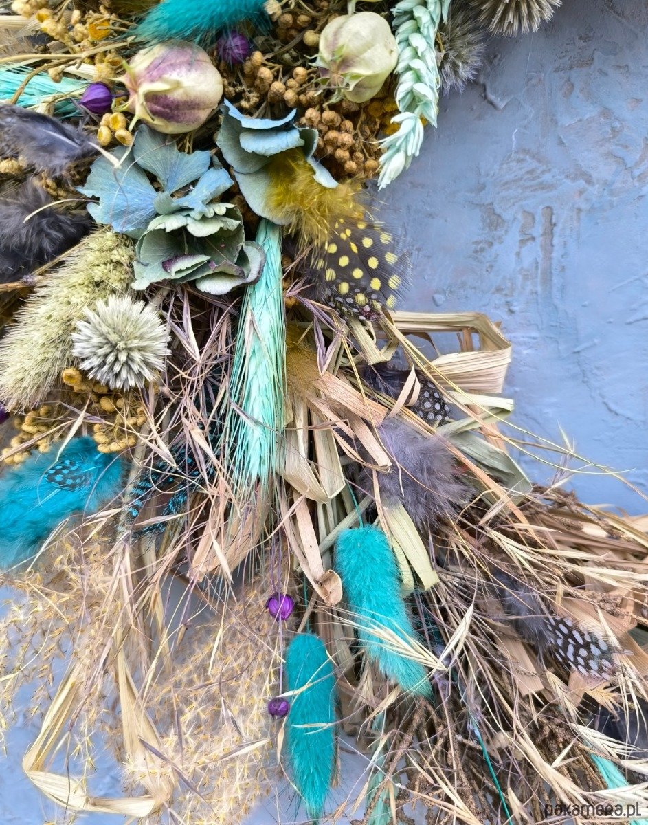 Asymetryczny wianek dekoracyjny wykonany z suszonych roślin- wiosenna w klimacie słoma przeplata się z roślinami w intensywnych turkusowych odcieniach i kontrastującym żółtym wrotyczem. Kompozycja jest lekka i ekspresyjna- z jednej strony otwarta, dzięki czemu widać naturalny korpus z gałęzi, co nadaje całości bardziej organiczny charakter.