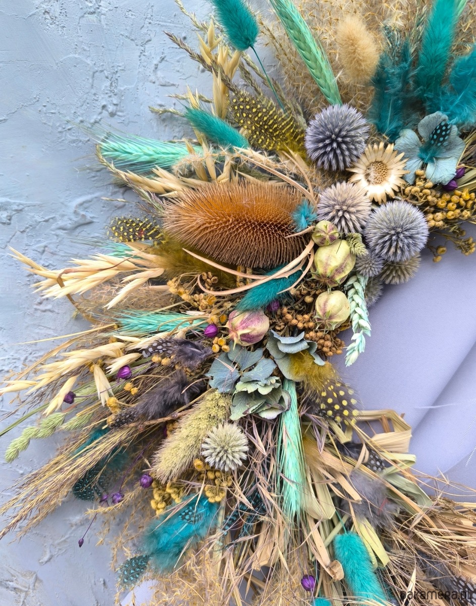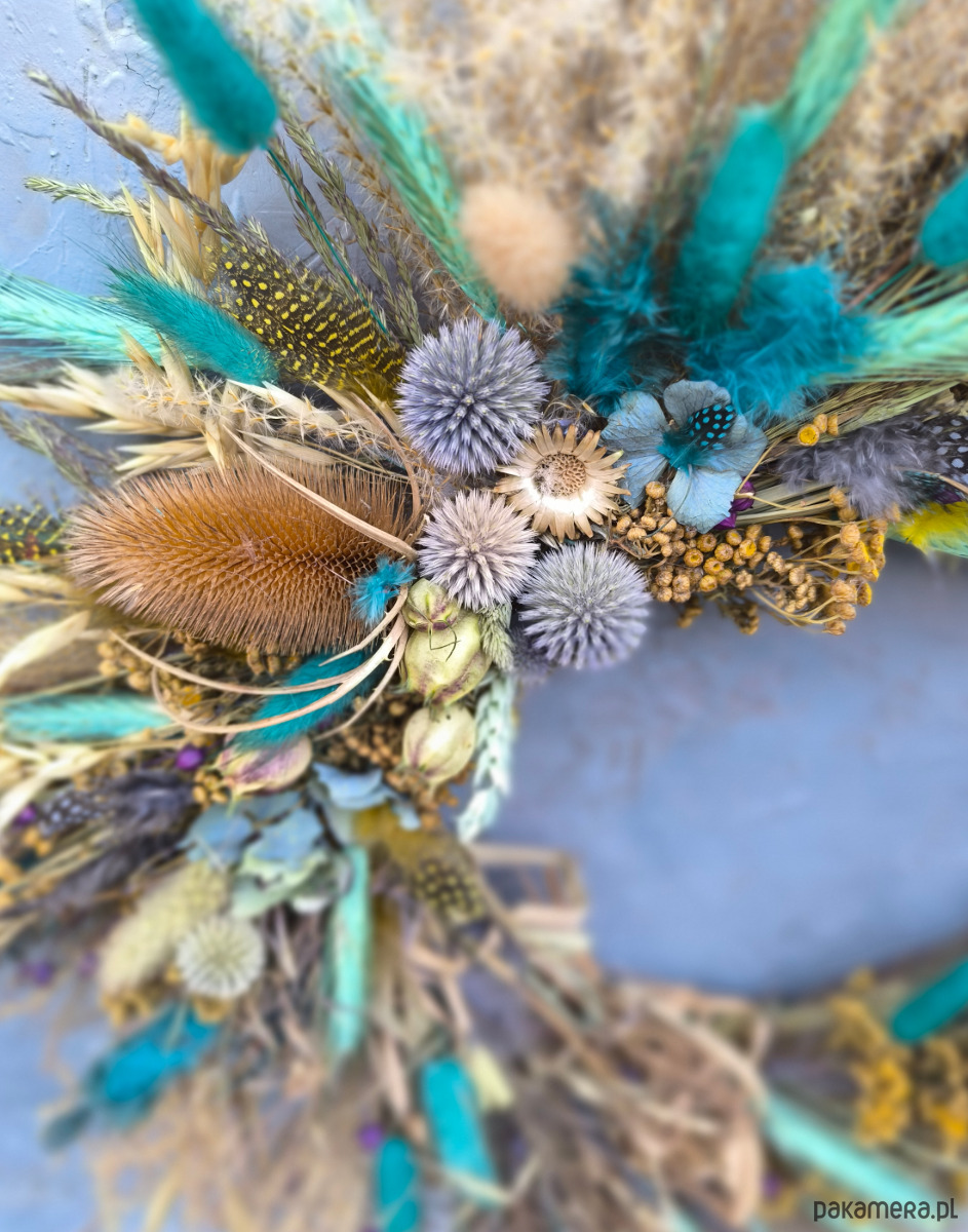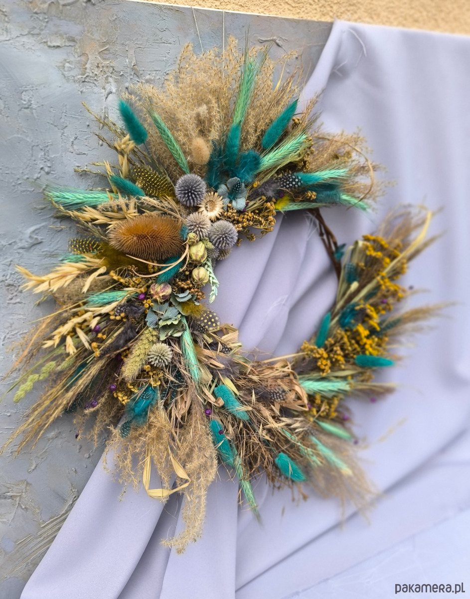 Asymetryczny wianek dekoracyjny wykonany z suszonych roślin- wiosenna w klimacie słoma przeplata się z roślinami w intensywnych turkusowych odcieniach i kontrastującym żółtym wrotyczem. Kompozycja jest lekka i ekspresyjna- z jednej strony otwarta, dzięki czemu widać naturalny korpus z gałęzi, co nadaje całości bardziej organiczny charakter.