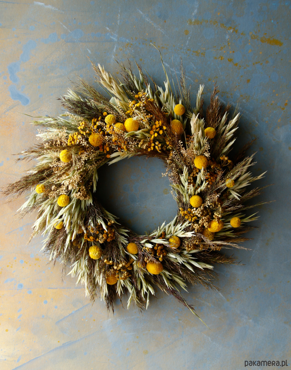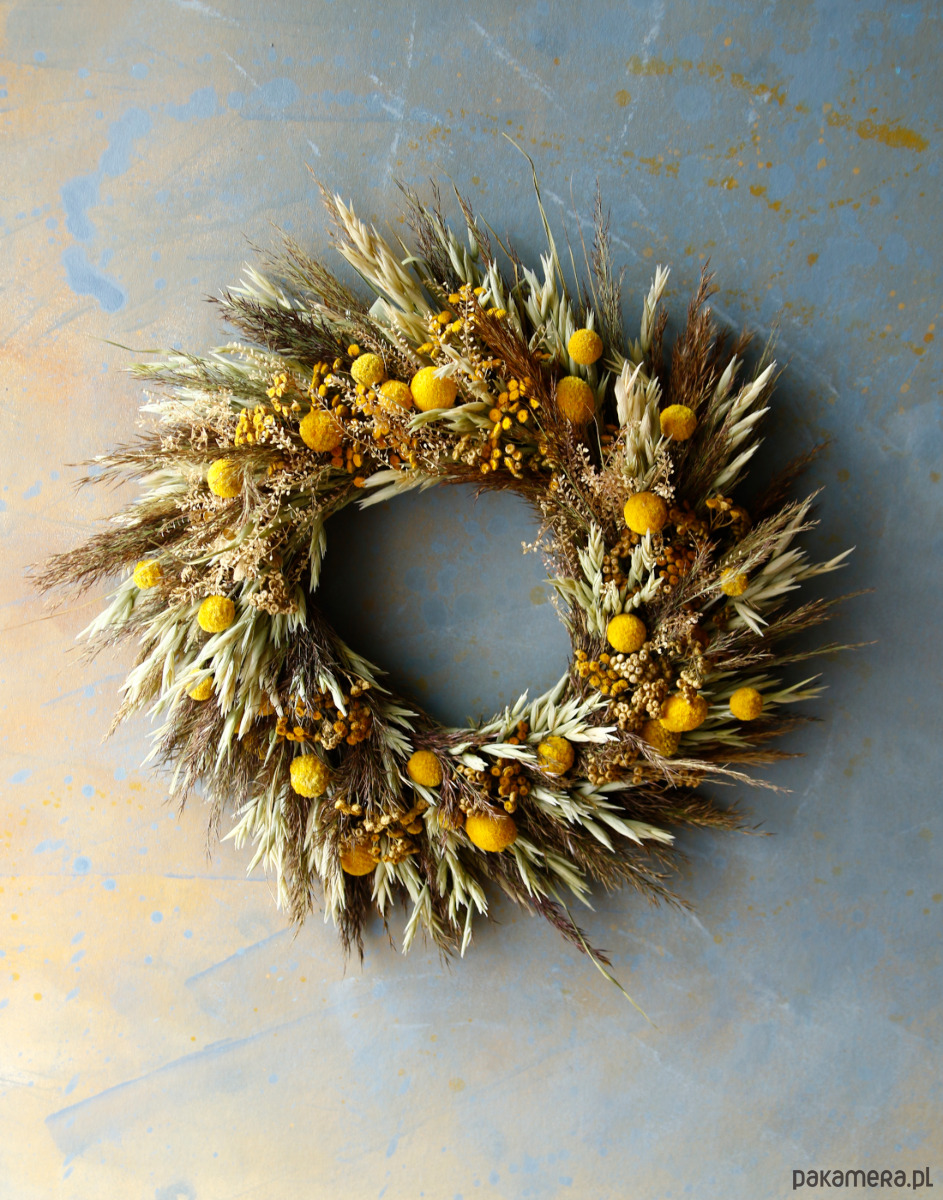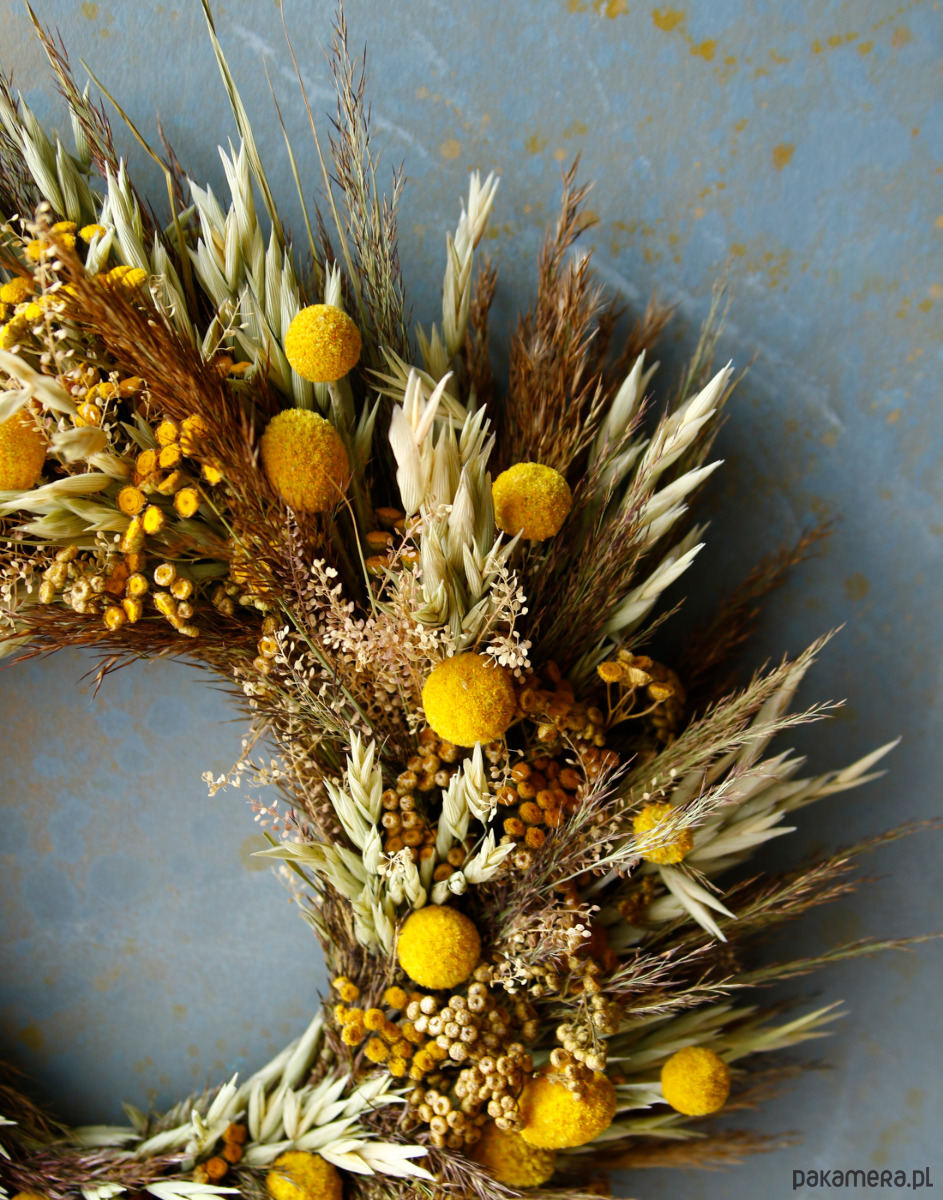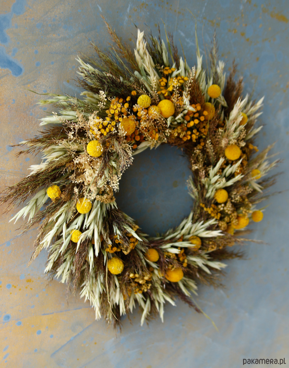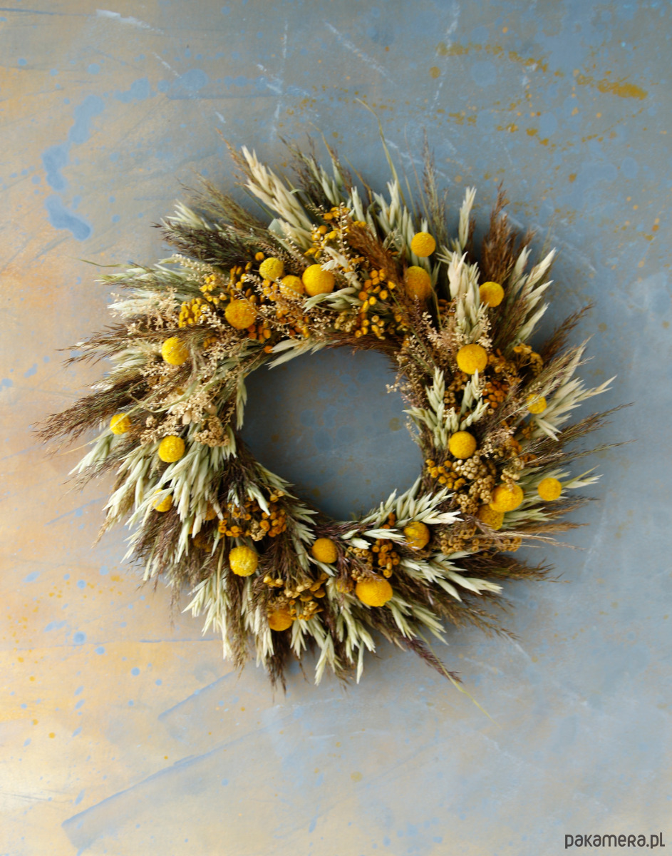 Wianek ,, Układ słoneczny" to pogodna propozycja dekoracji na drzwi lub ścianę. Powstała z suszonych roślin i kwiatów- główną rolę odgrywają naturalnie żółte kuleczki kraspedii.