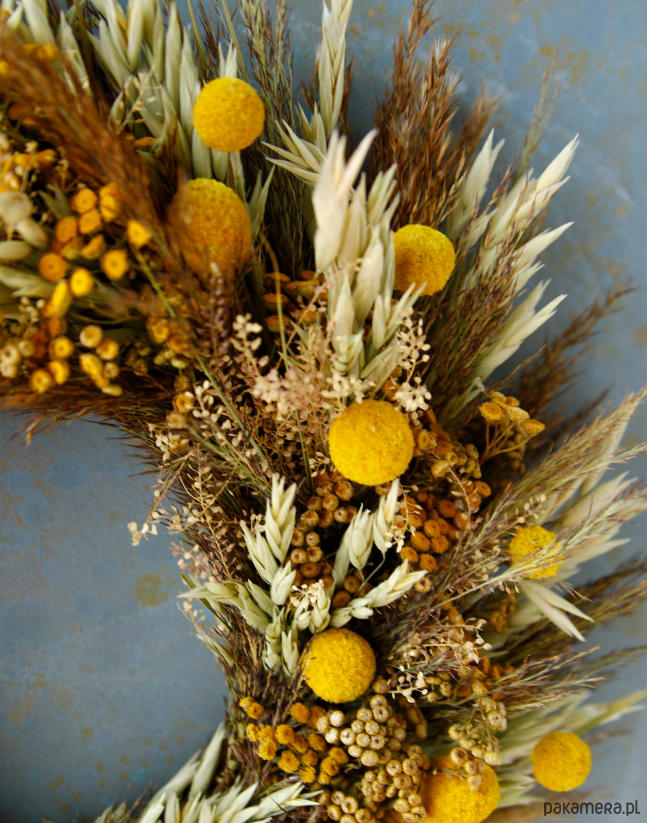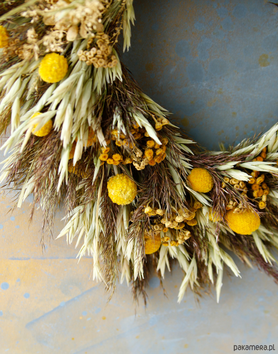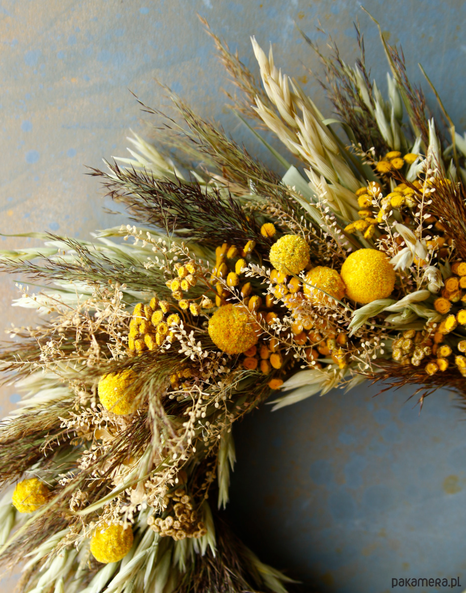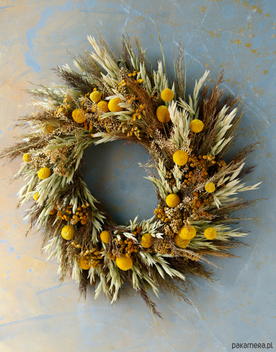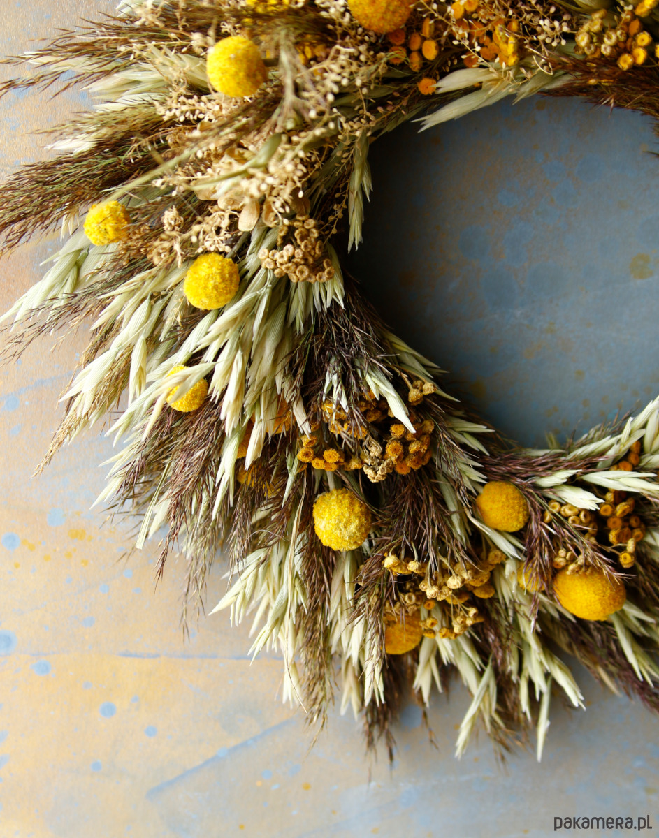 Wianek ,, Układ słoneczny" to pogodna propozycja dekoracji na drzwi lub ścianę. Powstała z suszonych roślin i kwiatów- główną rolę odgrywają naturalnie żółte kuleczki kraspedii.