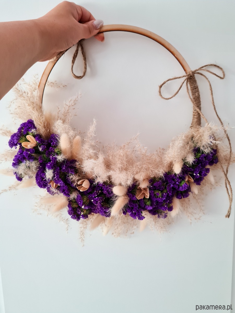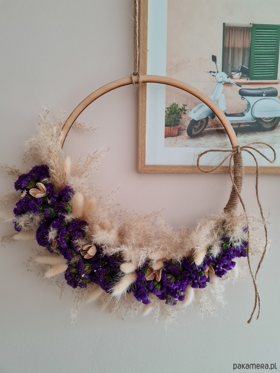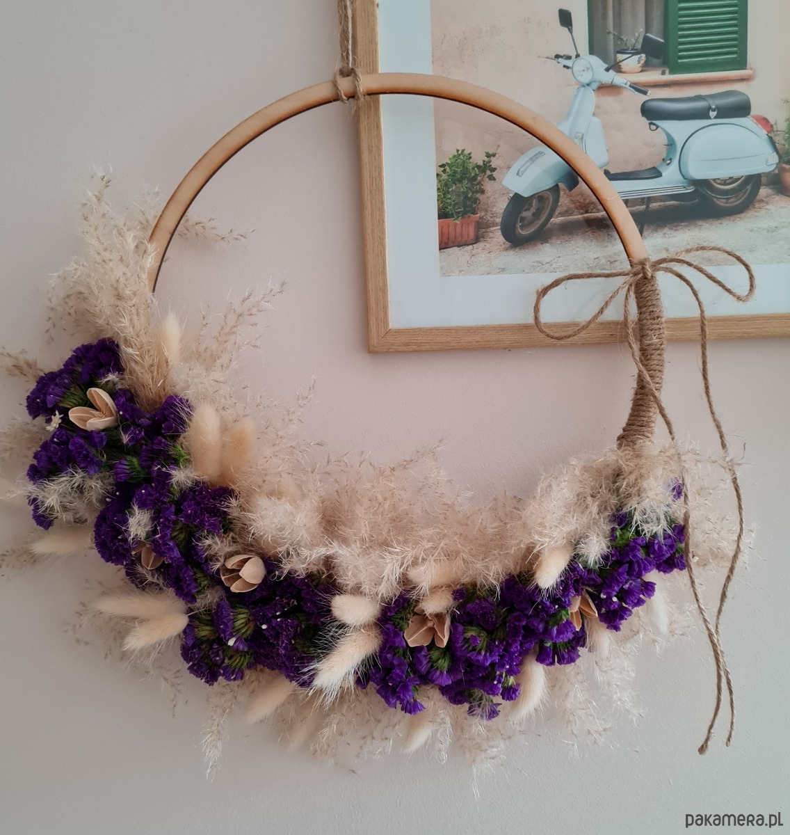 Materiał: drewniana obręcz, suszone kwiaty, jutowy sznurek.