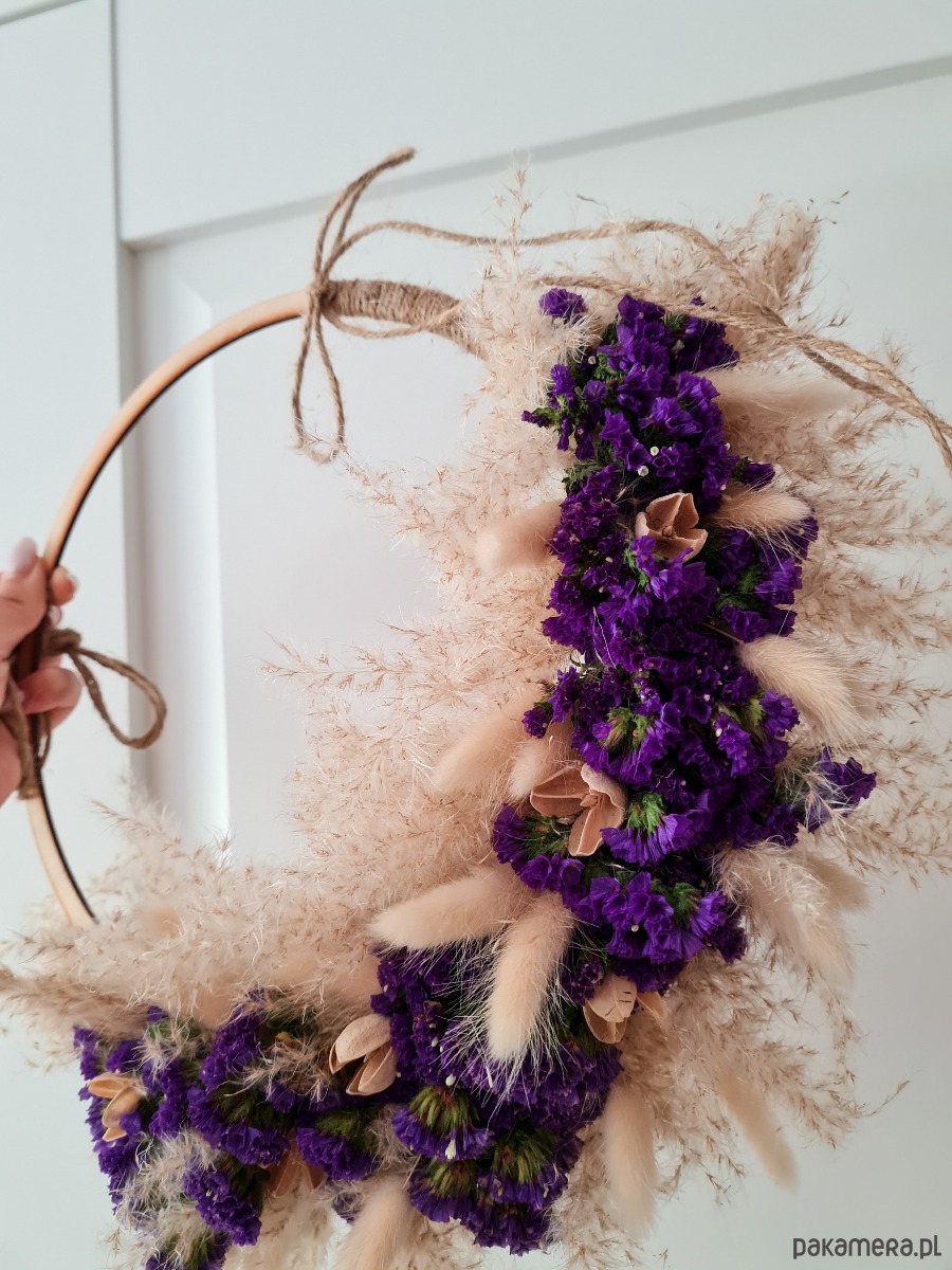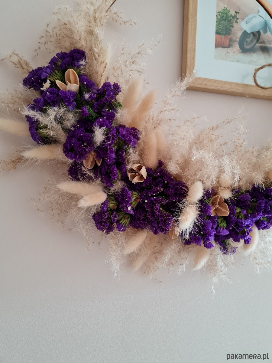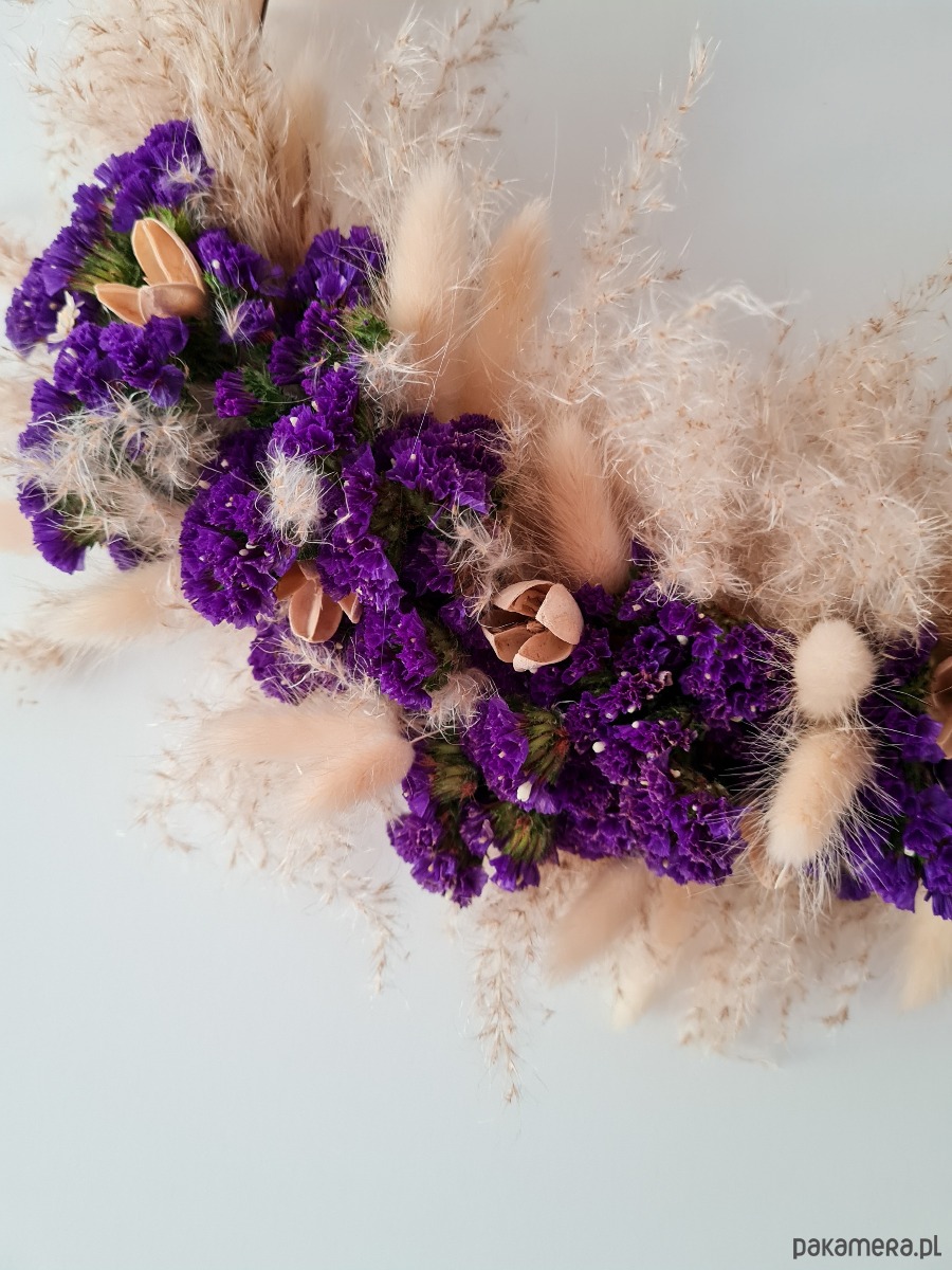 Wianek Violett, to piękny fioletowy wianek, stworzony w większości z pięknie zasuszającego się Zatrwianu, który idealnie sprawdzi się jako dekoracja każdej ściany.