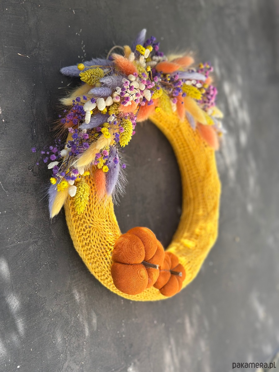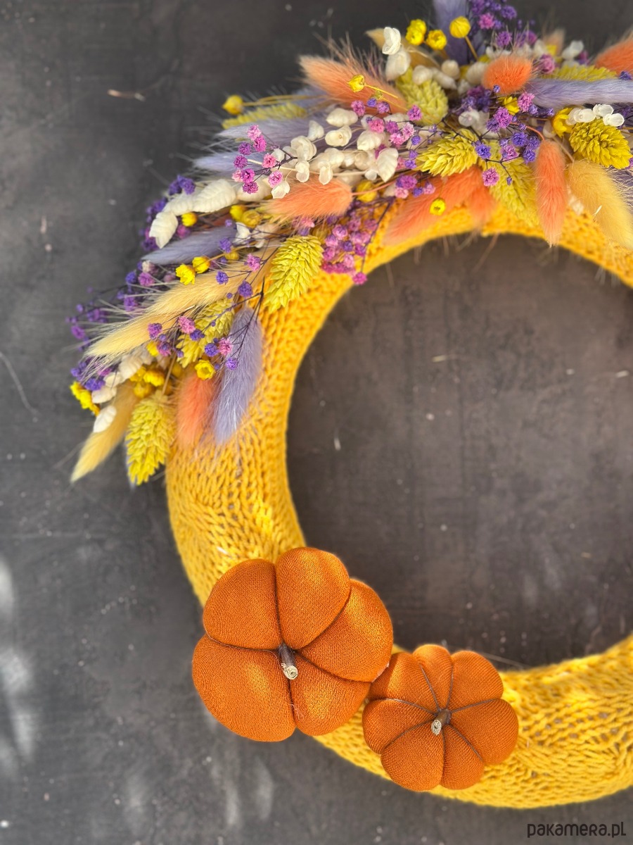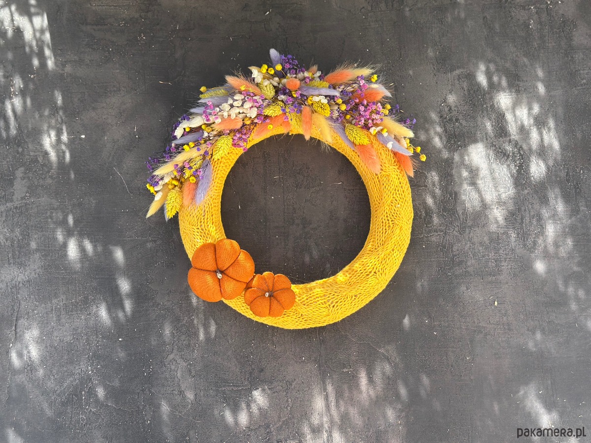 Wianek w uroczym, ręcznie robionym sweterku z żółtej włóczki, ozdobiony naturalnymi, suszonymi kwiatami i dyniami ręcznie szytymi.