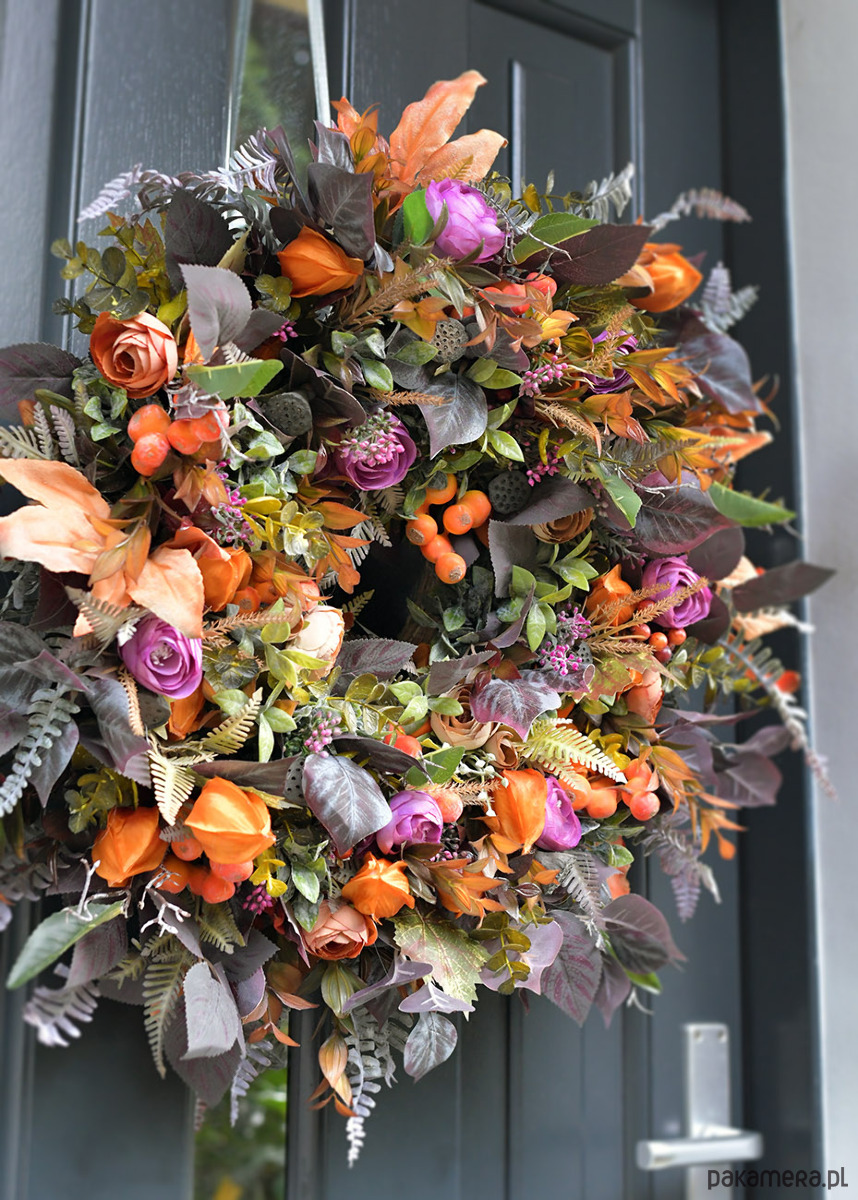 Nastrojowy, piękny wieniec w naturalnych, ciepłych barwach: plątanina paproci i intensywne pomarańczowych i bordowych liści bogato tkana jesiennymi owocami , a na tle tych ciepłych barw delikatnie kontrastujący fiolet :)