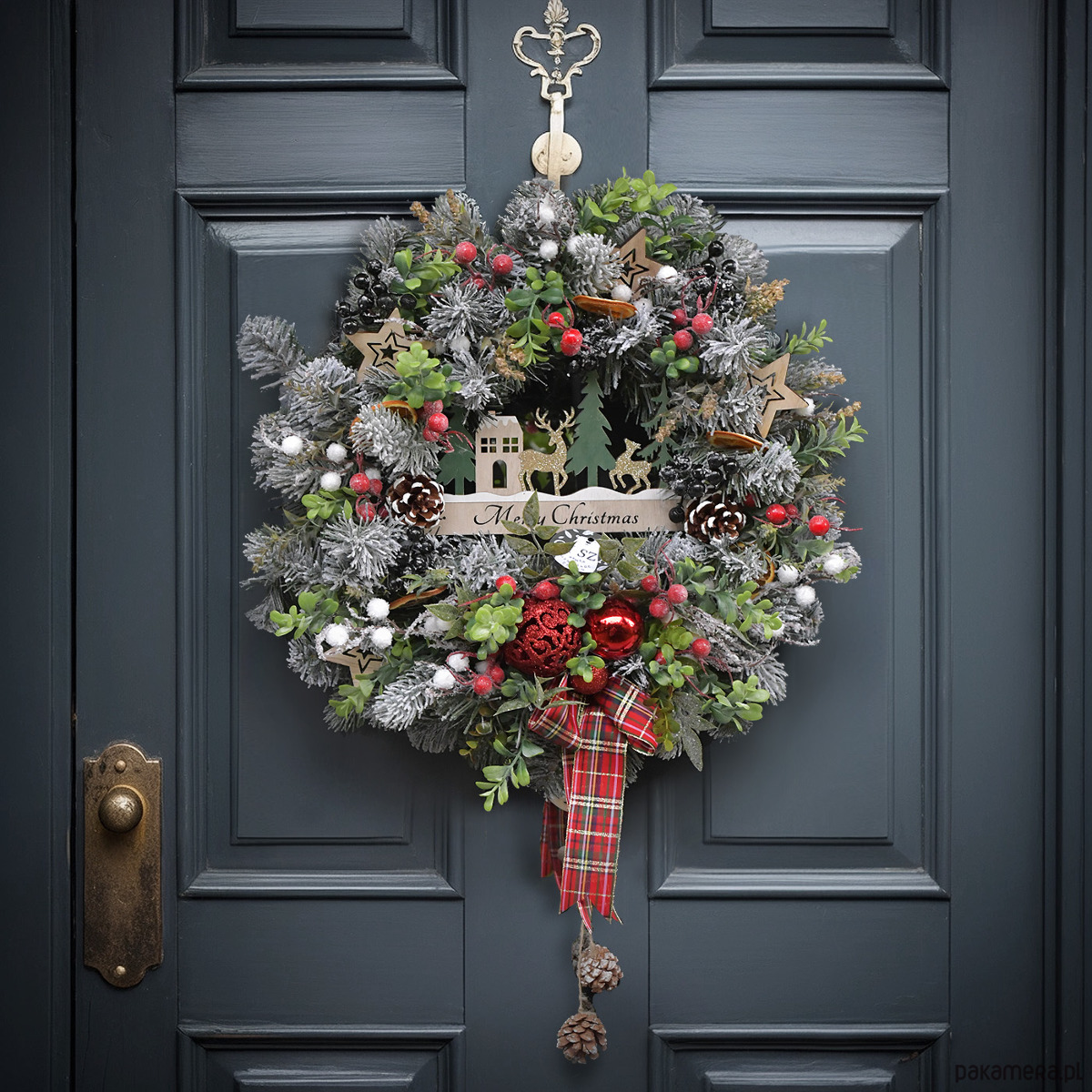 Dużo tradycyjnej czerwieni, mieniącego się srebra i złota, przyprószonych śniegiem świerkowych gałązek i piękny krajobraz świąteczny w centrum wianka :)