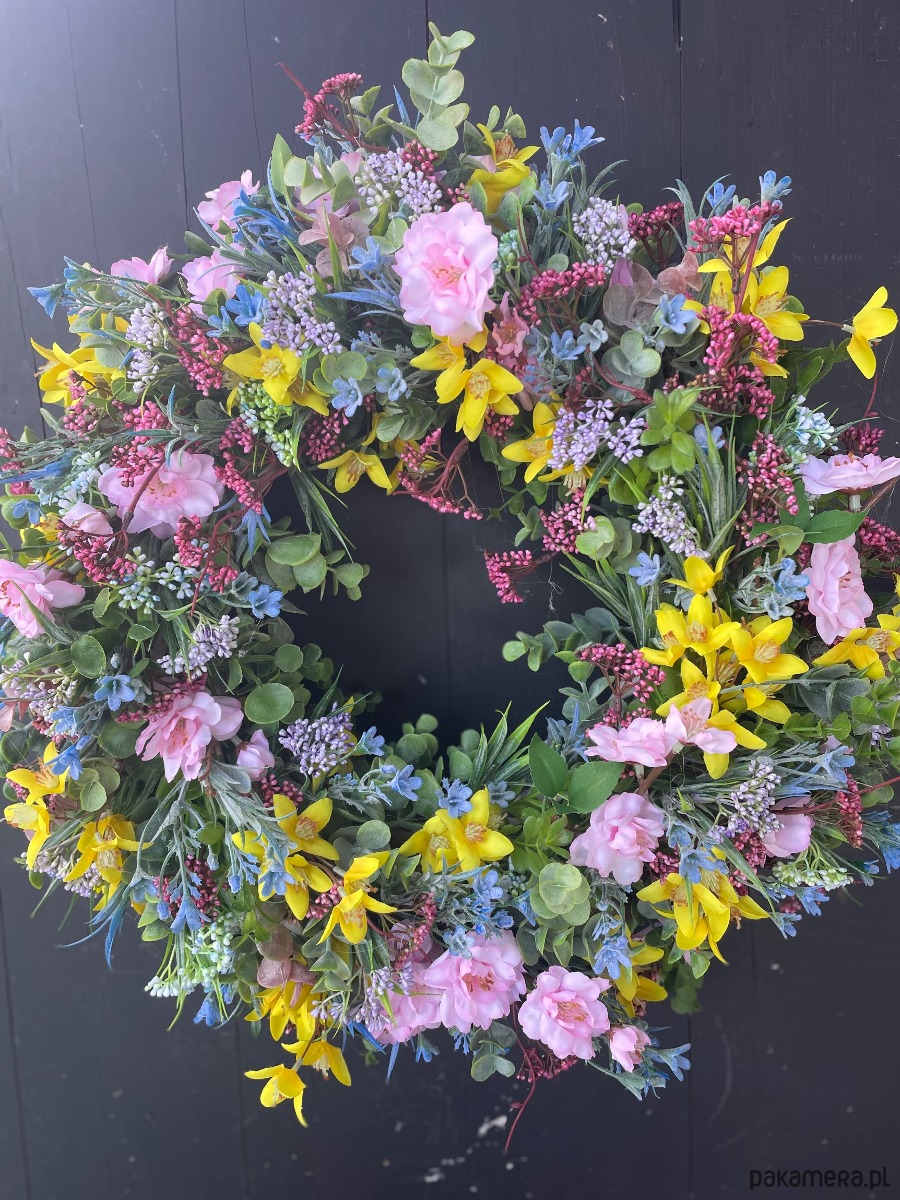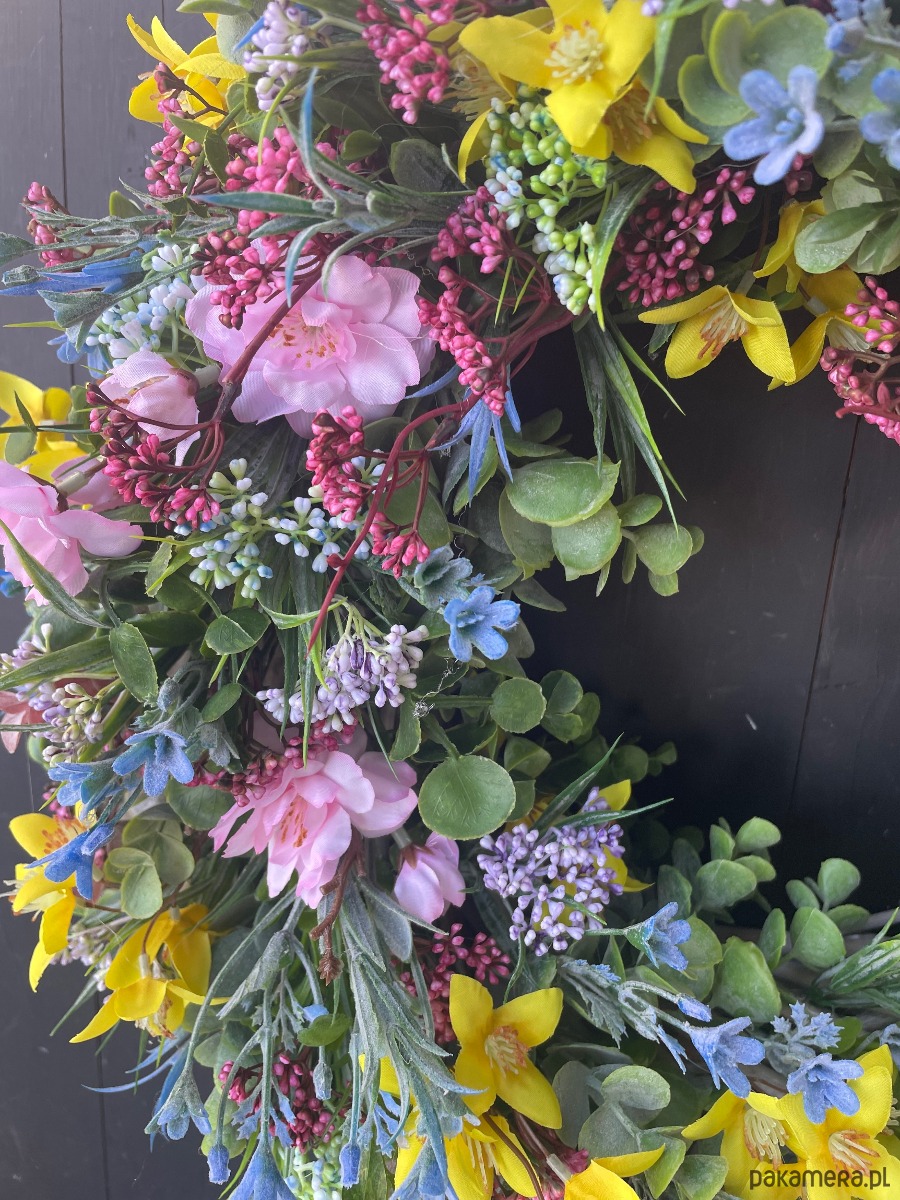 Piękny wiosenny wianek wykonany w całości ze sztucznych elementów na podstawie z rattanu. Wysokiej jakości kwiaty sprawiają, że cała kompozycja wygląda bardzo naturalnie. Dominujące kolory to niebieski, różowy i żółty. Wianek będzie świetnym uzupełnieniem wielkanocnych dekoracji ale nie dodałam do niego typowych ozdób kojarzących się z Wielkanocą więc będzie świetnie służył jako wiosenno-letnia ozdoba drzwi, komina czy ściany. Średnica ok 45-47 cm.