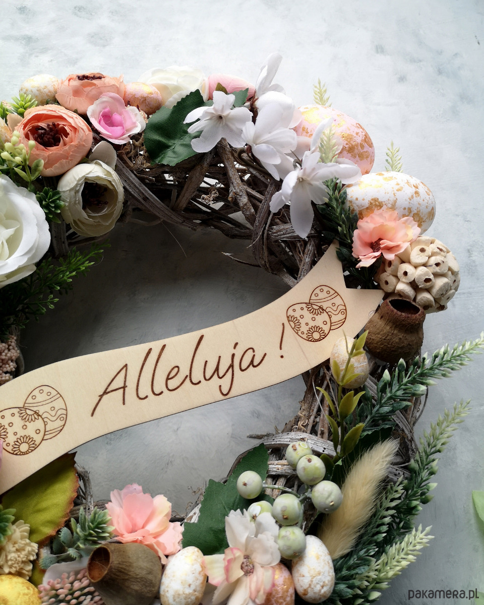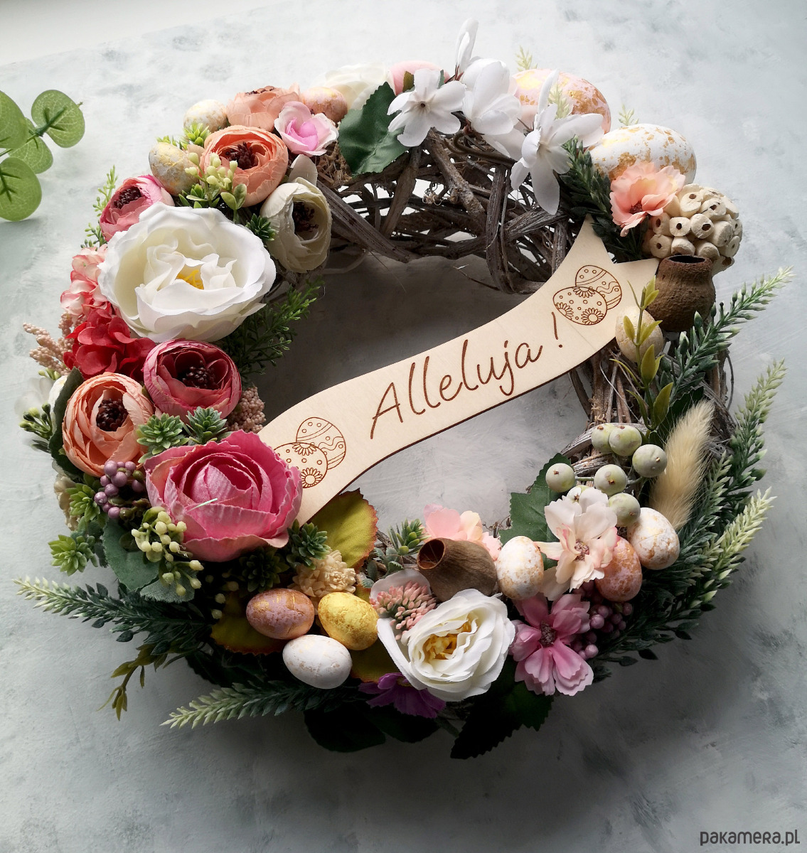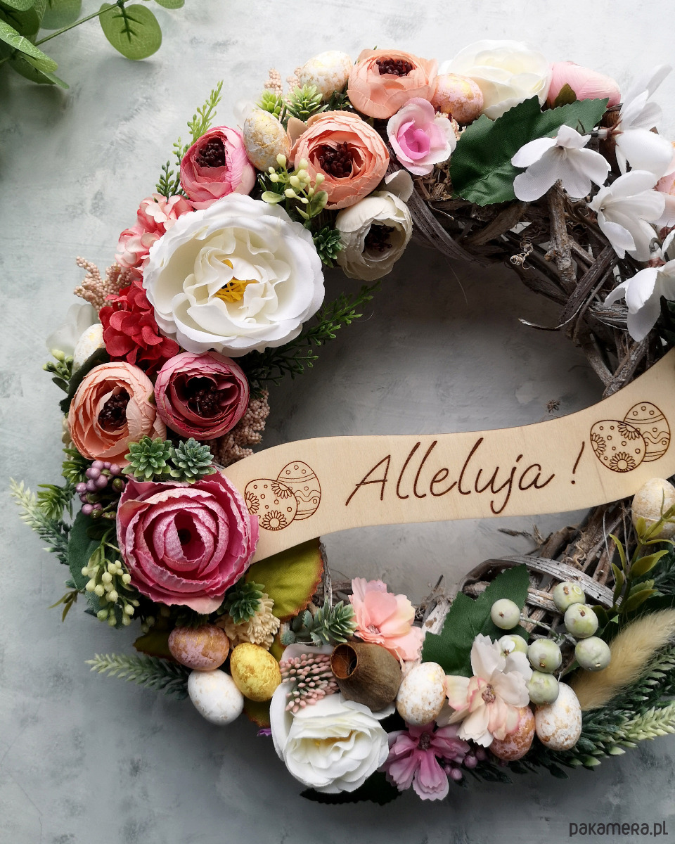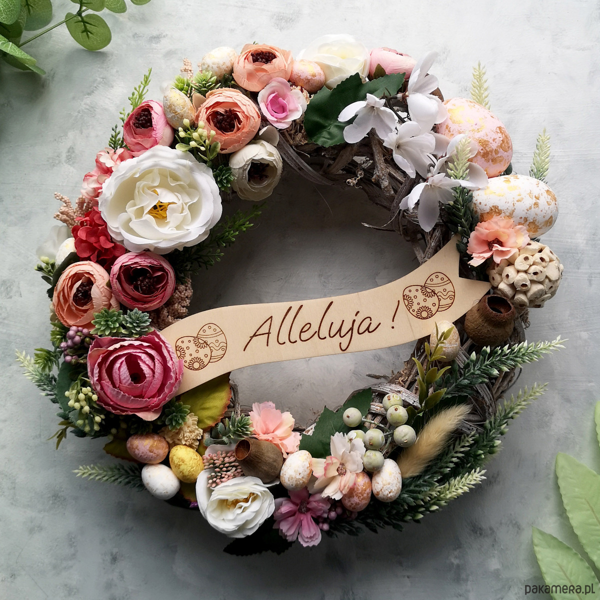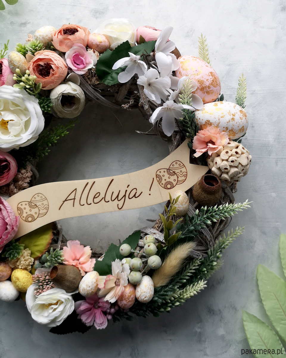 Ten ręcznie wykonany wianek wielkanocny na wiklinowej bazie to idealna dekoracja na drzwi, ścianę lub świąteczny stół. Subtelne pastelowe sztuczne kwiaty, suszone rośliny, eleganckie złocone pisanki oraz drewniana tabliczka z grawerem „Alleluja” tworzą niezwykle harmonijną, wiosenną kompozycję.