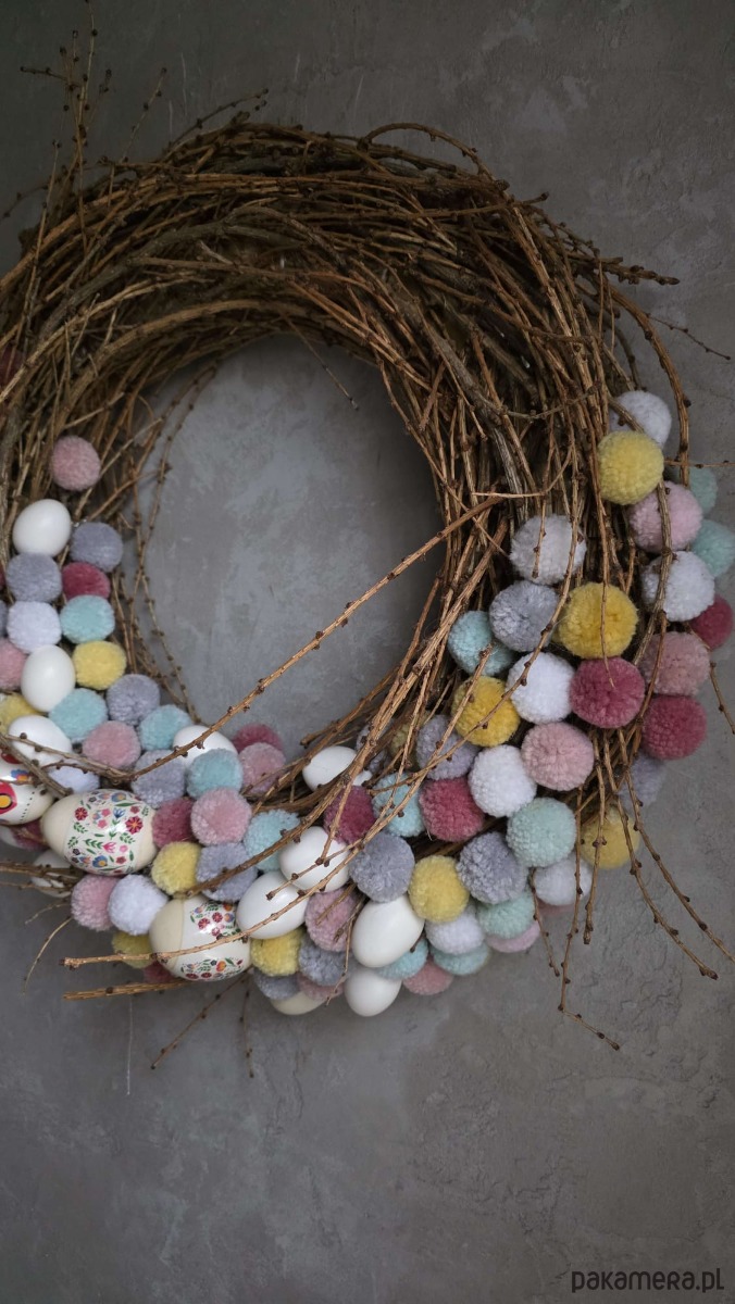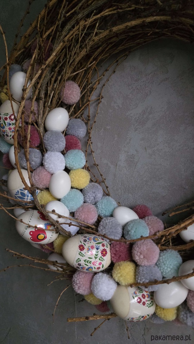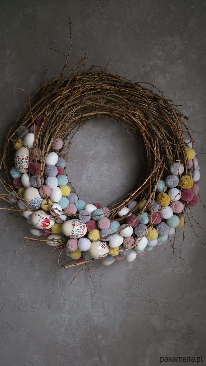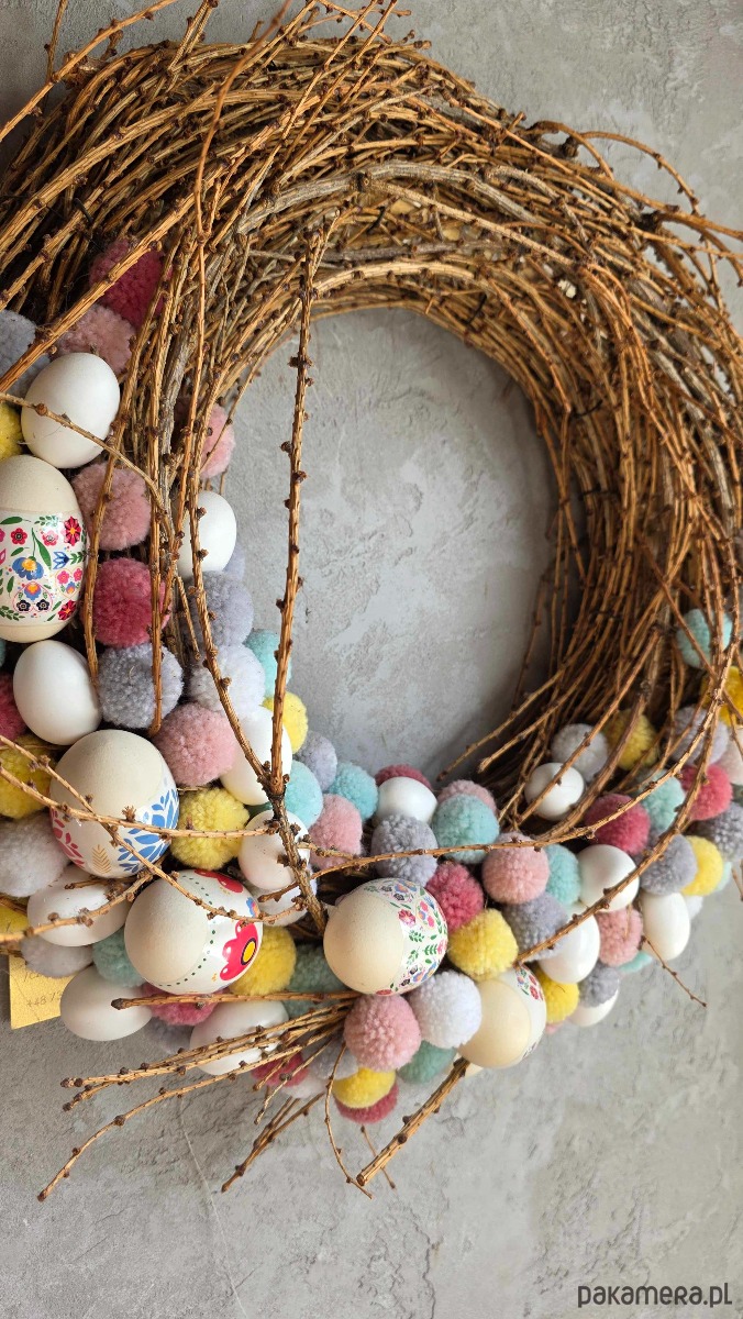 Całość dopełniają harmonijnie dobrane kolory i starannie rozmieszczone detale, tworząc lekką, wiosenną kompozycję inspirowaną naturą. To dekoracja, która łączy tradycję z naturalnym pięknem i ręcznym rzemiosłem.
