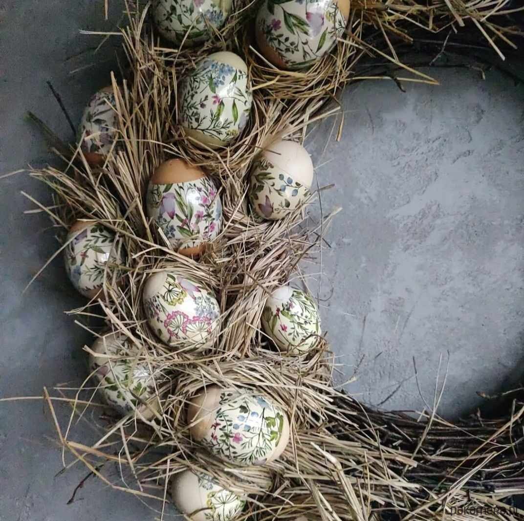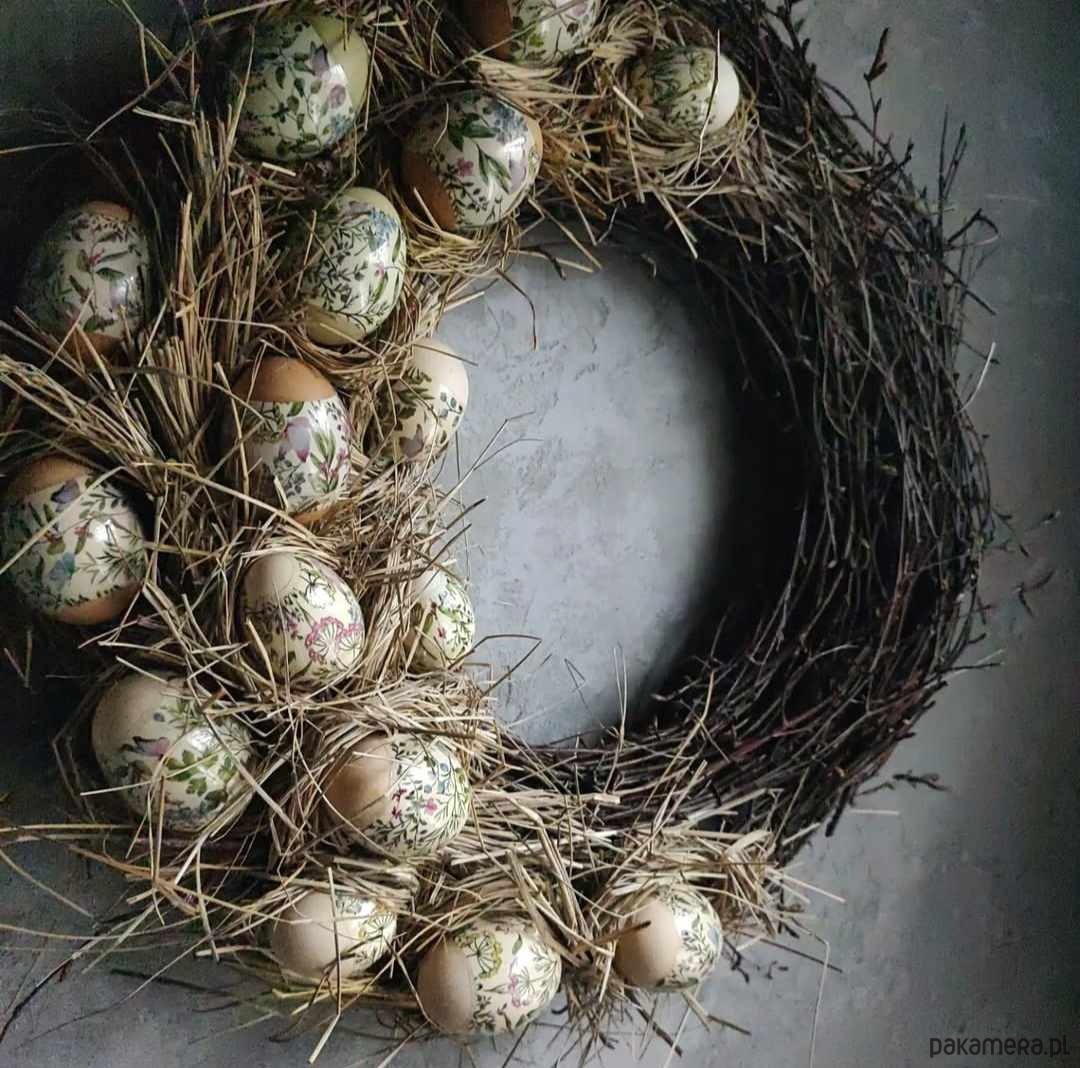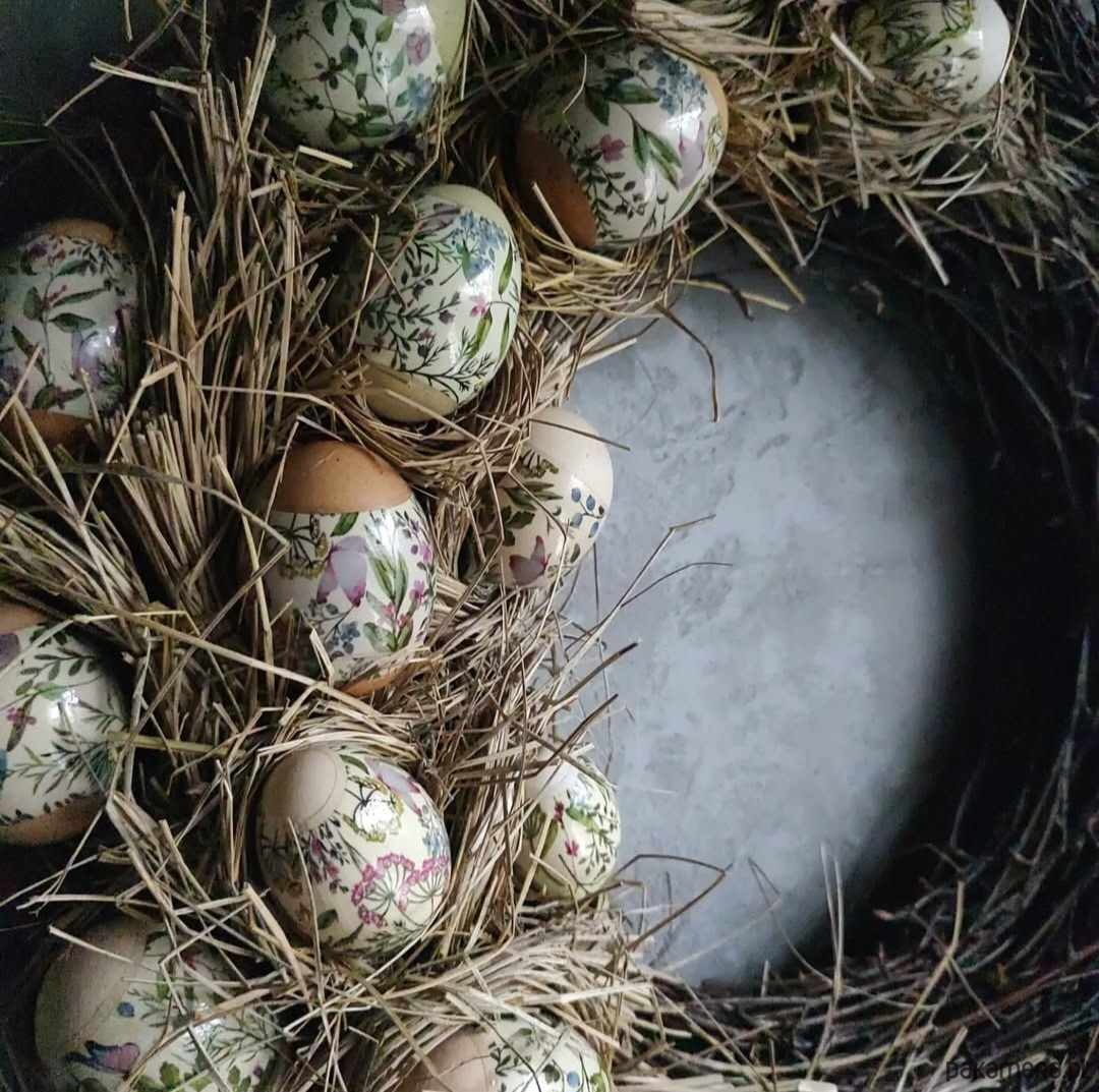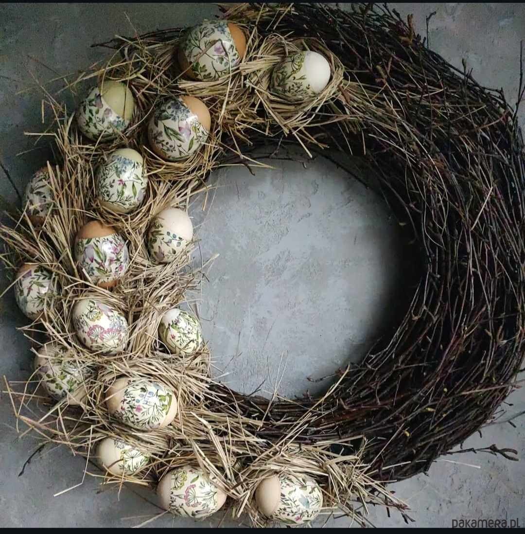 W kompozycji wykorzystano prawdziwe wydmuszki jaj subtelnie zdobione delikatnymi motywami roślinnymi. Każde jajko jest starannie przygotowane i umieszczone w naturalnym sianie, co podkreśla autentyczność oraz niepowtarzalność dekoracji.