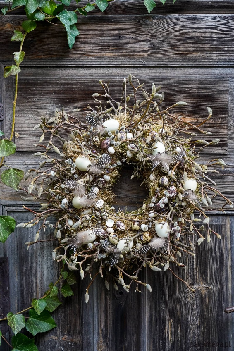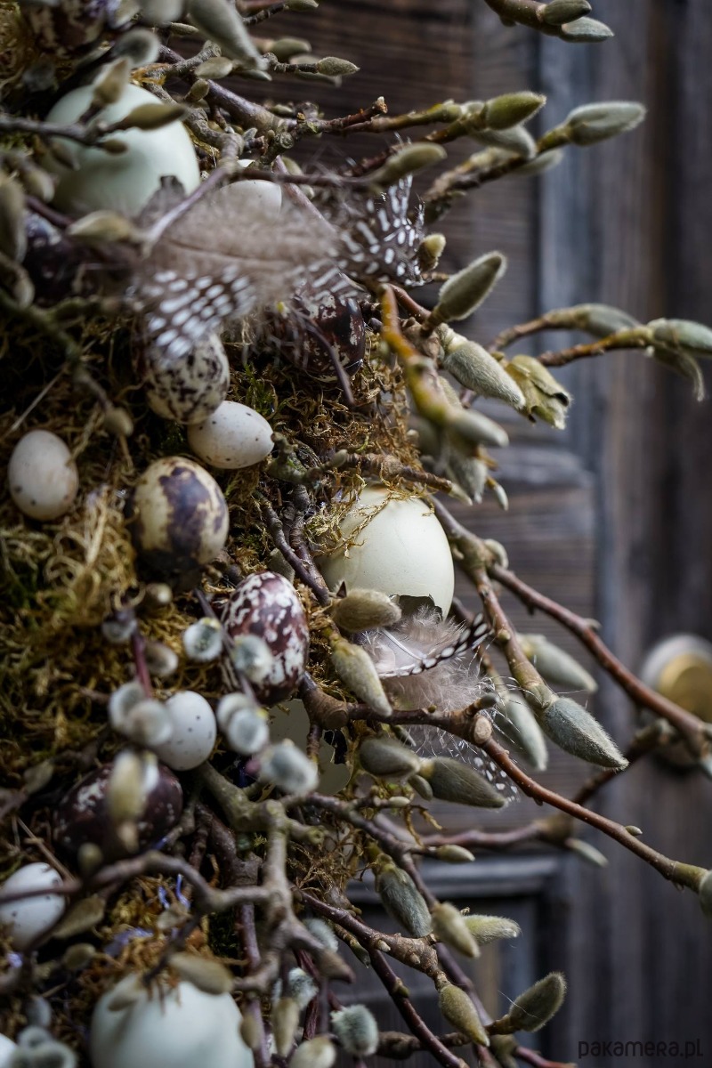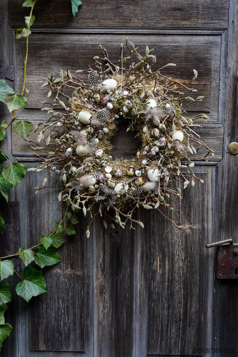 Wianek zrobiony z gałązek wierzby bazi ,magnolii , jajek , mchu