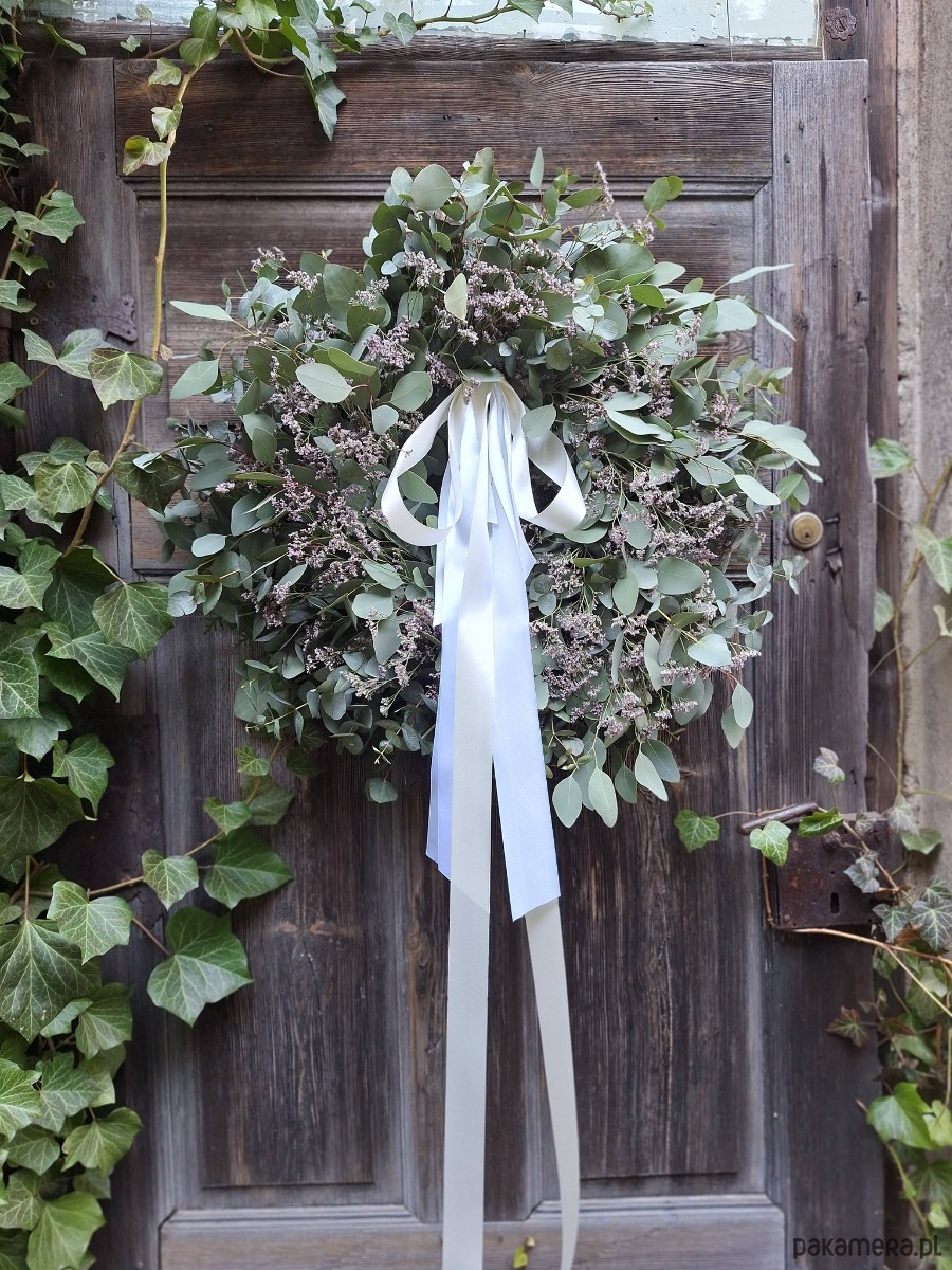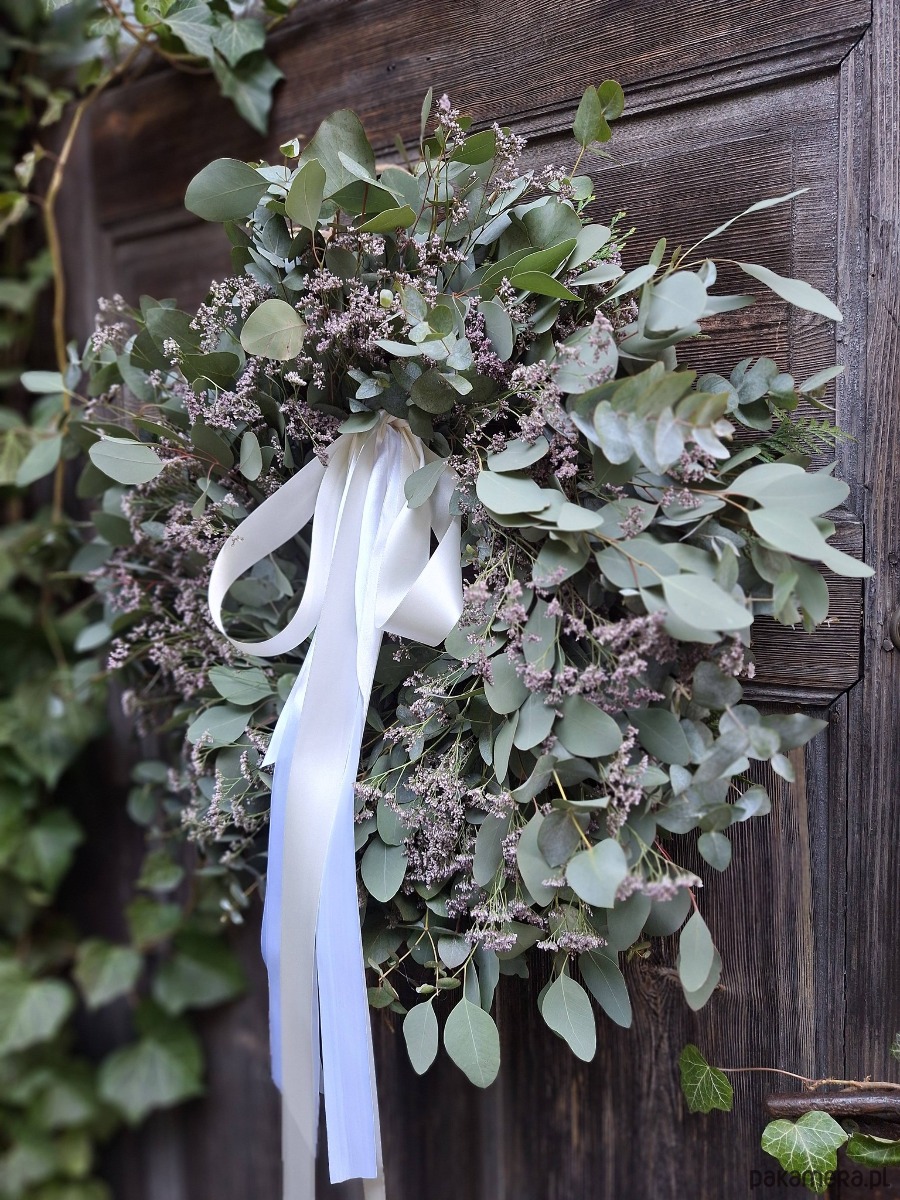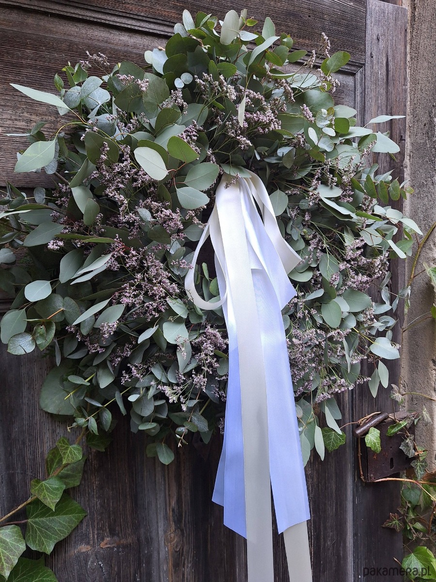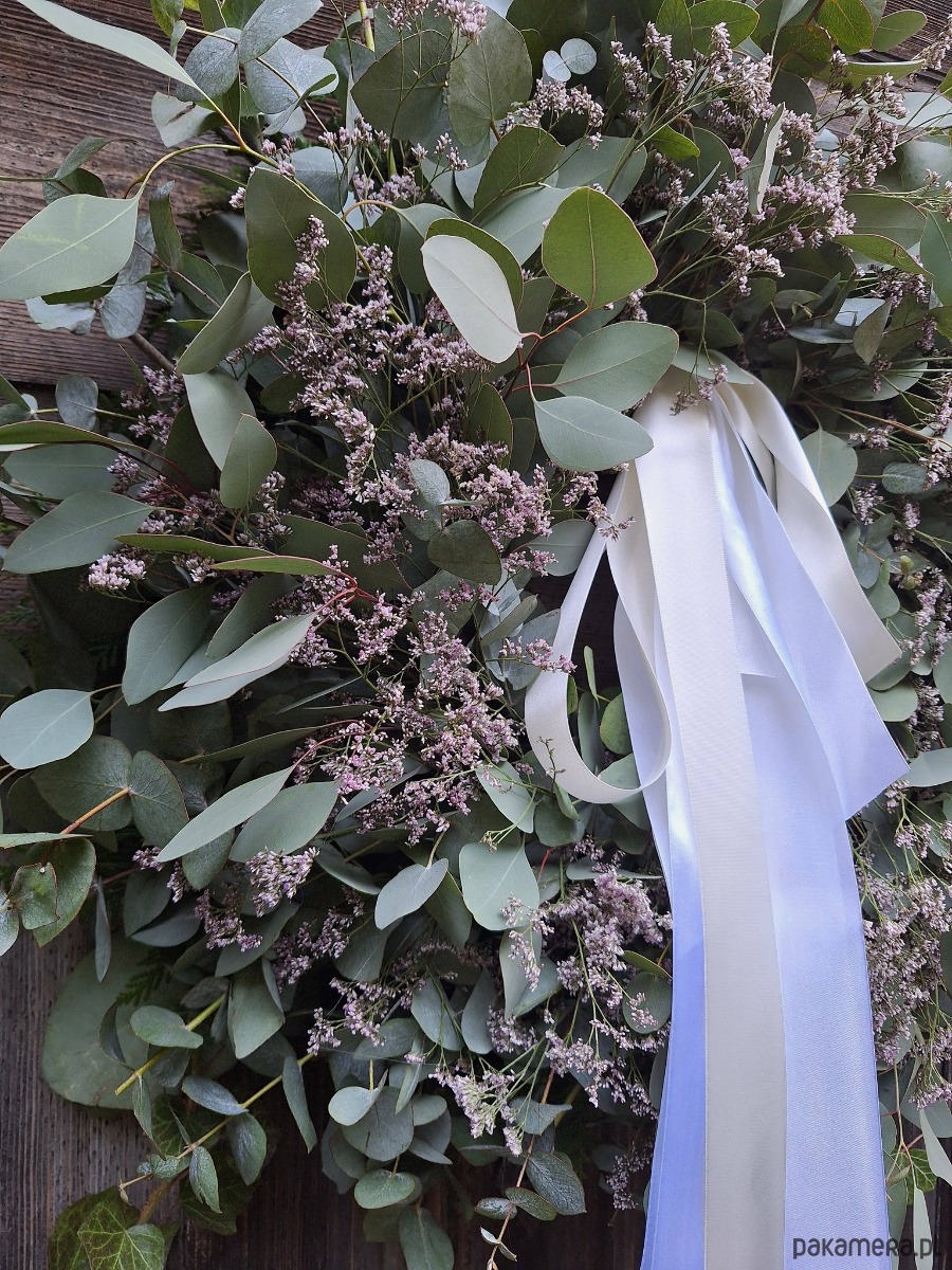 Wianek zrobiony z gałązek eukaliptusa i filetowego limonium białą długą wstążką