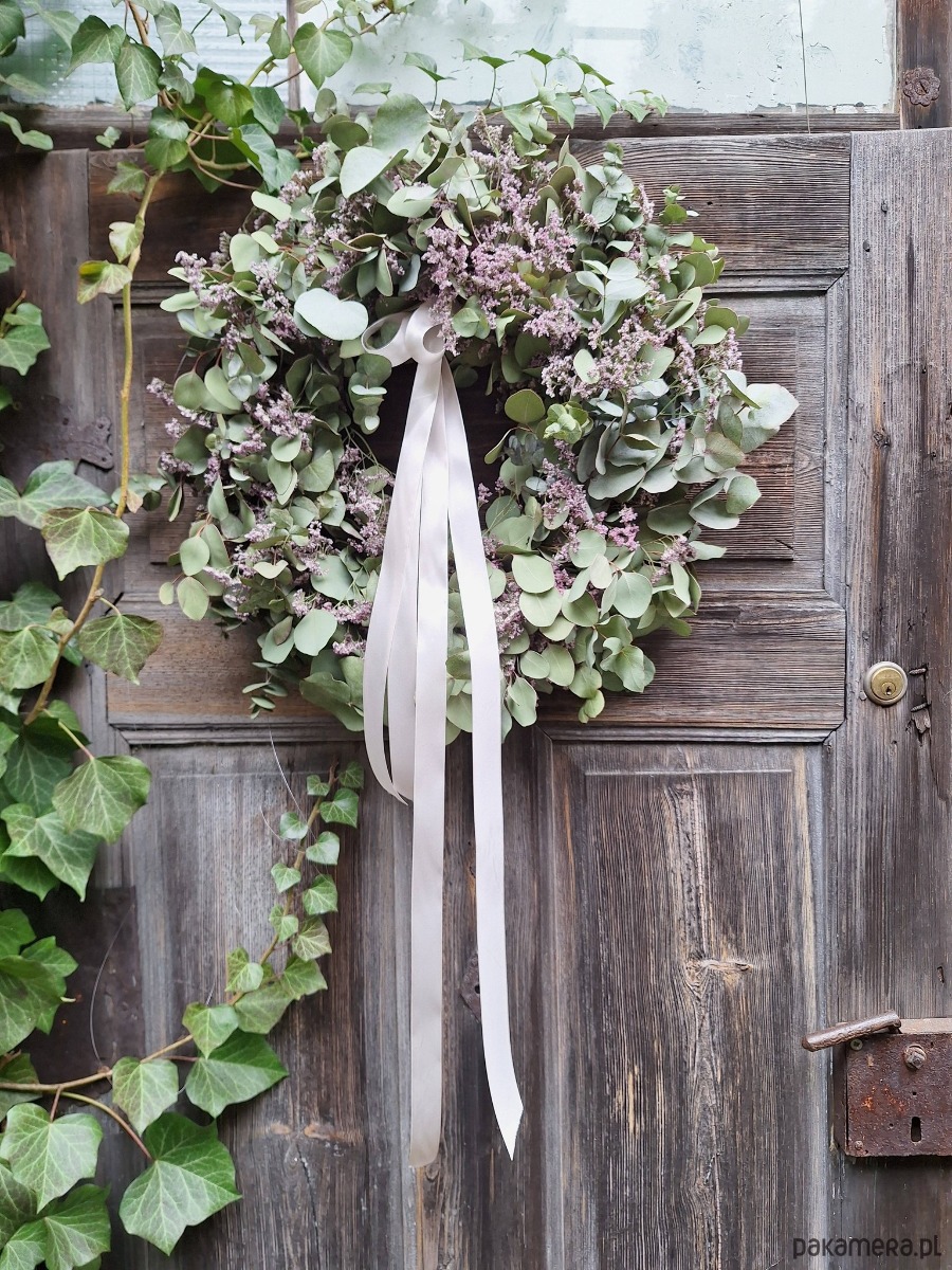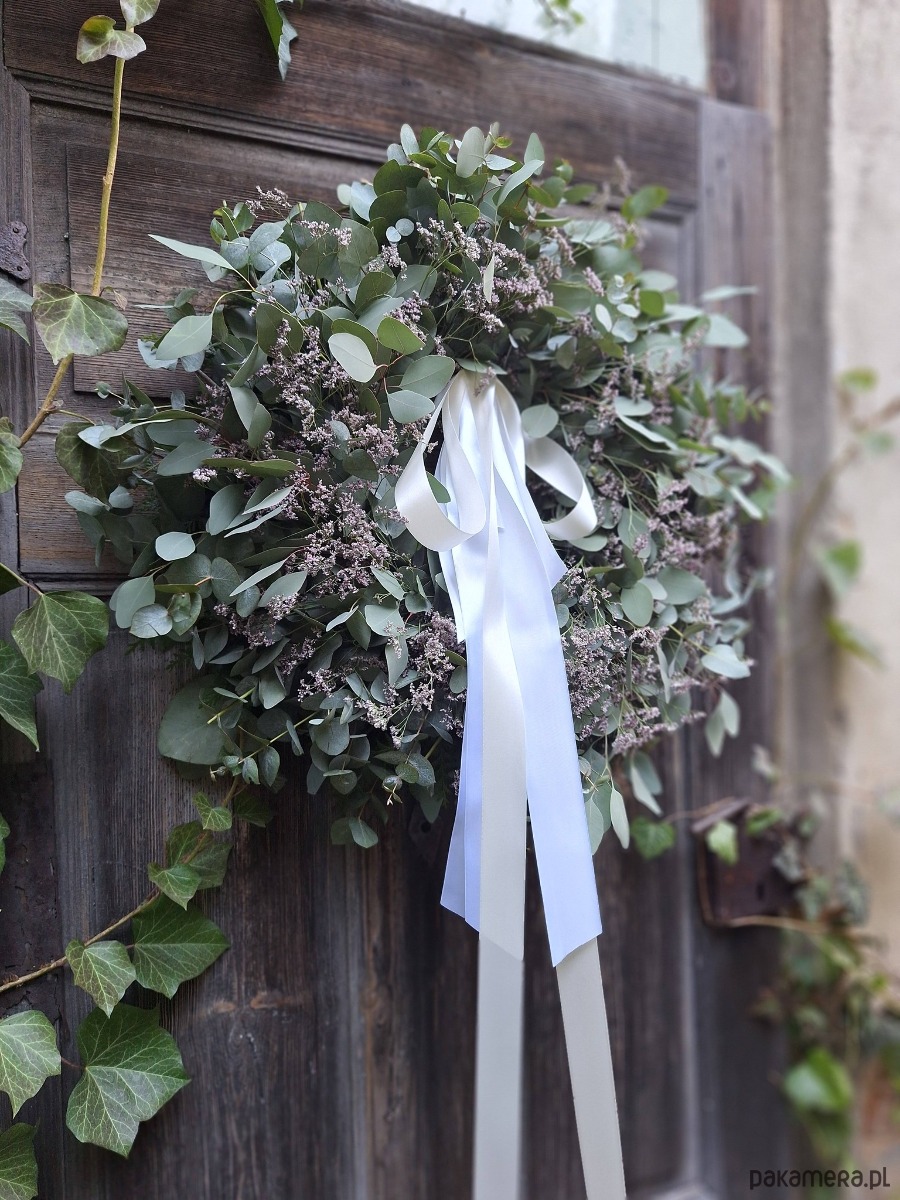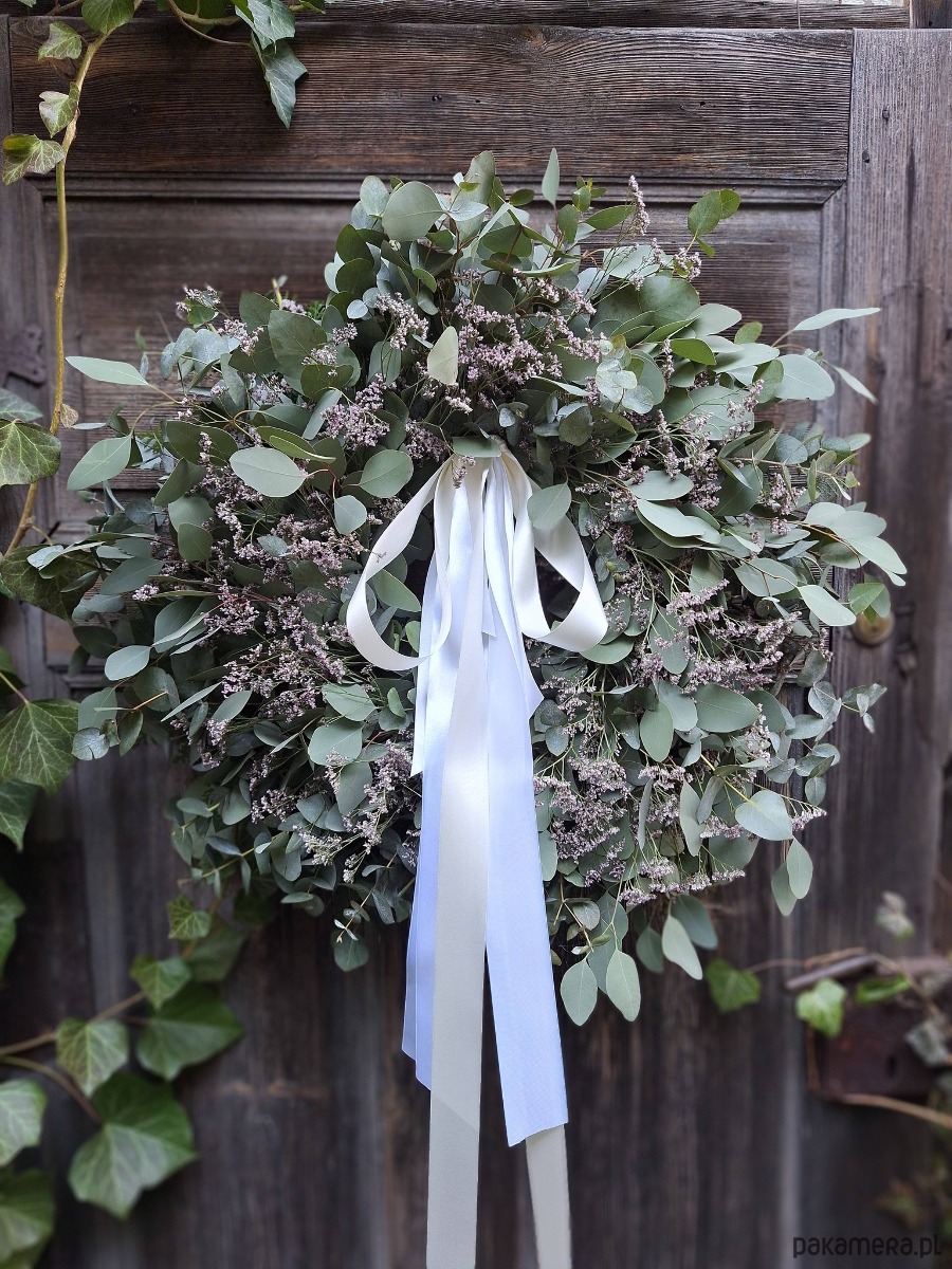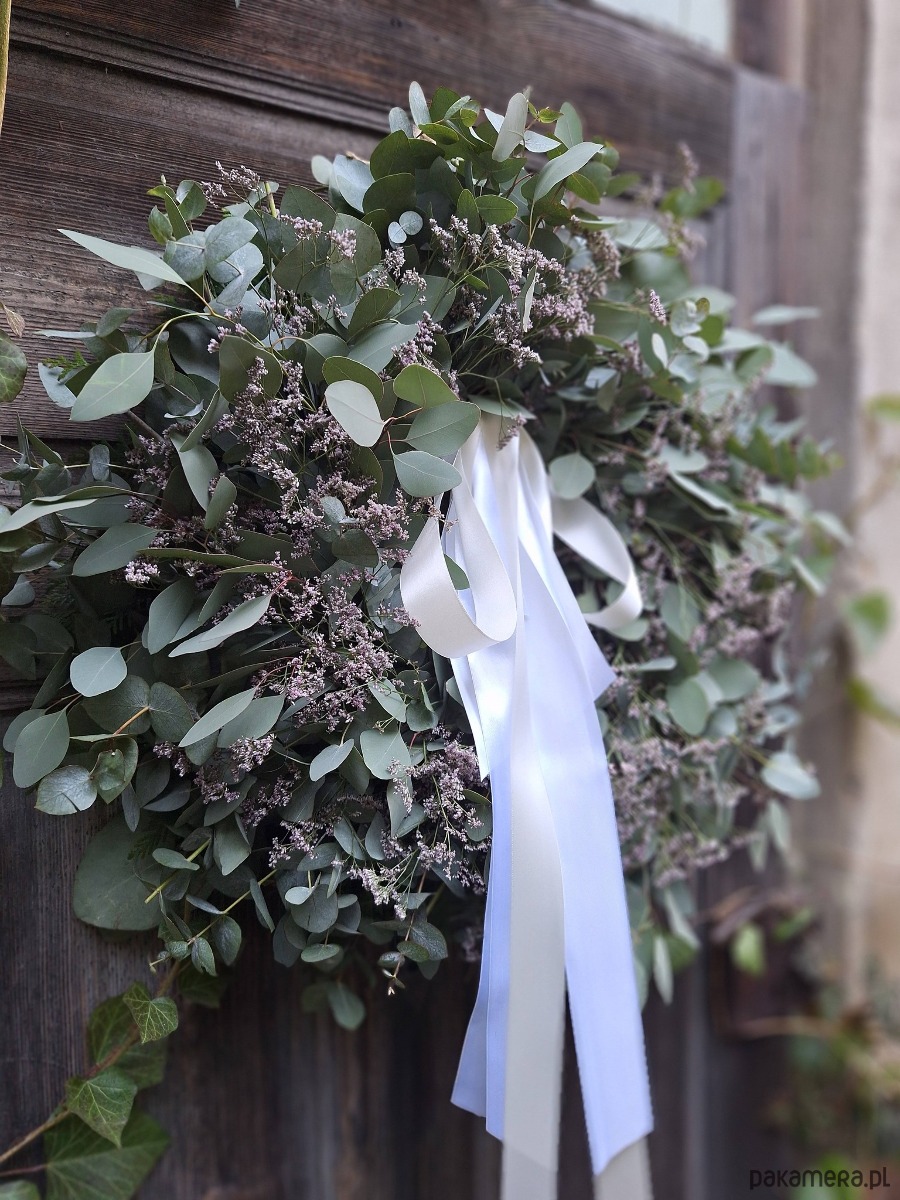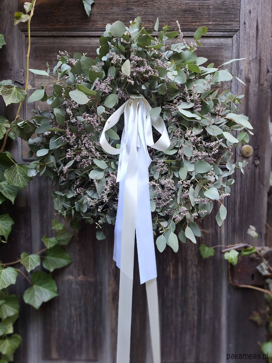 Wianek zrobiony z gałązek eukaliptusa i filetowego limonium białą długą wstążką