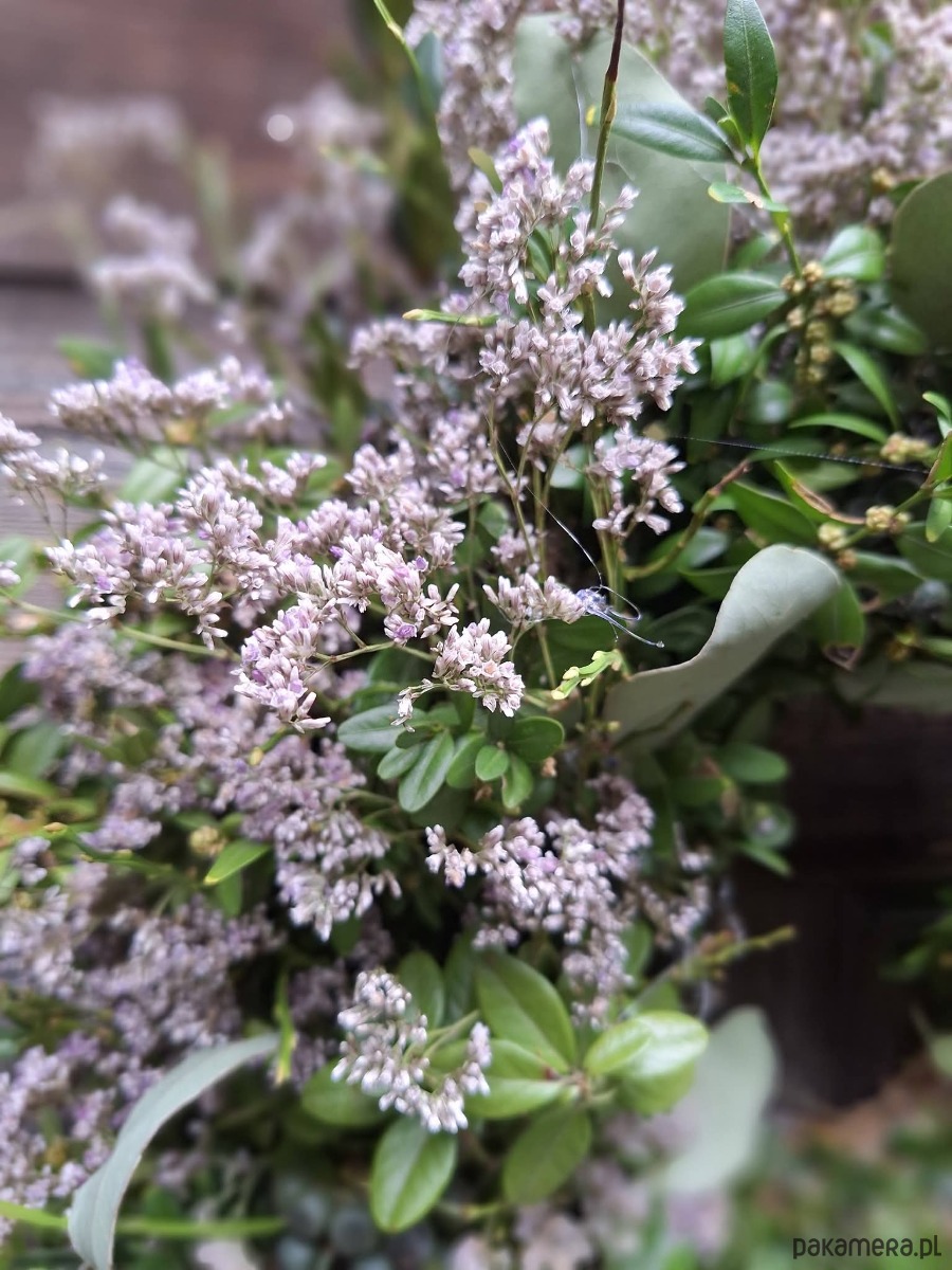 Wianek zrobiony z gałązek jagodowych , borówkowych i świeżego limonium,bukszpanu,liści eukaliptusa