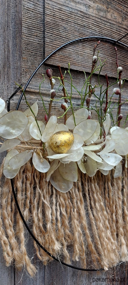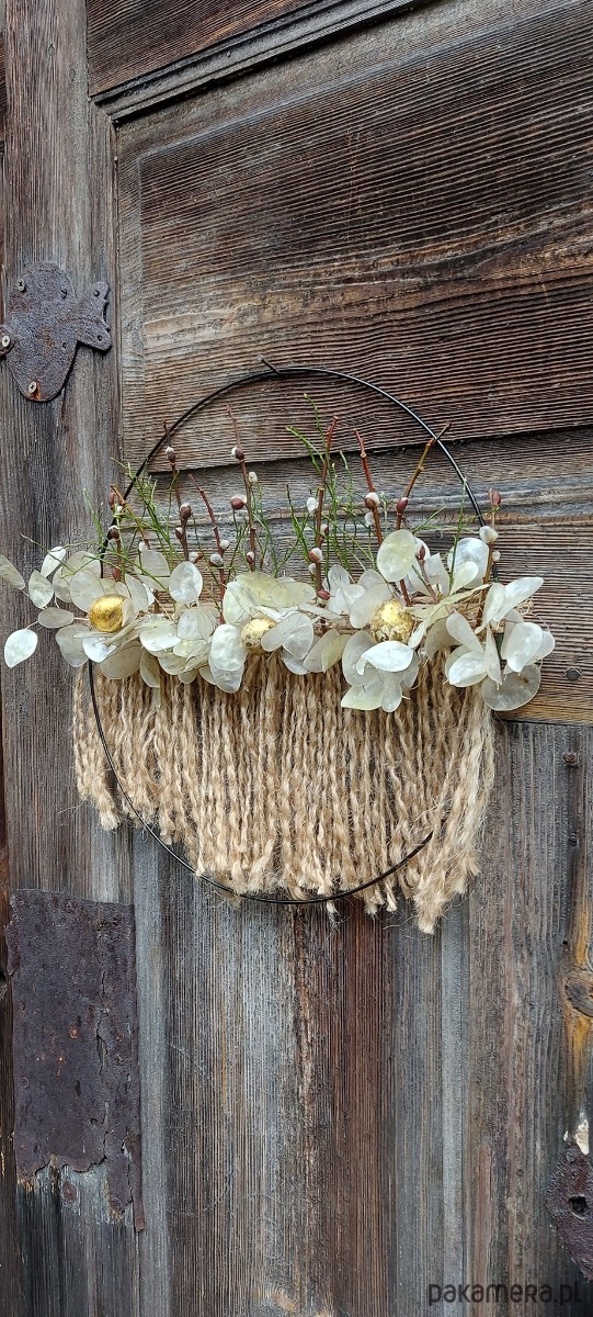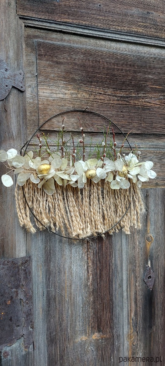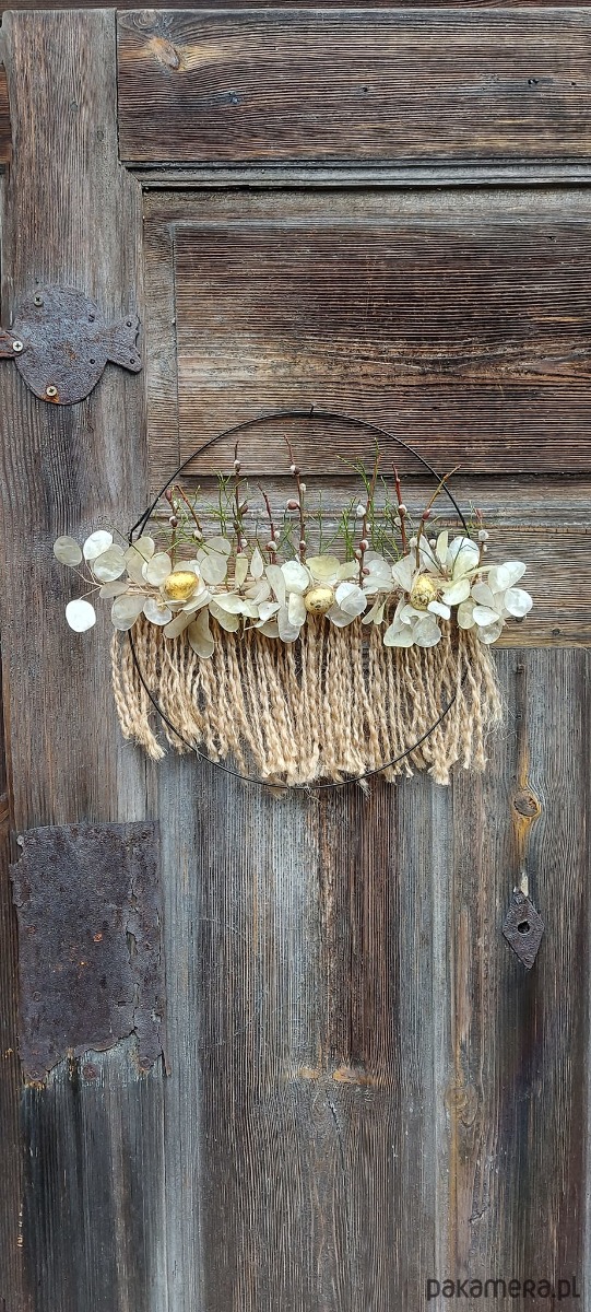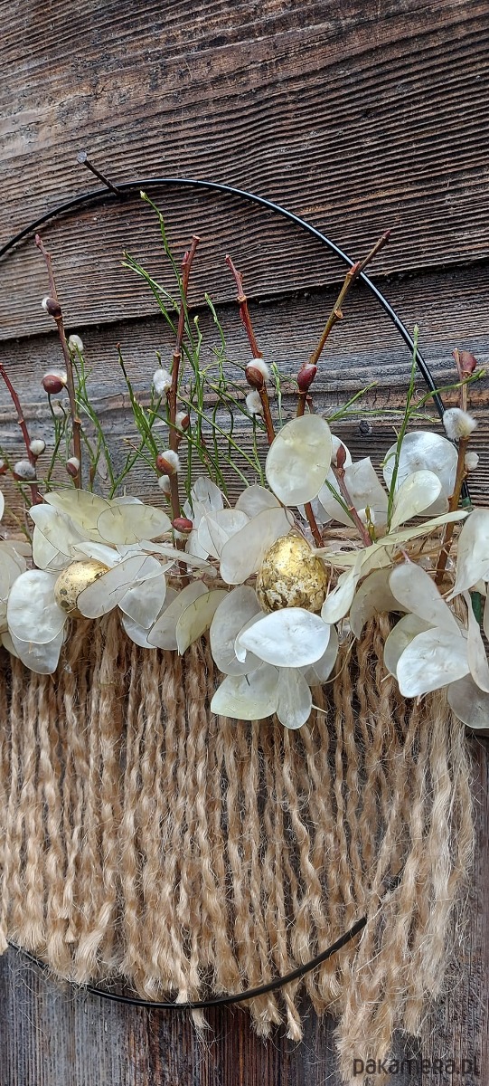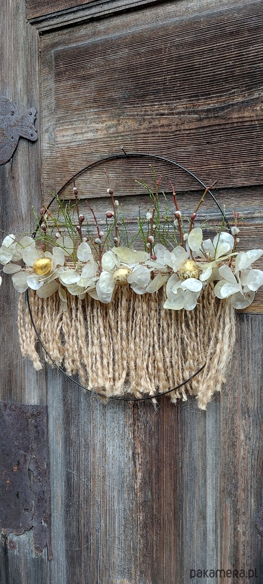 Wianek ,dekoracja ,zrobiona ze sznurka , bazi, gałązek jagody, jajek przepiórczych , miesiącznicy