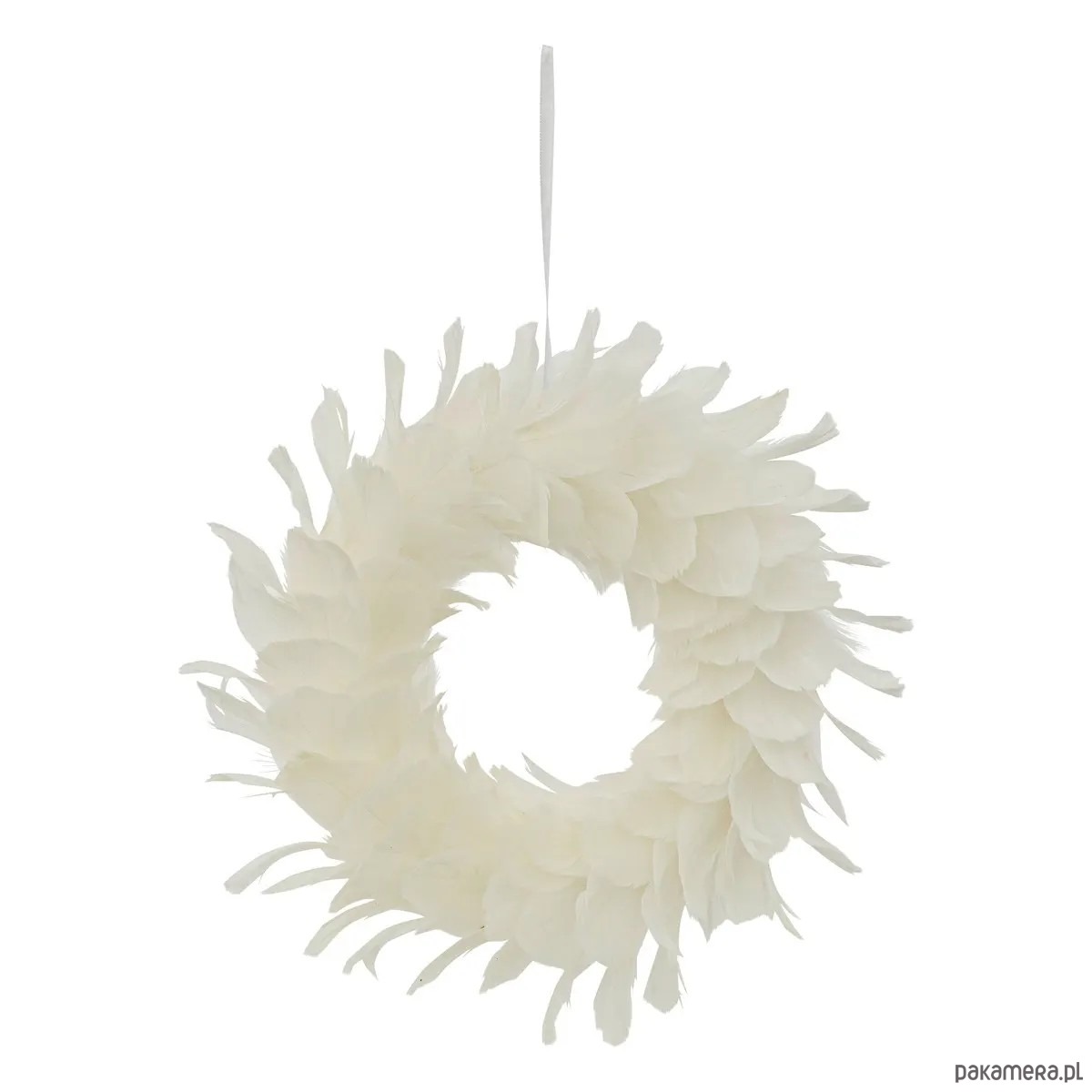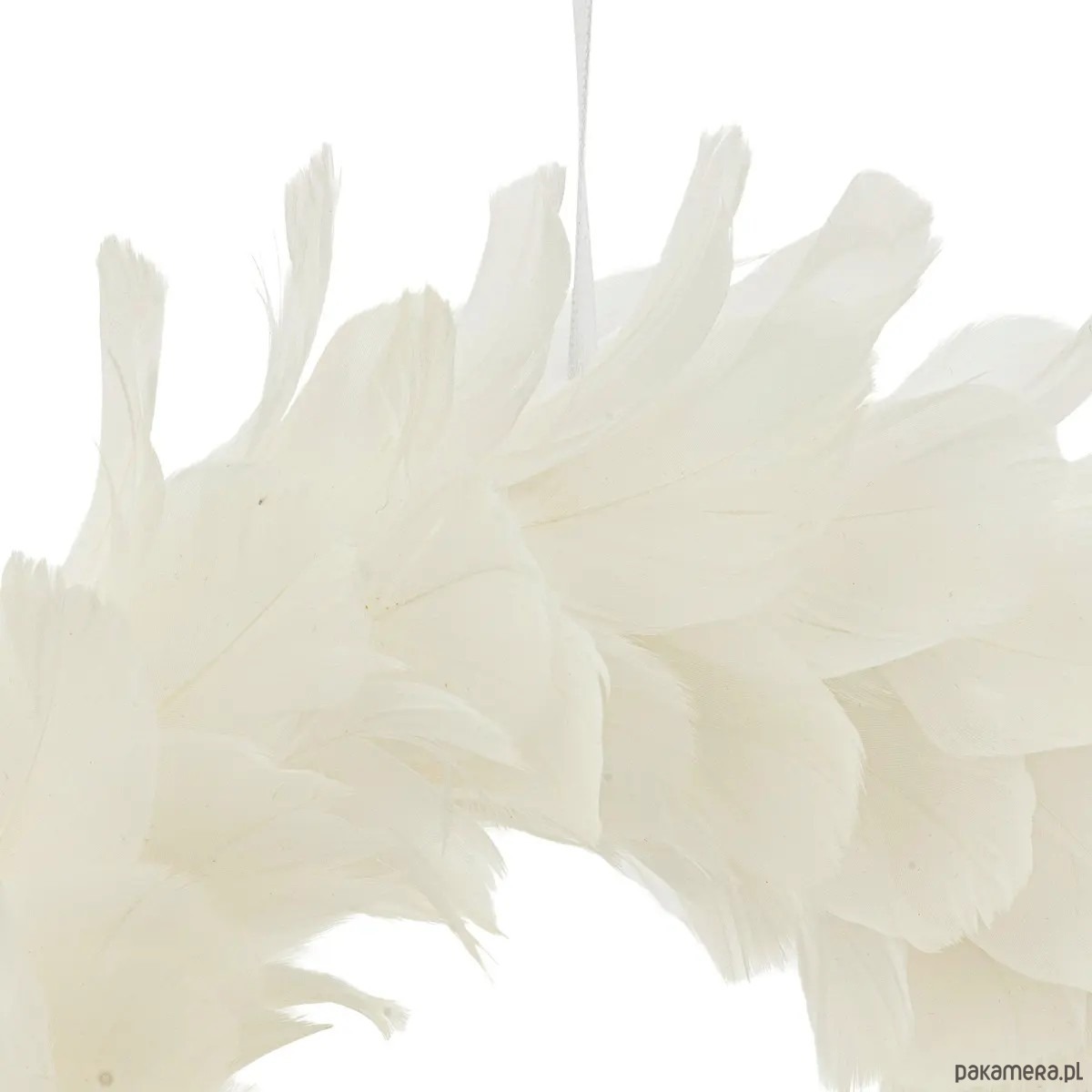 Wianek wykonany z prawdziwych gęsich piór. W kolorze kremowym. Posiada zawieszkę do zawieszenia.