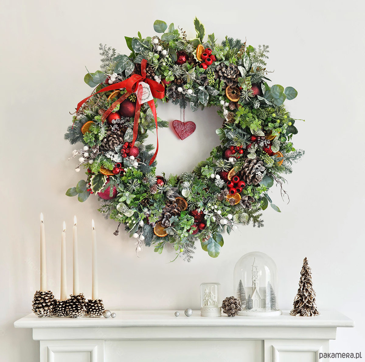 Wianek tej wielkości pięknie będzie się prezentował nad kominkiem lub na dużych drzwiach wejściowych. Może być również piękną, bożonarodzeniową ozdobą sklepowej witryny.