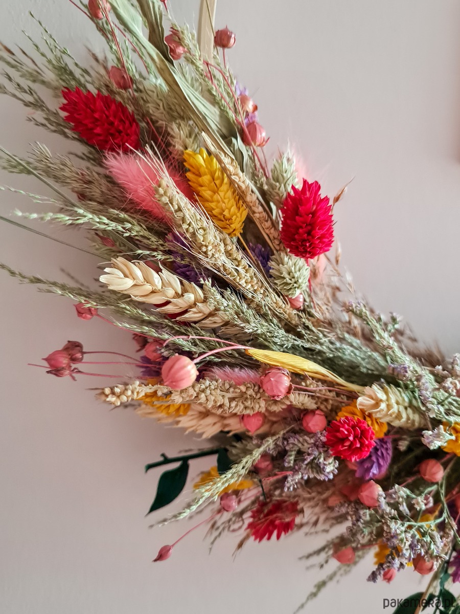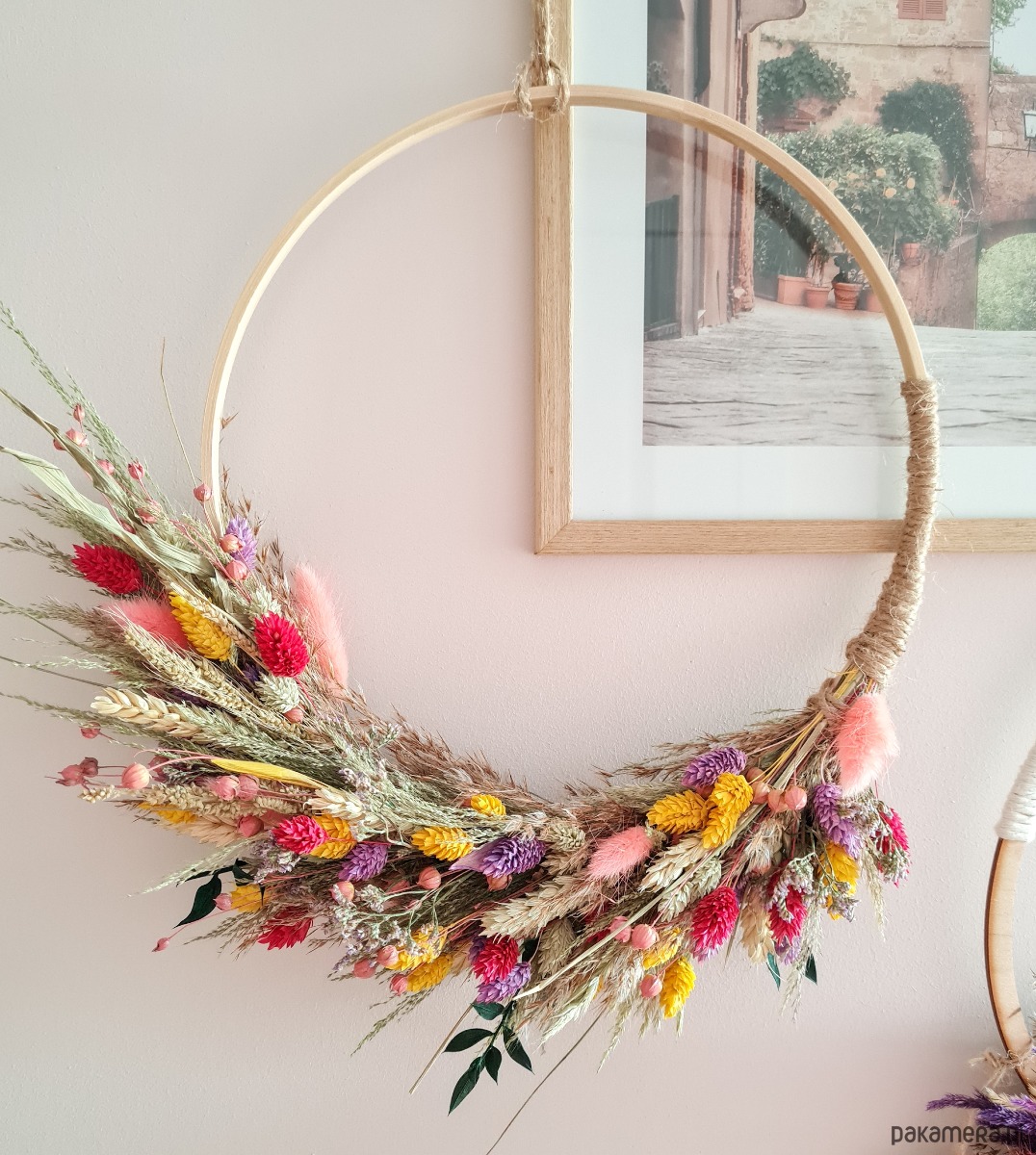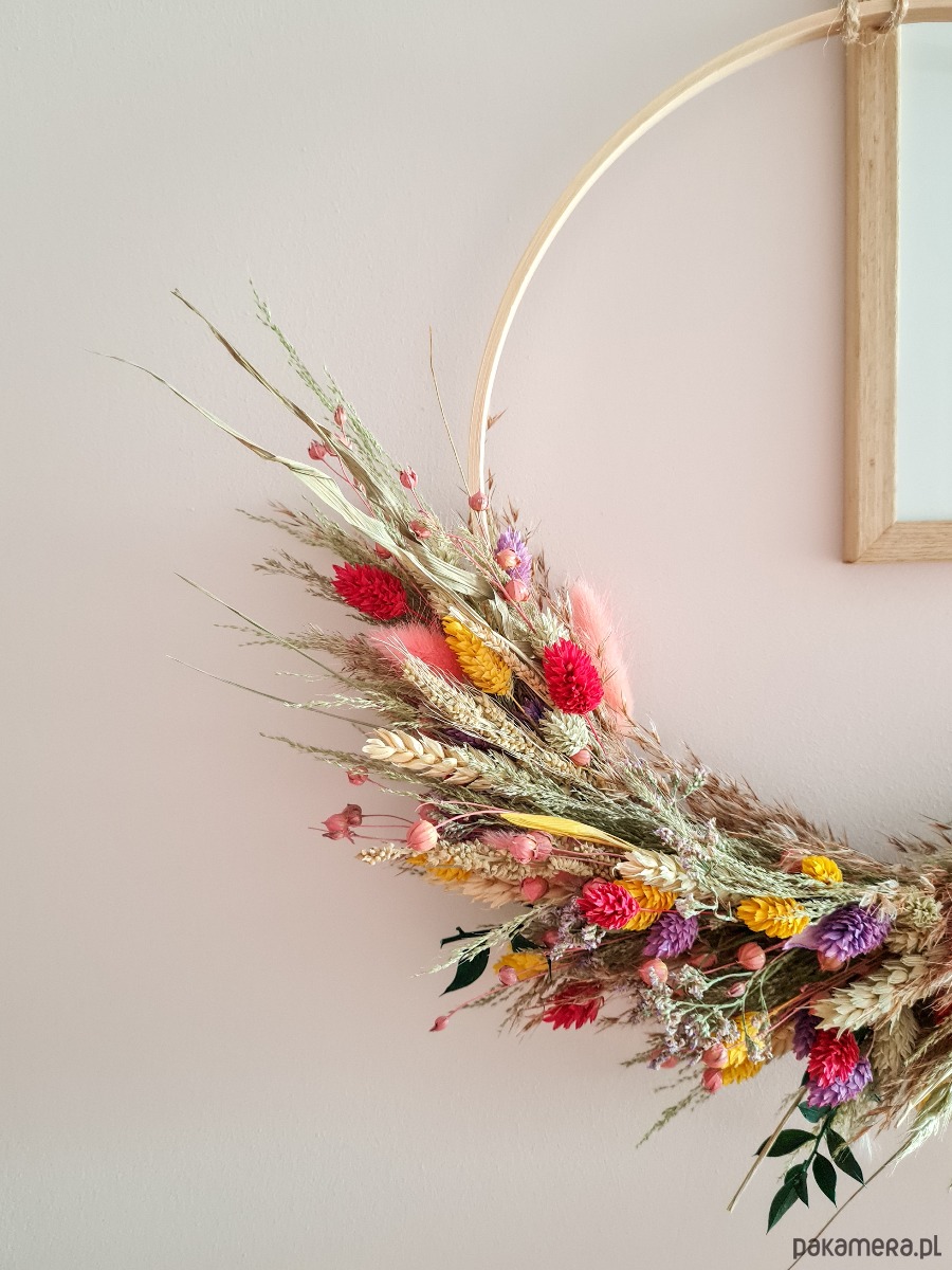 Material: bambusowa obręcz, suszone trawy i kwiaty, naturalny sznurek jutowy.