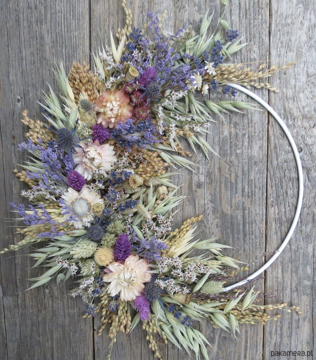Naturalny, mniejszy wianek umocowany na metalowej obręczy o średnicy zewnętrznej około 22-23 cm.