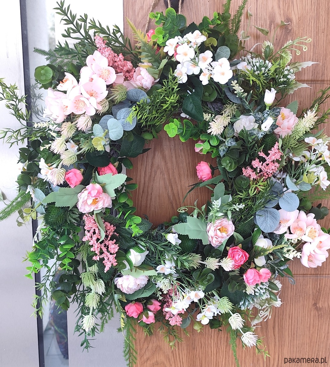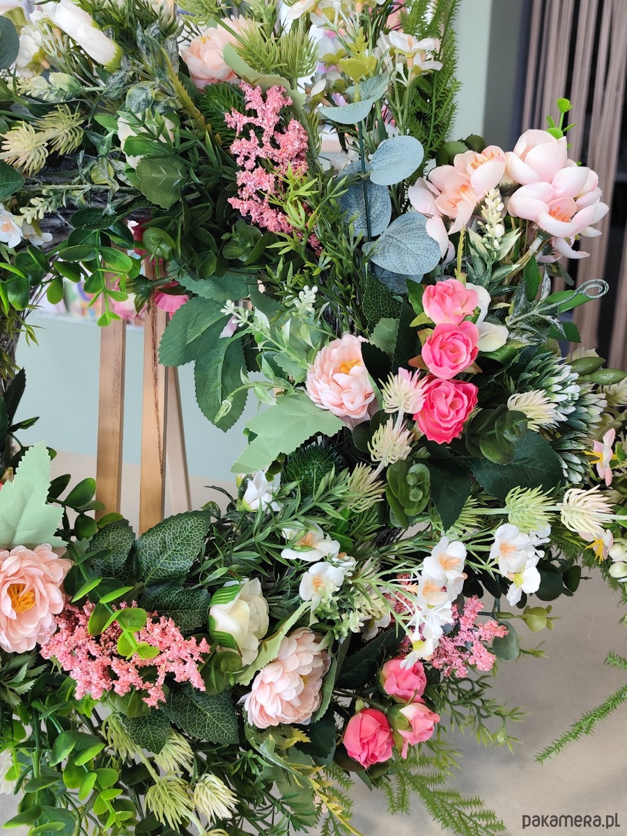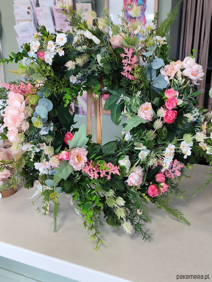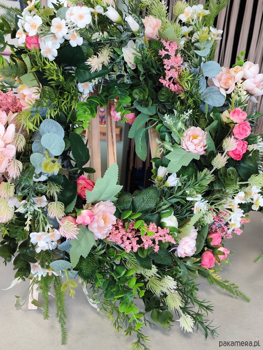 Ręcznie tworzony wianek inspirowany naturą, łączący subtelne odcienie różu, bieli i soczystej zieleni. Bogata kompozycja sztucznych kwiatów premium sprawia, że przyciągają wzrok i nadają przytulnego klimatu.