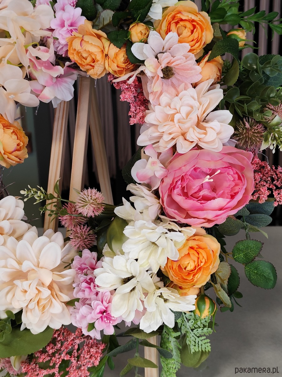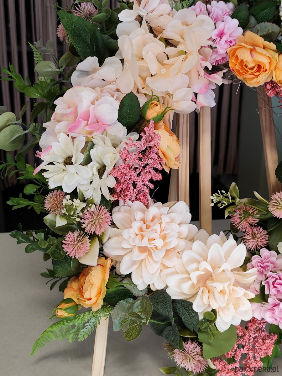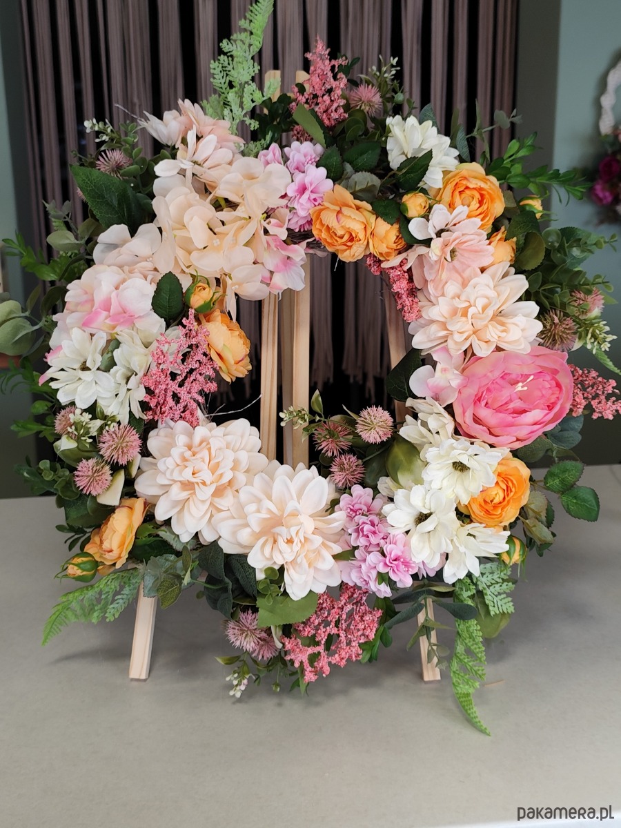 Delikatne kwiaty w odcieniach kremu, różu i i pomarańczy pięknie łączą się z zielenią liści. Wianek jest jasny, świeży i bardzo wiosenny.